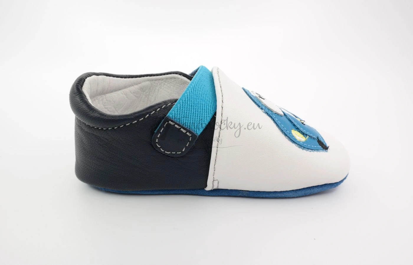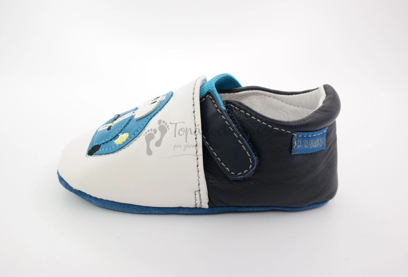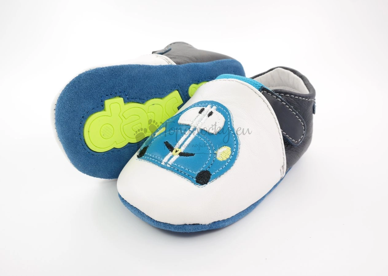 Našuchovacie capačky od výrobcu D.D.Step, ktoré sú vhodné už na prvé kroky. Podošva je tenká, je veľmi pružná a kožená. Je modrej farby. V jej strede sa nachádza gumený nápis D.D.Step, ktorý pôsobí protišmykovo. Zvršok je z hladkej kože. V prednej časti je topánka z bielej kože. Na priehlavku sa nachádza našitá aplikácia auta, modrej farby (viď. obrázok). ZAdná časť topánok je z tmavomodrej kože. Vnútro je tvorené bielou kožou. Vložka je vyberateľná, na prvý pohľad rovná, ale tlakom nožičky sa vytvára "kopček", ktorý podporuje správnu tvorbu klenby. Okolo členka je topánka stiahnutá gumičkou. Gumička má modrú farbu. Na jej konci je suchý zips, ktorého pracka je z tmavomodrej kože.