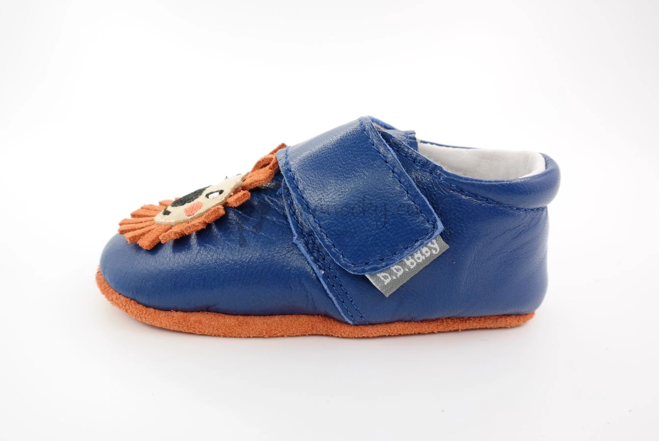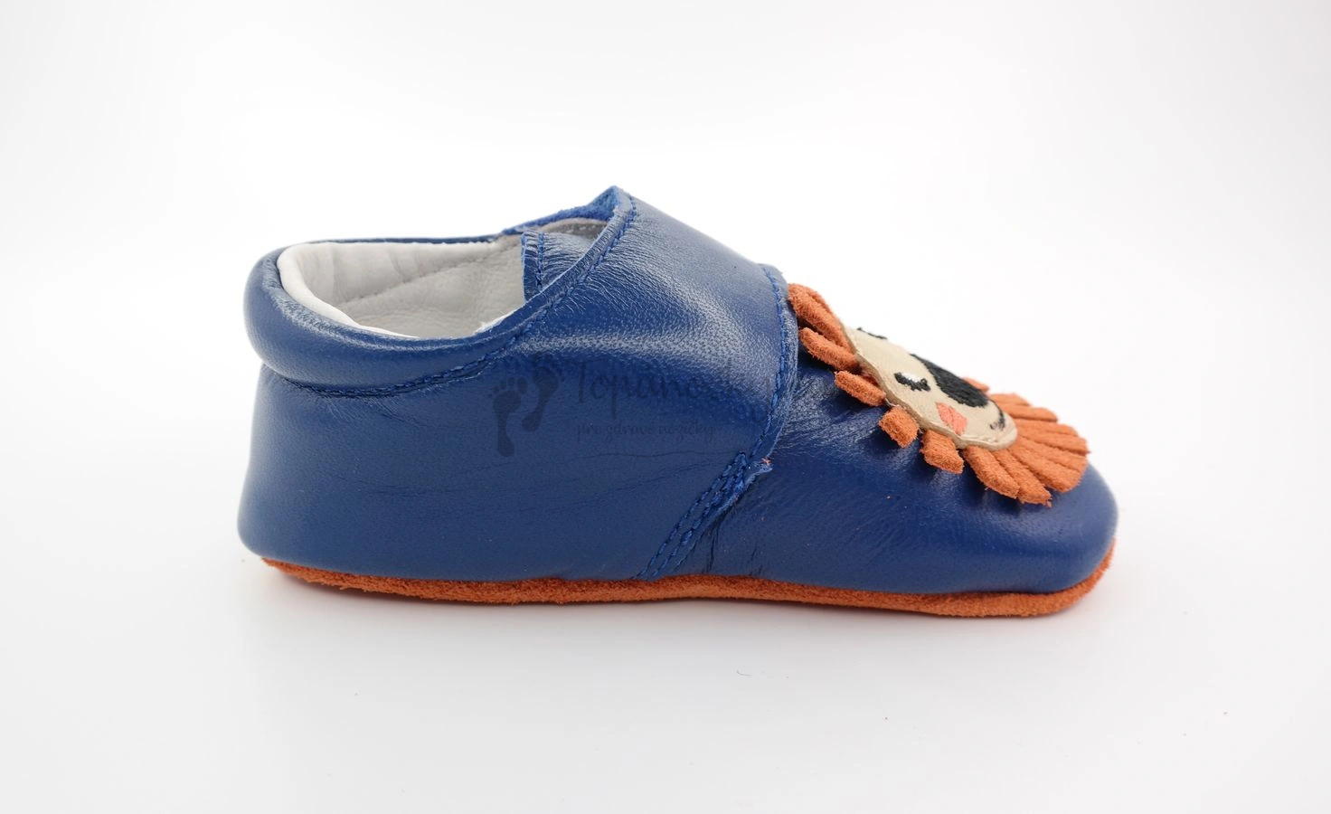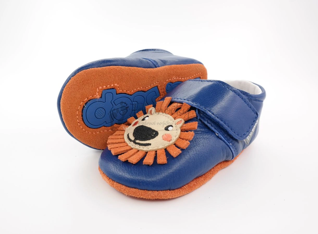 Ľahučké celokožené capačky určené už na prvé pokusy o chôdzu. Podošva týchto topánok je z brúsenej kože oranžovej farby. V strede je gumené logo výrobcu, ktoré plní aj protišmykovú funkciu. Logo je modrej farby. Rovnakú farbu ako logo má aj zvršok topánok. Koža je hladká lícová. Na priehlavku je našitá kožená aplikácia leva. Topánky sa zapínajú na jeden suchý zips. Vnútro je z bielej kože. Stielka je tvorená kombináciou kože a mäkkej peny. Časť, ktorá je v kontakte s chodidlom je kožená. Tlakom chodila na stielku sa vytvára prvok na podporu prirodzeného vývoja klenby. Stielka je aj vyberateľná.