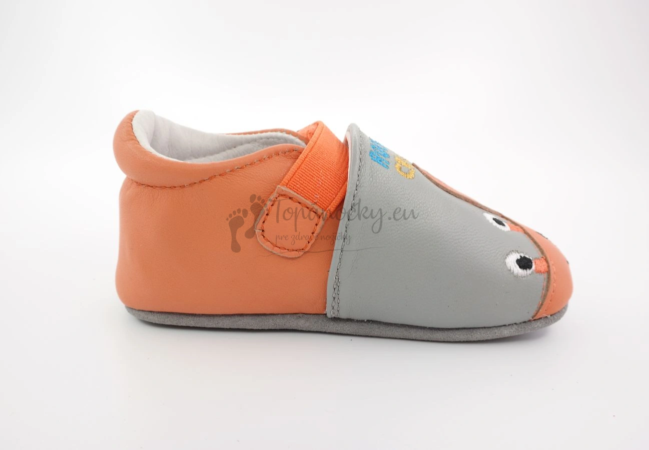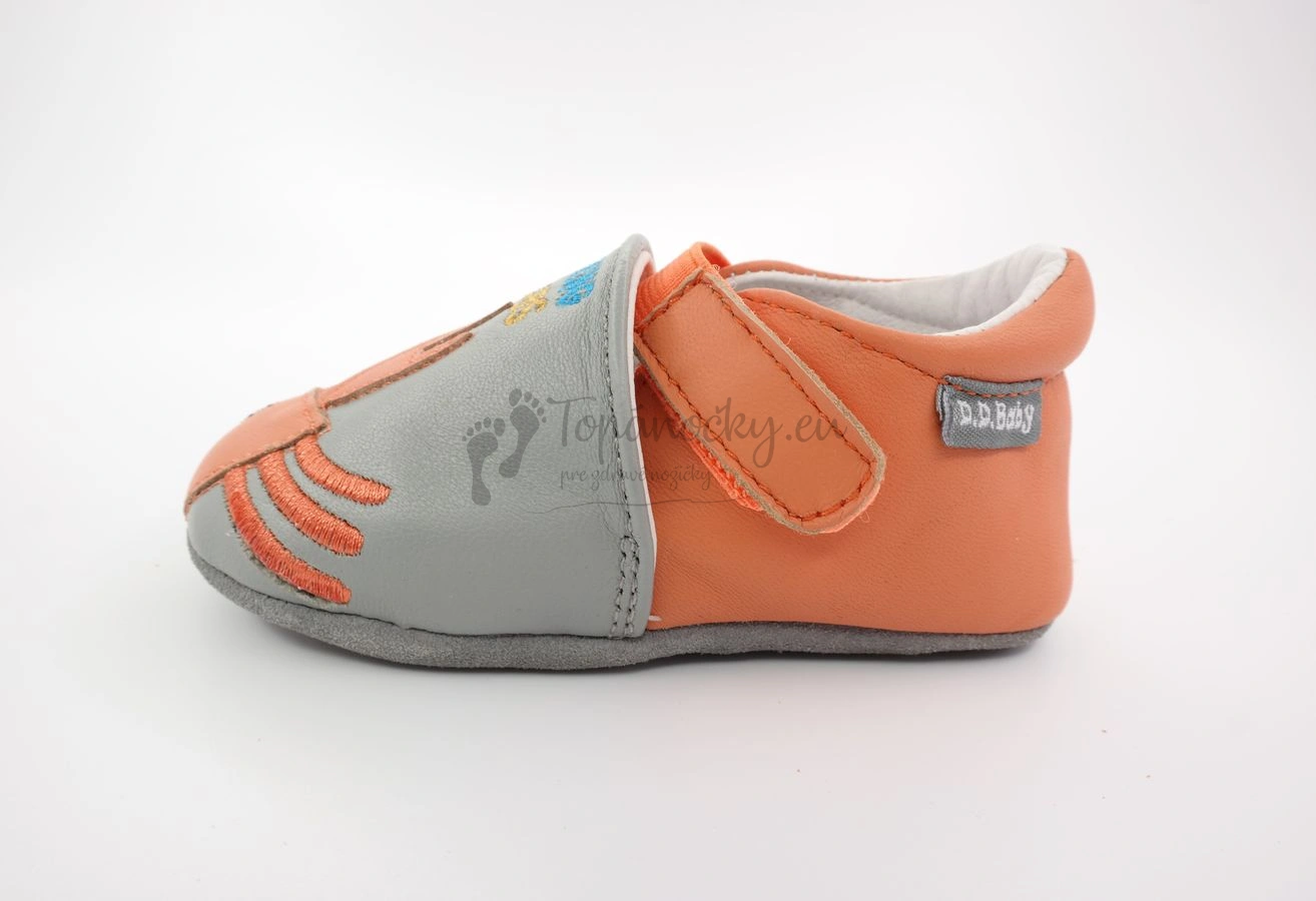 Našuchovacie capačky od výrobcu D.D.Step, ktoré sú vhodné už na prvé kroky. Podošva je tenká, je veľmi pružná a kožená. Je šedej farby. V jej strede sa nachádza gumený nápis D.D.Step, ktorý pôsobí protišmykovo. Zvršok je z hladkej kože. V prednej časti je topánka zo šedej kože. Na priehlavku sa nachádza našitá aplikácia kraba, nad ňou je vyšitý modro-žltý nápis "Rocking crabs" (viď. obrázok). Zadná časť topánok je z oranžovej kože. Vnútro je tvorené bielou kožou. Vložka je vyberateľná, na prvý pohľad rovná, ale tlakom nožičky sa vytvára "kopček", ktorý podporuje správnu tvorbu klenby. Okolo členka je topánka stiahnutá gumičkou. Gumička má oranžovú farbu. Na jej konci je suchý zips, ktorého pracka je taktiež z kože oranžovej farby.