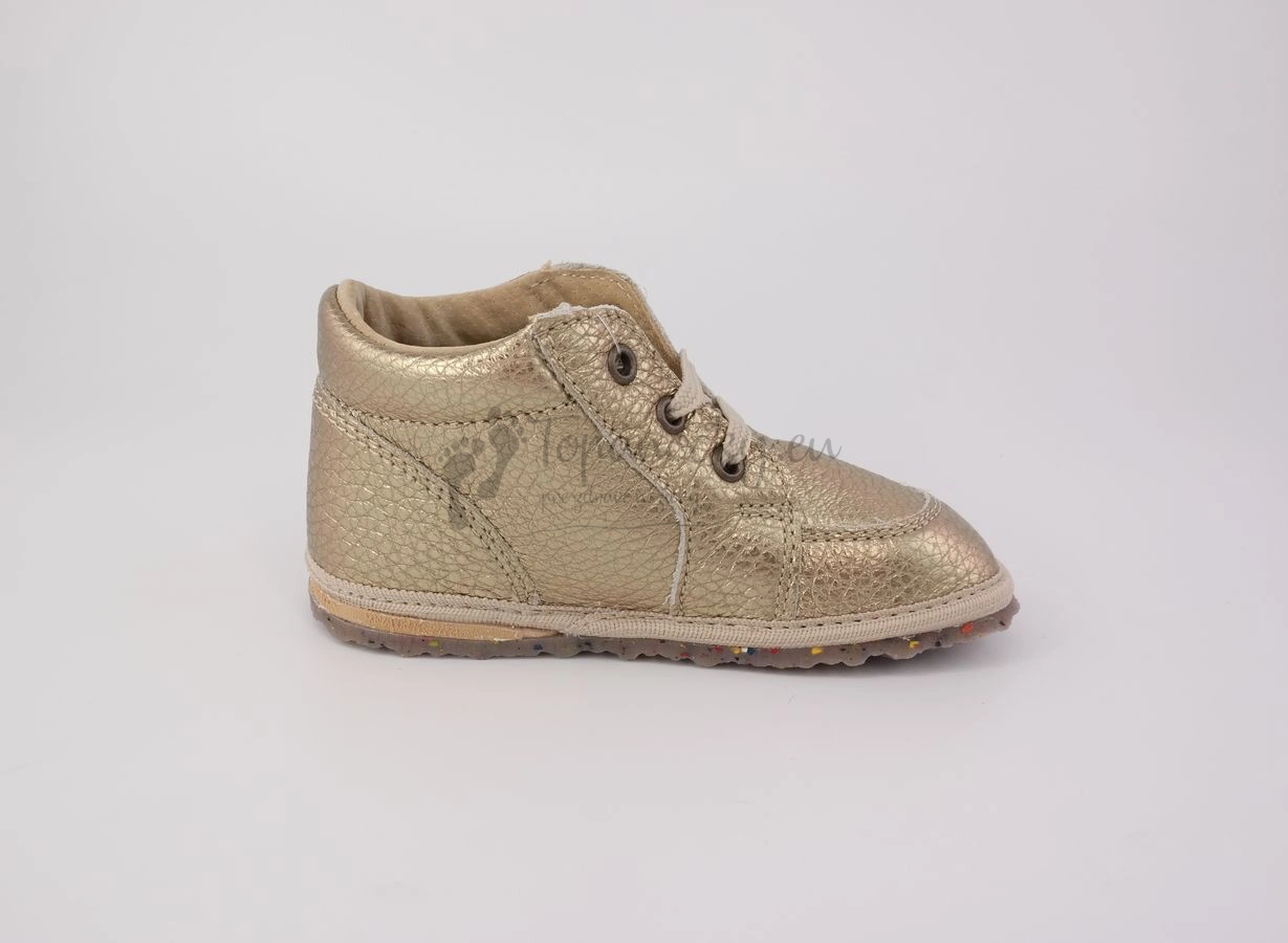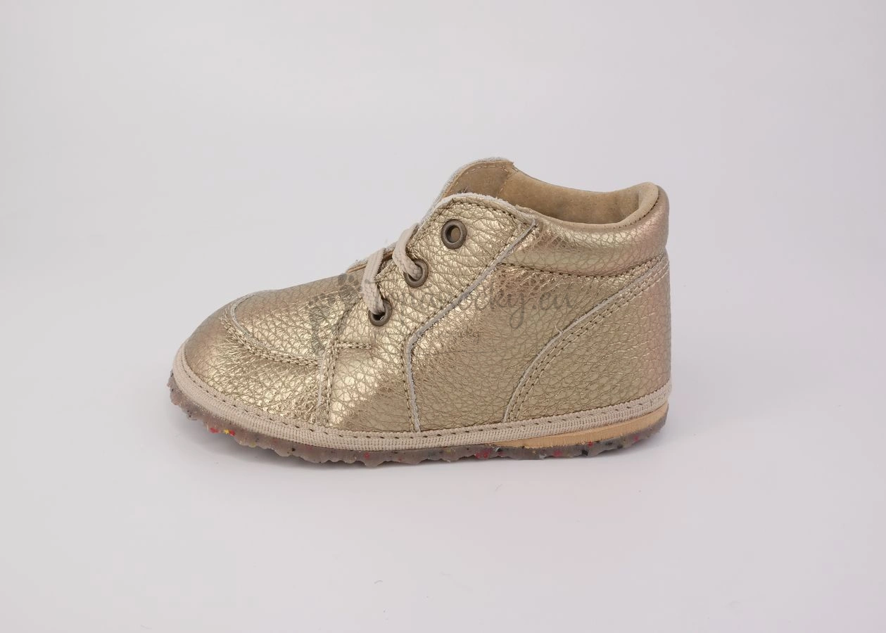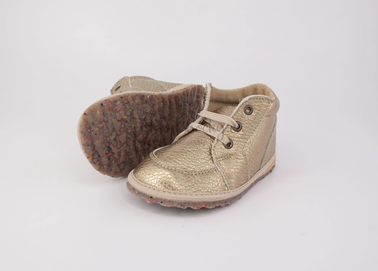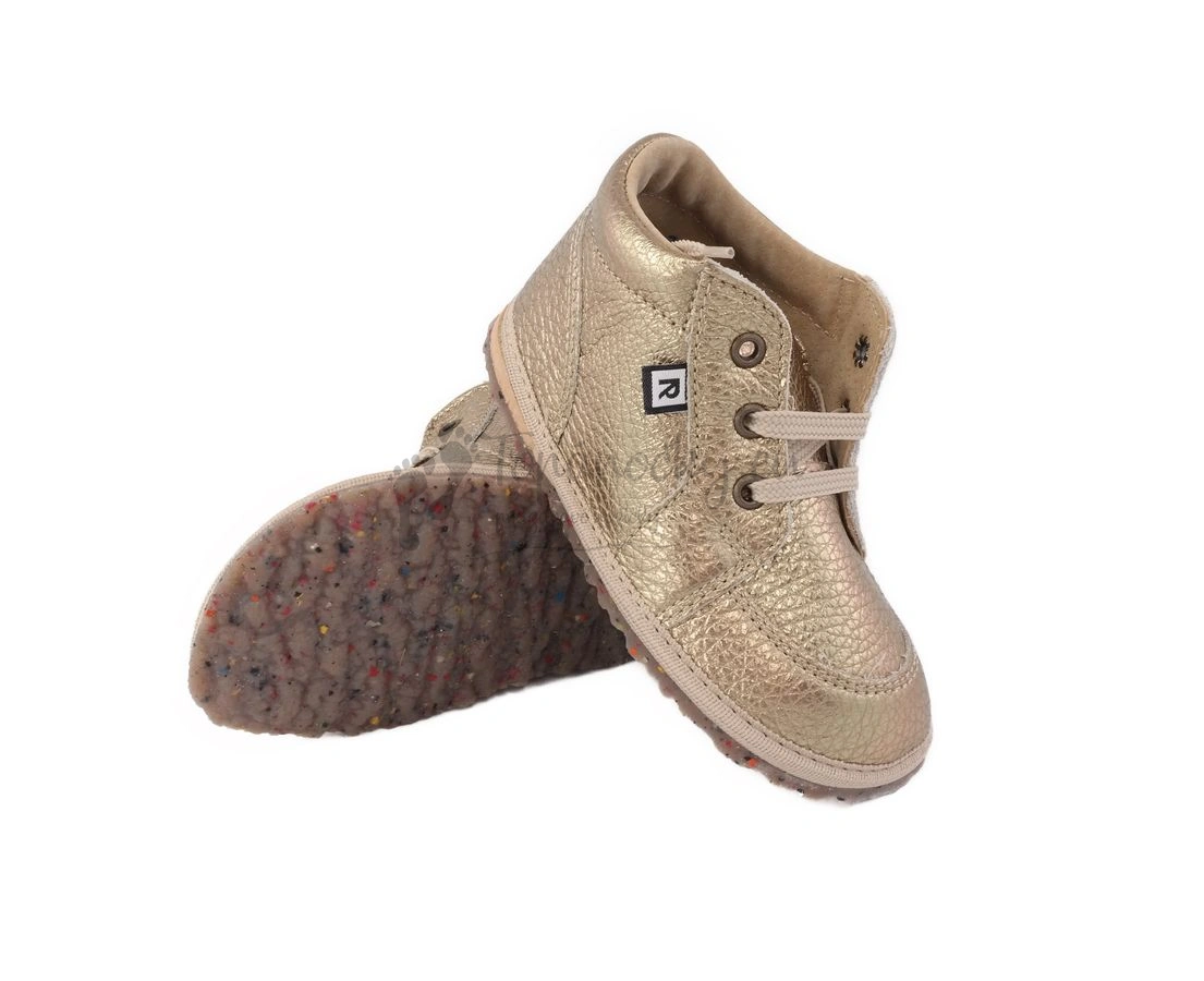 Zlaté ľahučké capačky vhodné už na prvé kroky od slovenského výrobcu firmy RAK. Výrobky od tejto firmy sú kvalitné a vyrobené z nezávadnych materiálov. Tieto topánky sú ušité z mäkkučkej kože usňového typu. Podrážka týchto topánok je béžová a je vyrobená z materiálu na báze prírodného kaučuku. Ja dostatočne protišmyková, takže topánky držia aj na klzkejších povrchoch. Vnútorná výstelka je taktiež kožená. Vďaka šnúrkom sa tieto topánky prispôsobia každej nožičke. Stielka je kožená a vyberateľná.