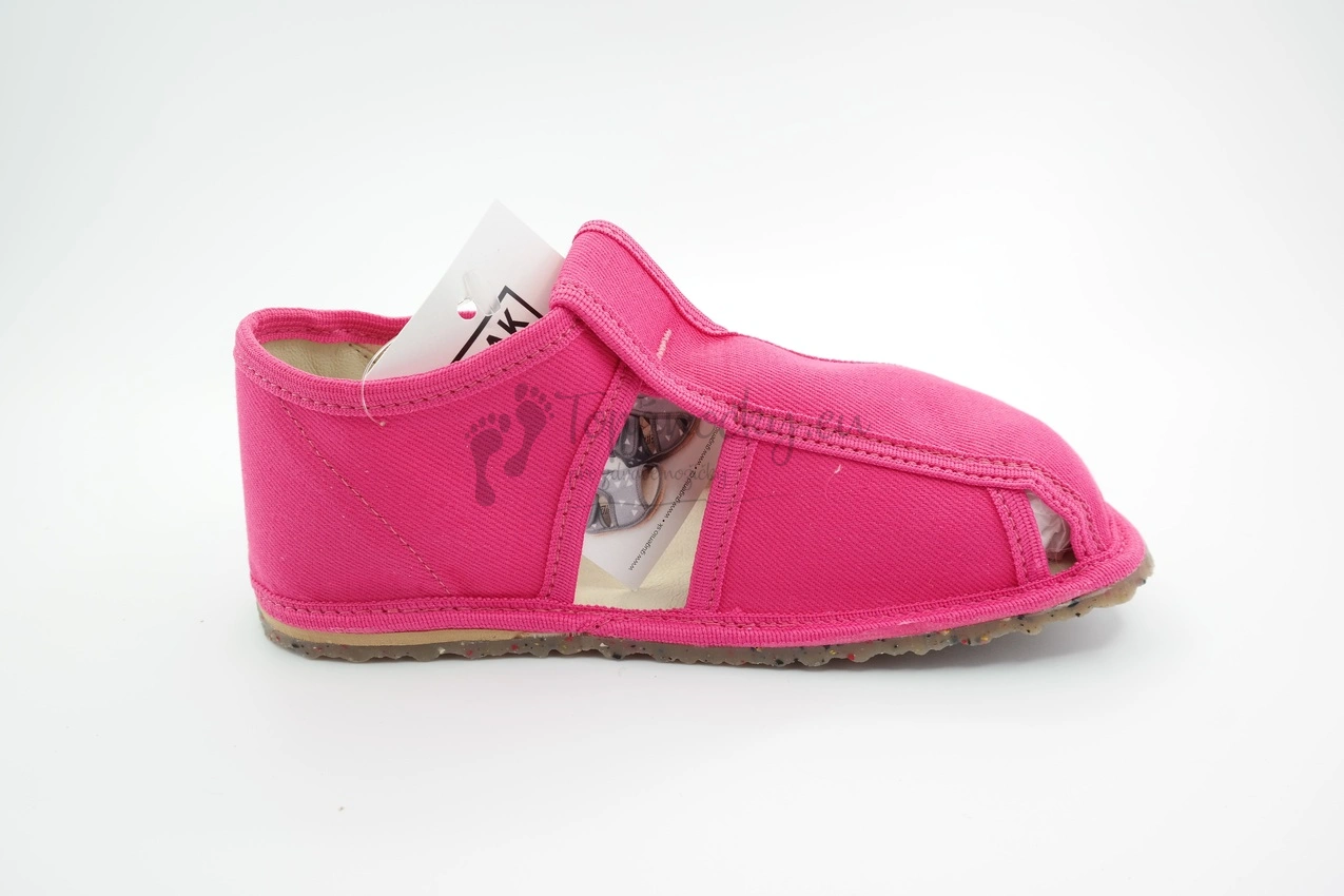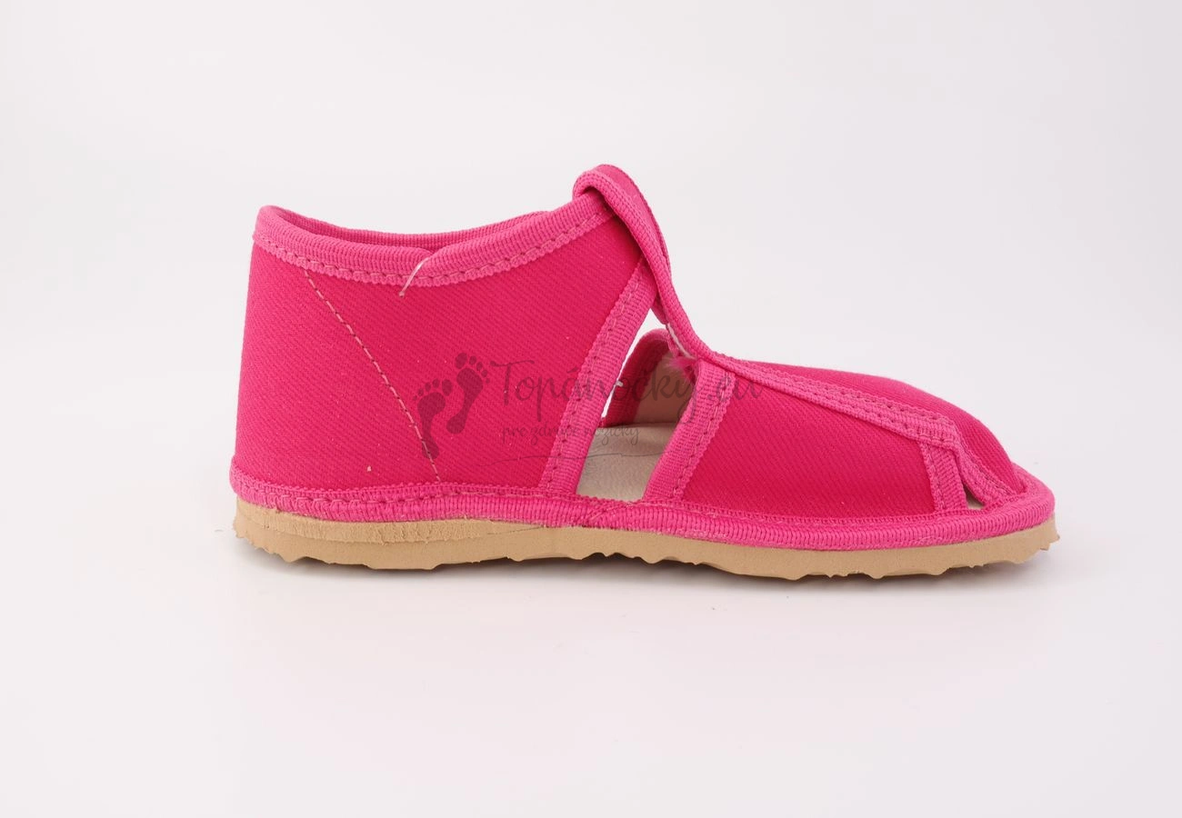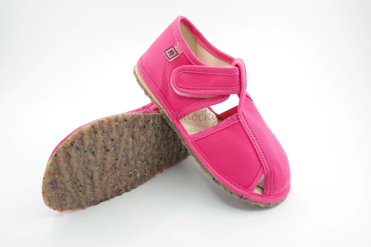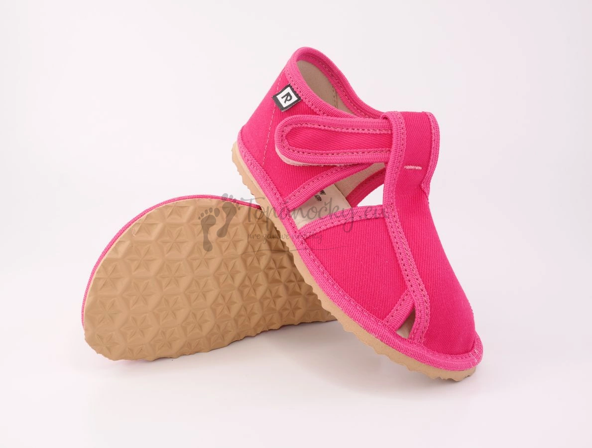 Dievčenské inovatívne papučky z dielne slovenského výrobcu firmy RAK, ktoré sú strihovo prispôsobené aj nohu s dominatným palcom. Vďaka zapínaniu na suchý zips okolo členka sadnú aj na nohy s užším členkom. Podošva týchto papučiek je hnedej farby, je protišmyková a výrazne pružná. Zvršok je z bavlnenej látky, ktorá má krásnu cyklamenovú farbu. Stielka je tvorená kombináciou pamäťovej peny a ECO kože. Vďaka tomu sa stielky prispôsobí prirodzenému tvaru chodidla a nie naopak. Oblasť päty je zvnútra topánok tiež spevnená kožou. Zapínanie je na suchý zips okolo členka. Vetranie nožičky zabezpečujú 4 otvory. Dva v oblasti palcov a dva v oblasti priehlavku.
