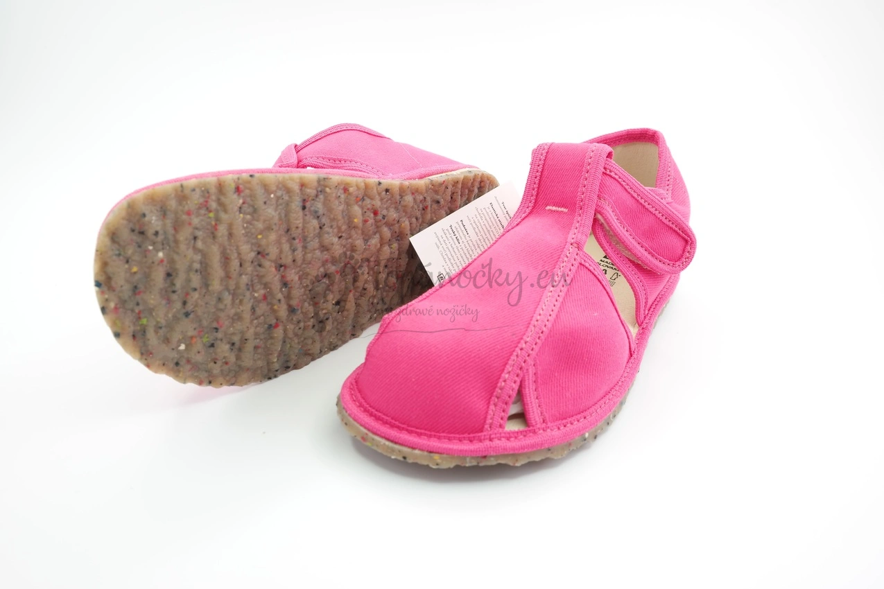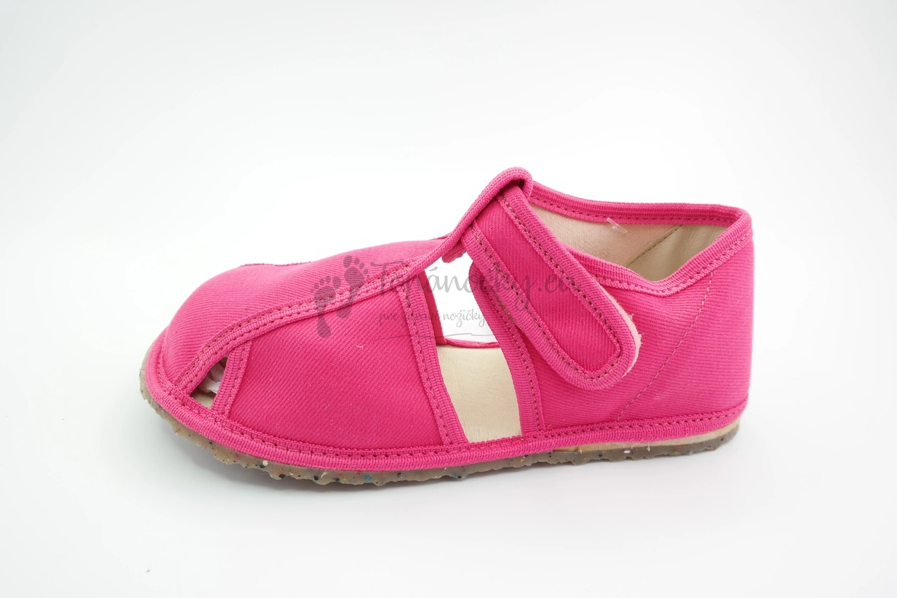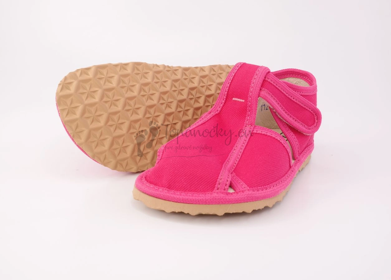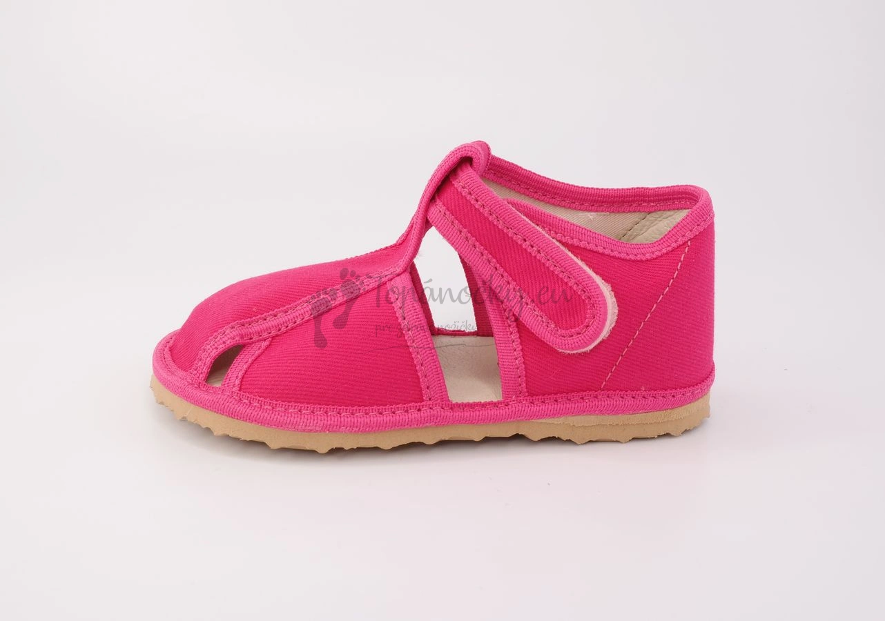 Dievčenské inovatívne papučky z dielne slovenského výrobcu firmy RAK, ktoré sú strihovo prispôsobené aj nohu s dominatným palcom. Vďaka zapínaniu na suchý zips okolo členka sadnú aj na nohy s užším členkom. Podošva týchto papučiek je hnedej farby, je protišmyková a výrazne pružná. Zvršok je z bavlnenej látky, ktorá má krásnu cyklamenovú farbu. Stielka je tvorená kombináciou pamäťovej peny a ECO kože. Vďaka tomu sa stielky prispôsobí prirodzenému tvaru chodidla a nie naopak. Oblasť päty je zvnútra topánok tiež spevnená kožou. Zapínanie je na suchý zips okolo členka. Vetranie nožičky zabezpečujú 4 otvory. Dva v oblasti palcov a dva v oblasti priehlavku.