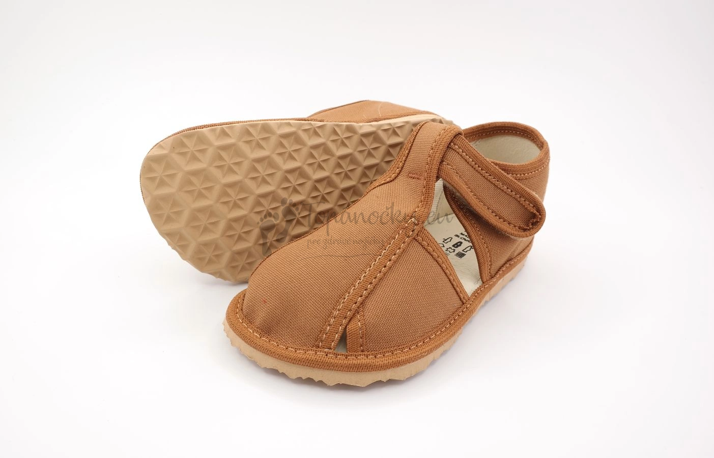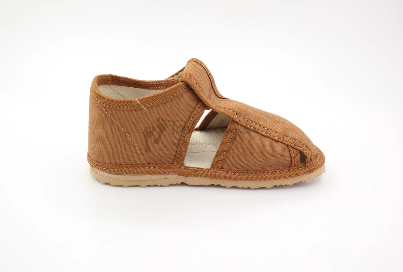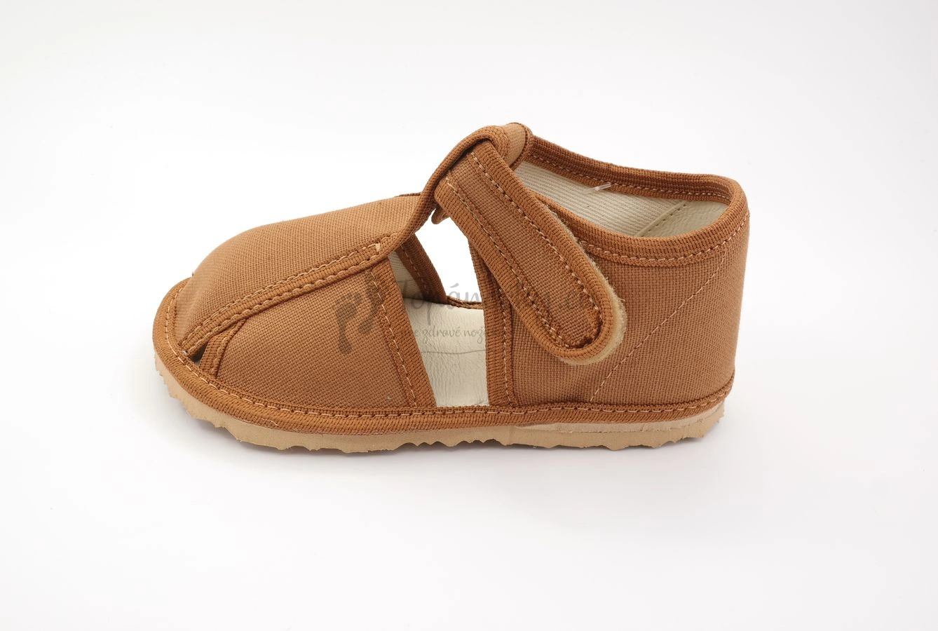 Inovatívne papučky od slovenského výrobcu detskej obuvi RAK si jednoducho zamilujete. Nie len kvôli ich dizajnu a kvalite spracovania, ale najmä kvôli tomu, že sú ideálnou voľbou prezuvkovej obuvi. Inovatívne papučky sú výnimočné tým, že stielka je vyrobená z pamäťovej peny, ktorá má hneď niekoľko benefitov. Okrem toho, že sú pre dieťa pohodlnejšie, zabezpečuje aj správnu polohu nôžky. Papučky majú rozšírenú špičku, čiže ich nebude mať problém nosiť ani dieťa s dominantným palčekom, palce sú prekryté. Okrem toho majú protišmykovú podošvu vyrobenú z prírodného kaučuku, ktorá je dostatočné pružná a zároveň odolná. Papučky sa zapínajú na jeden suchý zips okolo členka. Na vetranie nožičky slúžie štyri otvory, ktoré sú na prezúvkovej obuvi prítomné. Vnútro je z bavlnenej látky, ktorá je v oblasti päty ešte spevnená ECO kožou. Zvršok je taktiež z bavlny, ktorá má hnedú farbu.
