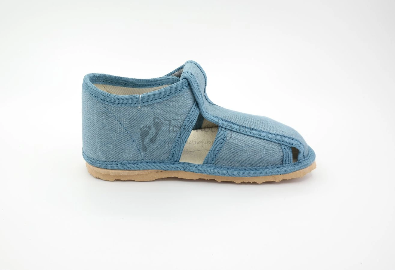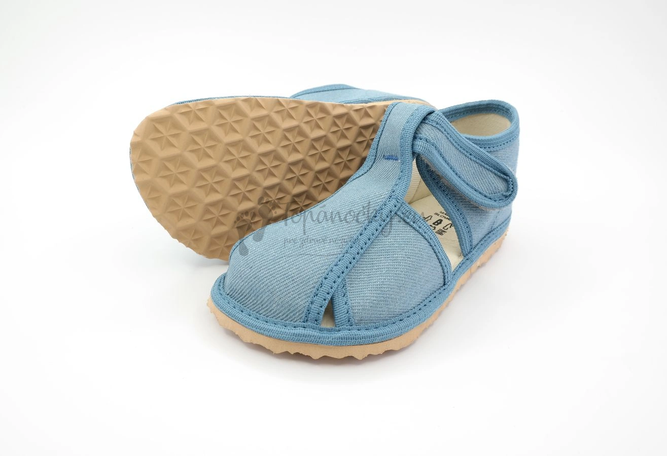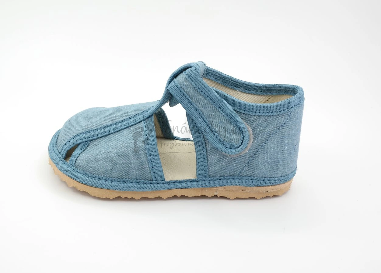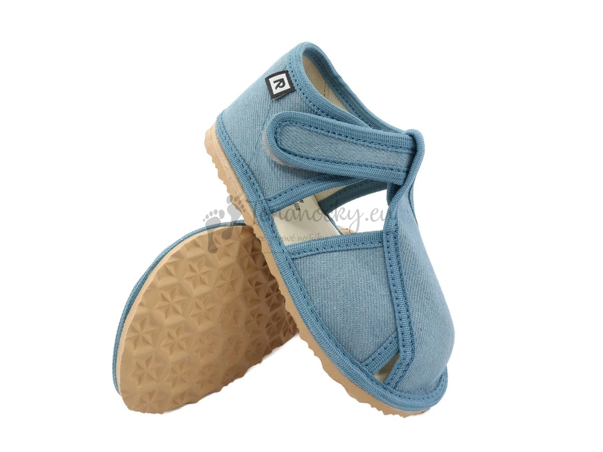 Detské inovatívne papučky, ktoré vyrába slovenský výrobca, firma Rak. Podošva týchto papučiek je hnedej farby, je pružná, ohybná a protišmyková. Je vyrobená z materiálu na báze prírodného kaučuku. Zvršok je z bavlnenej látky vo veľmi obľúbenom rifľovom dizajne, ktorý je univerzálny a vhodný pre chlapcov i dievčatá. Stielka je tvorená kombináciou pamäťovej peny a ECO kože. Oblasť päty je zvnútra topánok tiež spevnená kožou. Zapínanie je na suchý zips okolo členka. Papučky majú inovovaný tvar špičky, ktorý rešpektuje dominantný palec. Na papučkách sa nachádzajú aj štyri otvory, ktoré zabezpečujú vetranie nožičiek.
