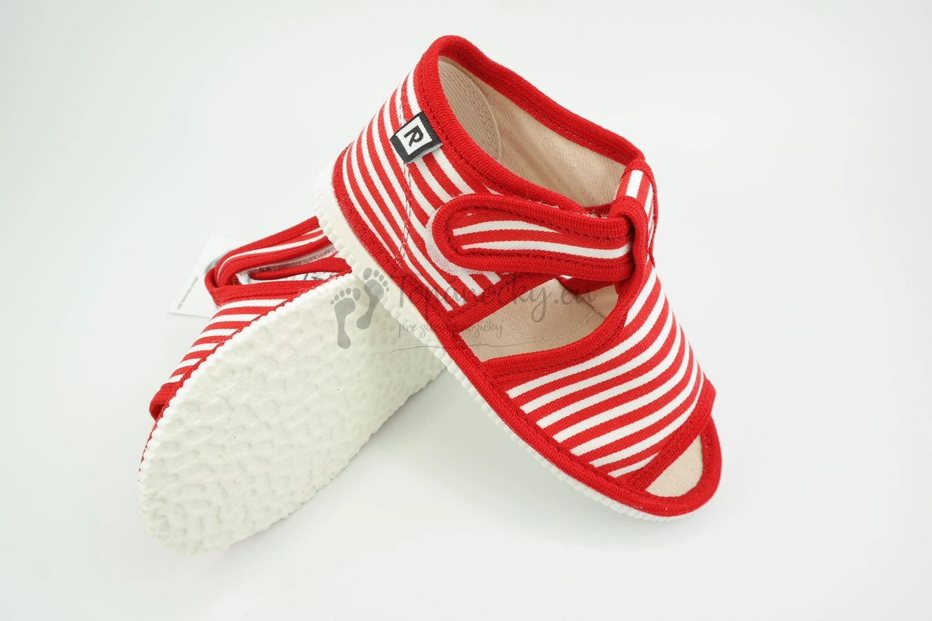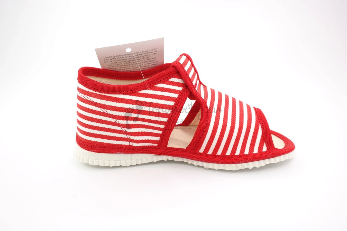 Papučky červený pásik značky RAK sú vhodné predovšetkým pre dievčatá. Sú ľahké a priedušné. Zapínanie je na suchý zips, ktorý sa nachádza na boku papučiek. Papučky majú otvorenú špicu. Sú vhodné na nosenie na doma, do škôlky alebo školy.