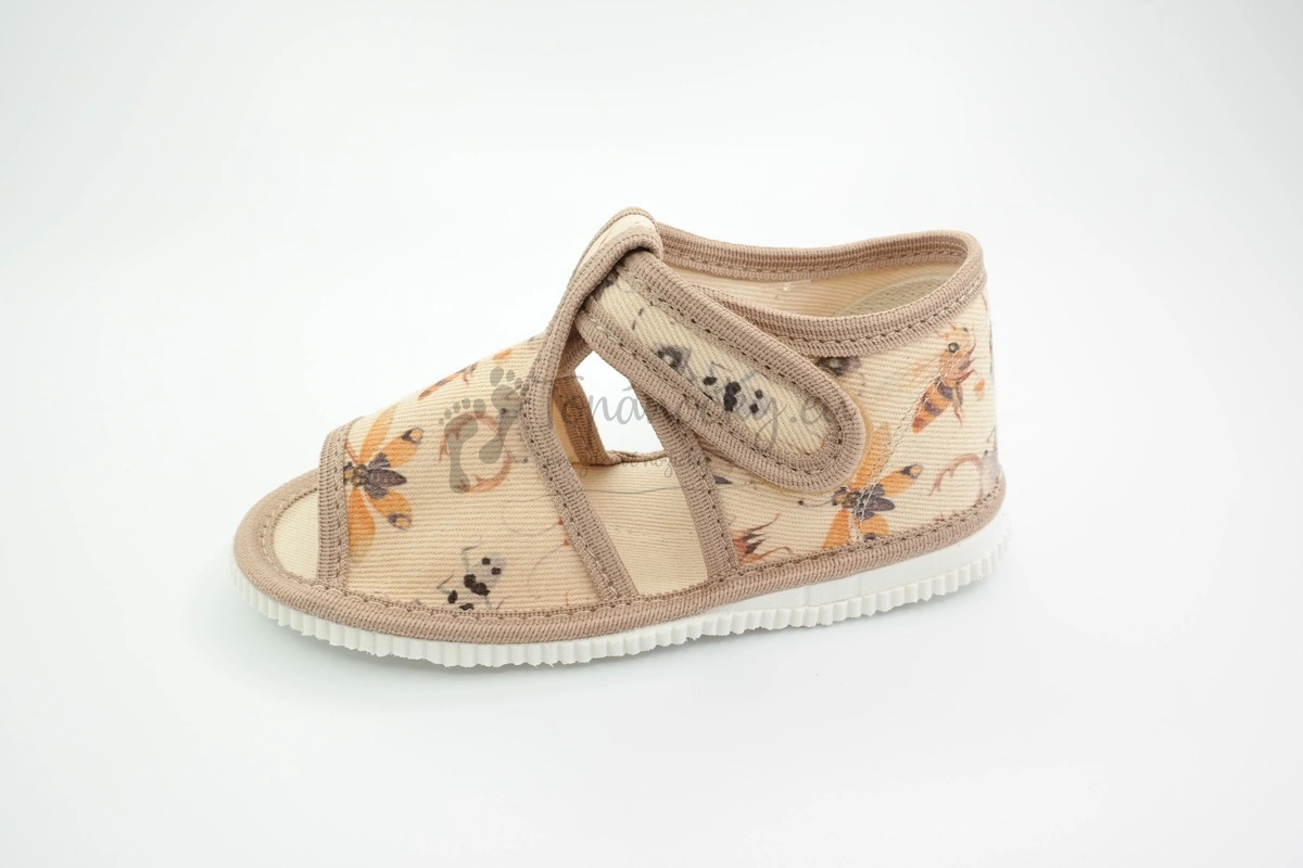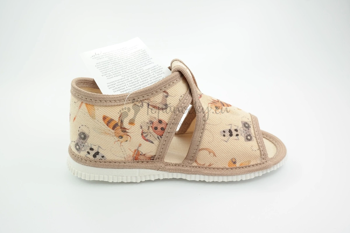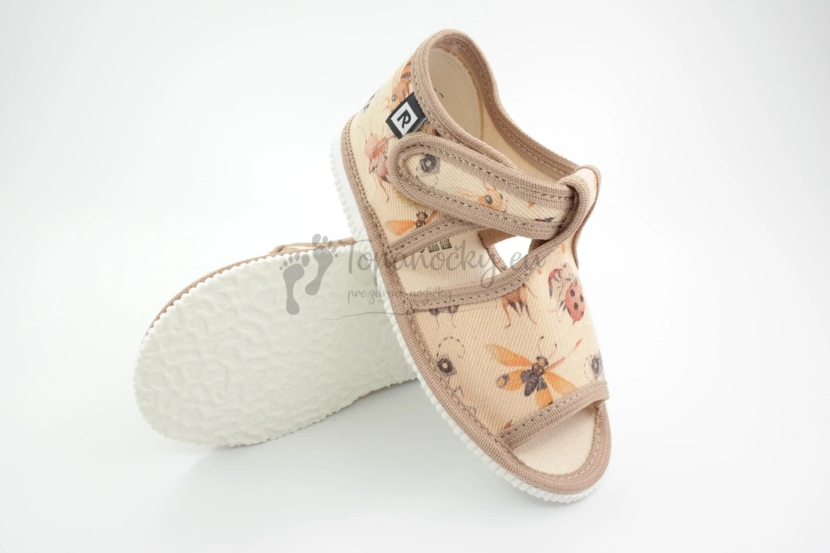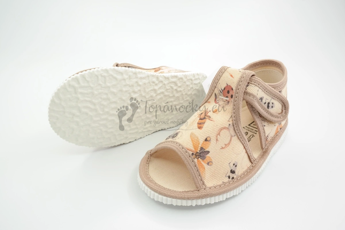 Béžové papučky z látky, na ktorej je vyobrazený rozličný hmyz od slovenského výrobcu firmy Rak. Podrážka týchto papučiek je bielej farby s typickým mramorovaním. Je pružná, ohybná. Zvršok je textilný, svetlobéžový a olemovanie je tmavšej béžovej farby. Vnútro je svetlobéžové. V oblasti päty sa nachádza spevnená látková časť. Stielka je textilná a nachádza sa na nej prvok na podporu klenby. Palce sú voľné. Zapínanie je na jeden suchý zips, okolo členka.