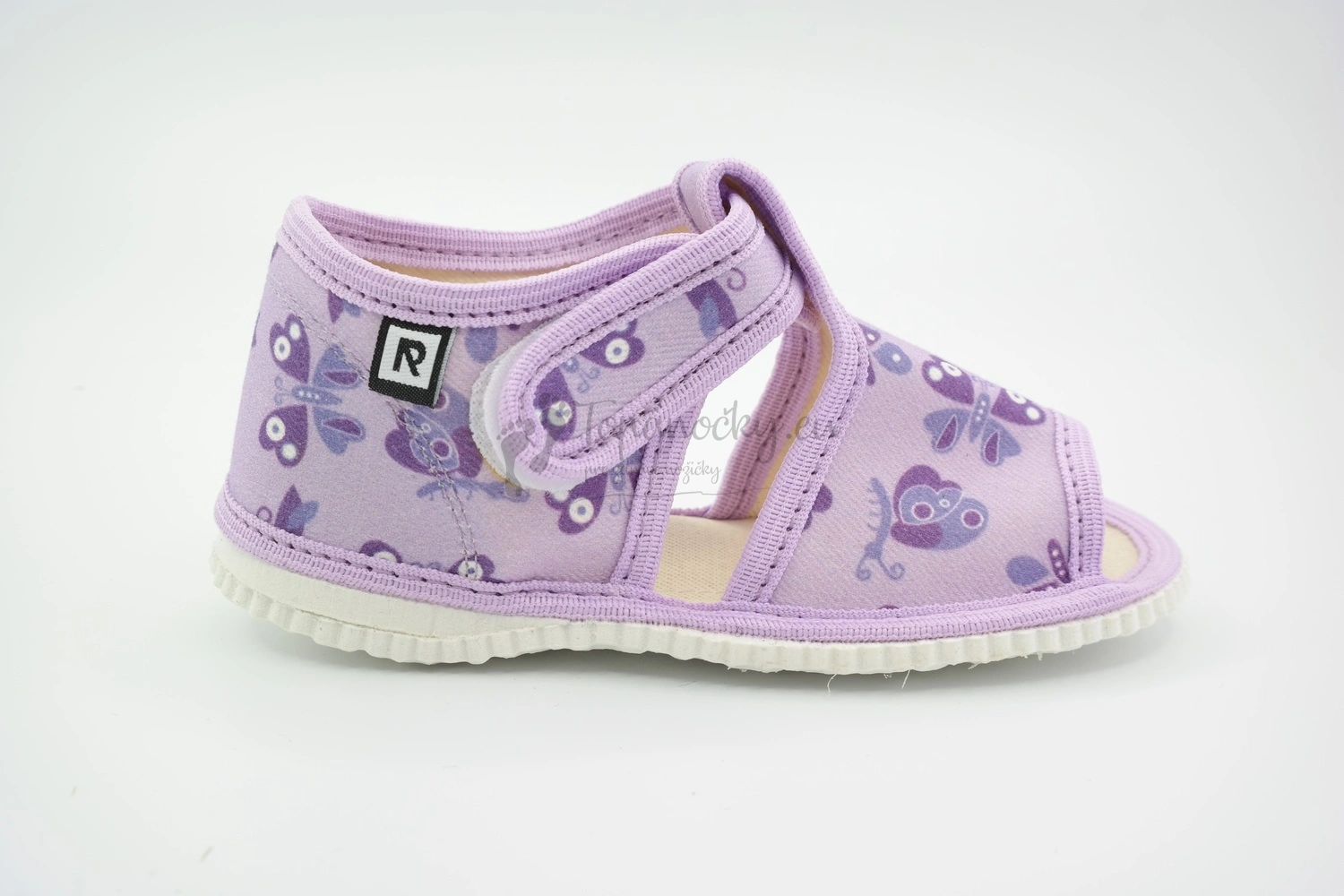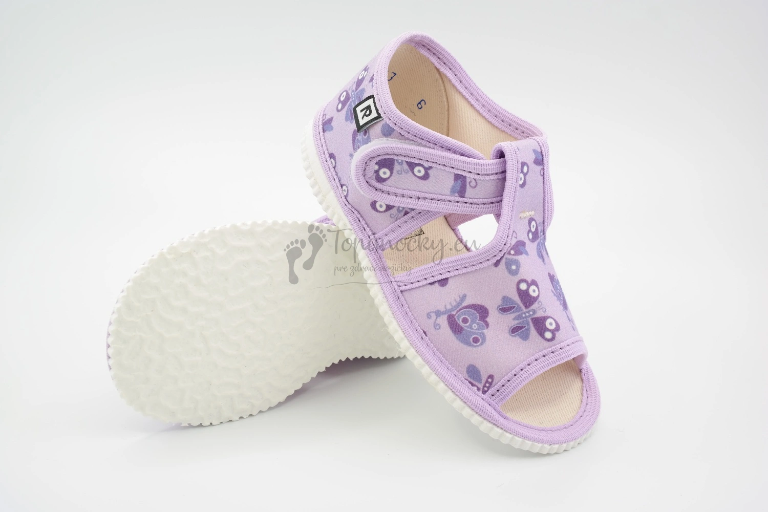 Detské sandálkové papučky, s otvorenou špicou so zapínaním na suchý zips. Zovňajšok papučky je tvorený fialovou látkou s potlačou rozprávkových motýľov.Papučky sú vyrobené z textilu, ktorý je priedušný a prispôsobuje sa tvaru nohy dieťaťa.Vnútorná stielka je na päte vyplnená penou, ktorá zabezpečuje pohodlnú chôdzu a zdravý vývoj nôžky.Papučky sú predovšetkým určené ako prezuvky, alebo obuv do interiéru.Sú vhodné pre deti od prvých krokov.