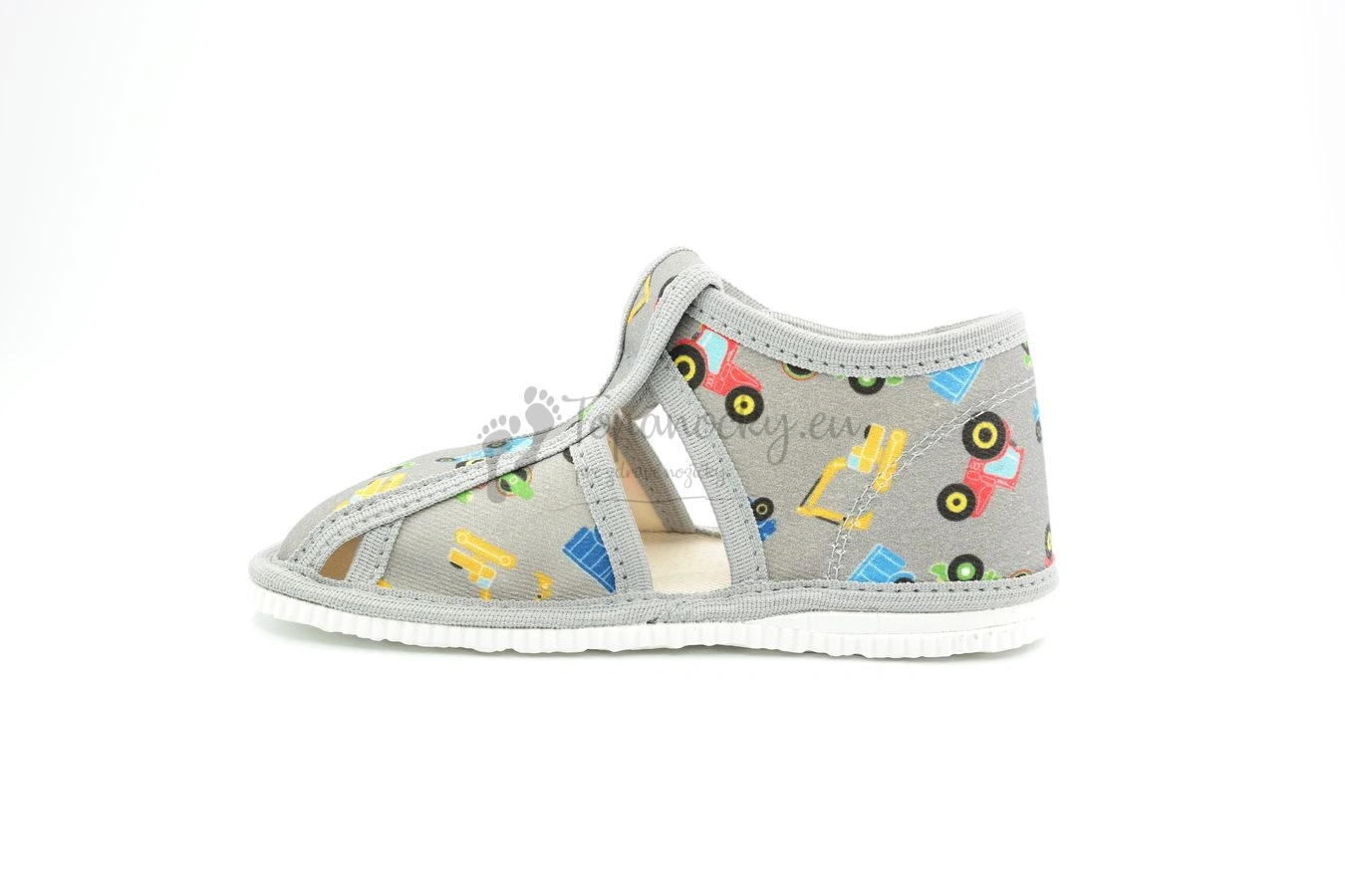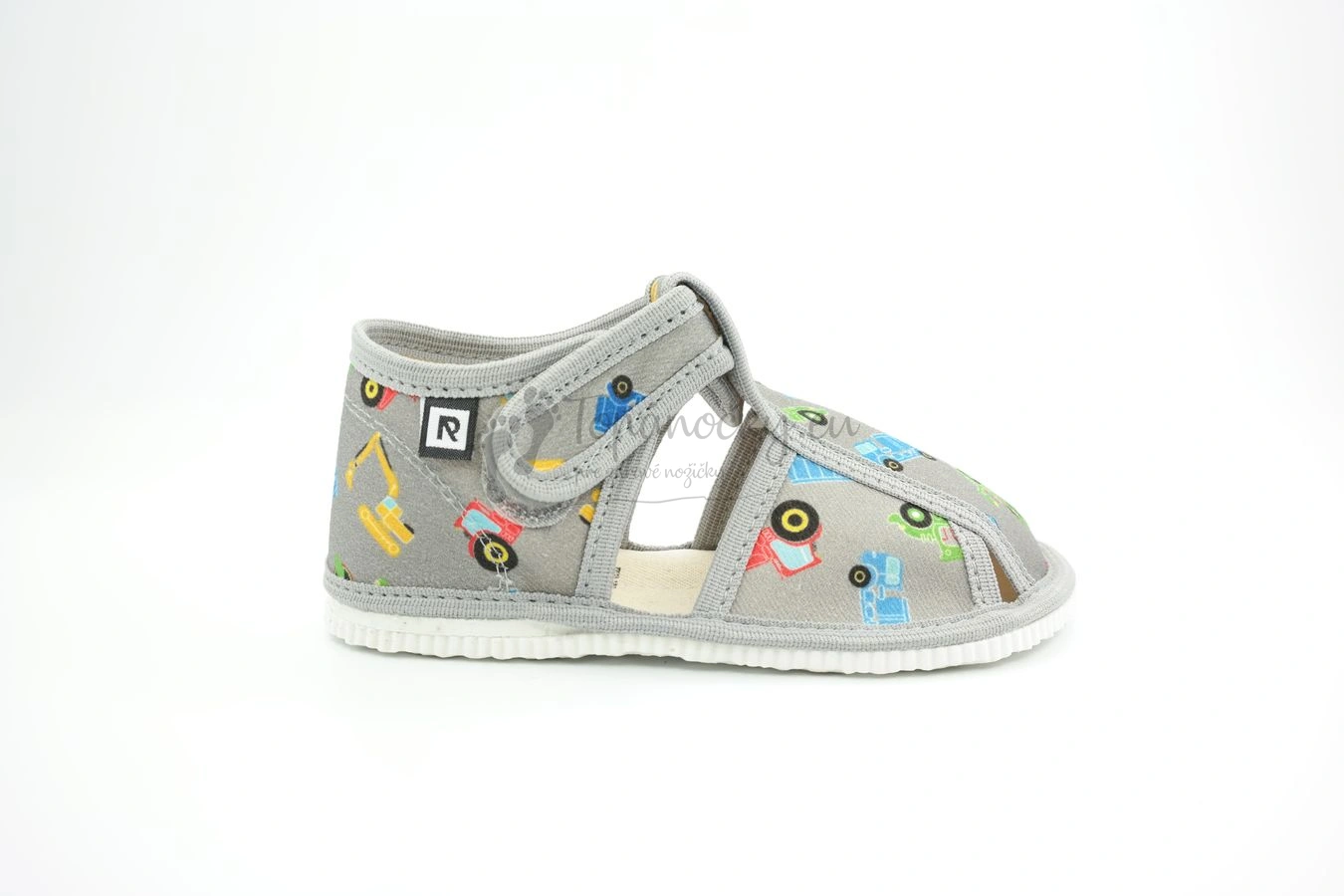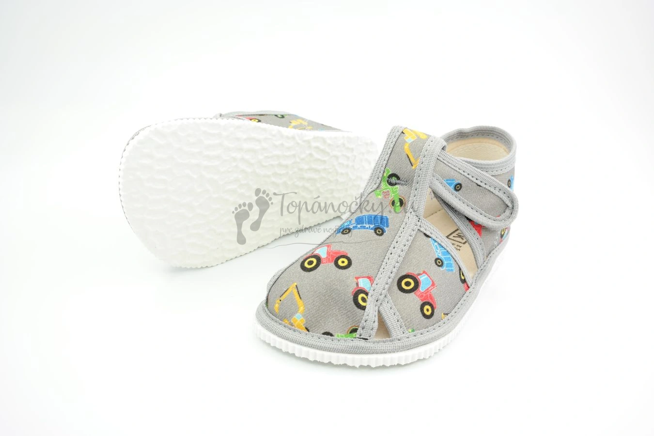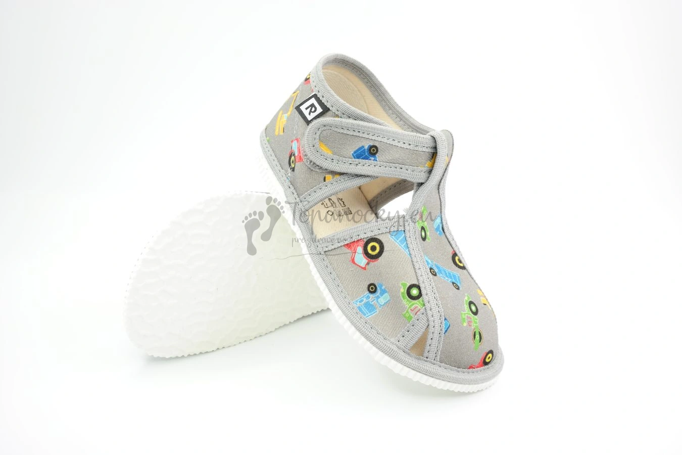 Šedé papučky od slovenského výrobcu firmy Rak. Majú podrážku bielej farby, ktorá vďaka typickému mramorovaniu zabezpečí, že sa v papučkách nebude až tak šmýkať. V oblasti päty je nízky podpätok. Zvršok je textilný a je šedej farby. Látka je potlačená pracovnými strojmi v rozličných farbách, vďaka tomu papučky zaujmú každé dieťa. Vnútro je bielej farby. V oblasti päty sa nachádza spevnená časť. Stielka je taktiež textilná a je s podporou klenby. Na papučkách sú 4 otvory, ktoré zabezpečujú vetranie nožičky. Zapínanie je na jeden suchý zips, okolo členka.