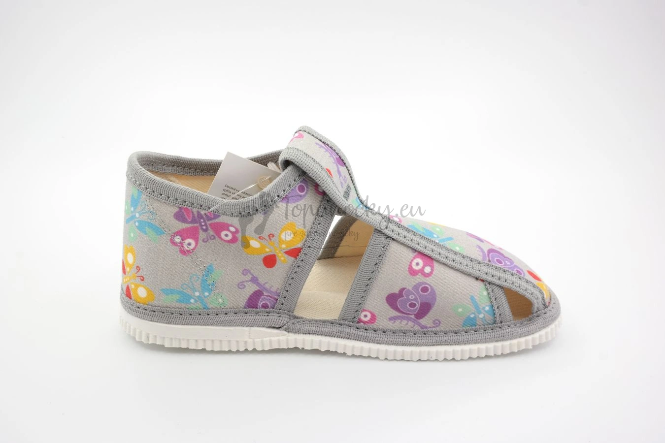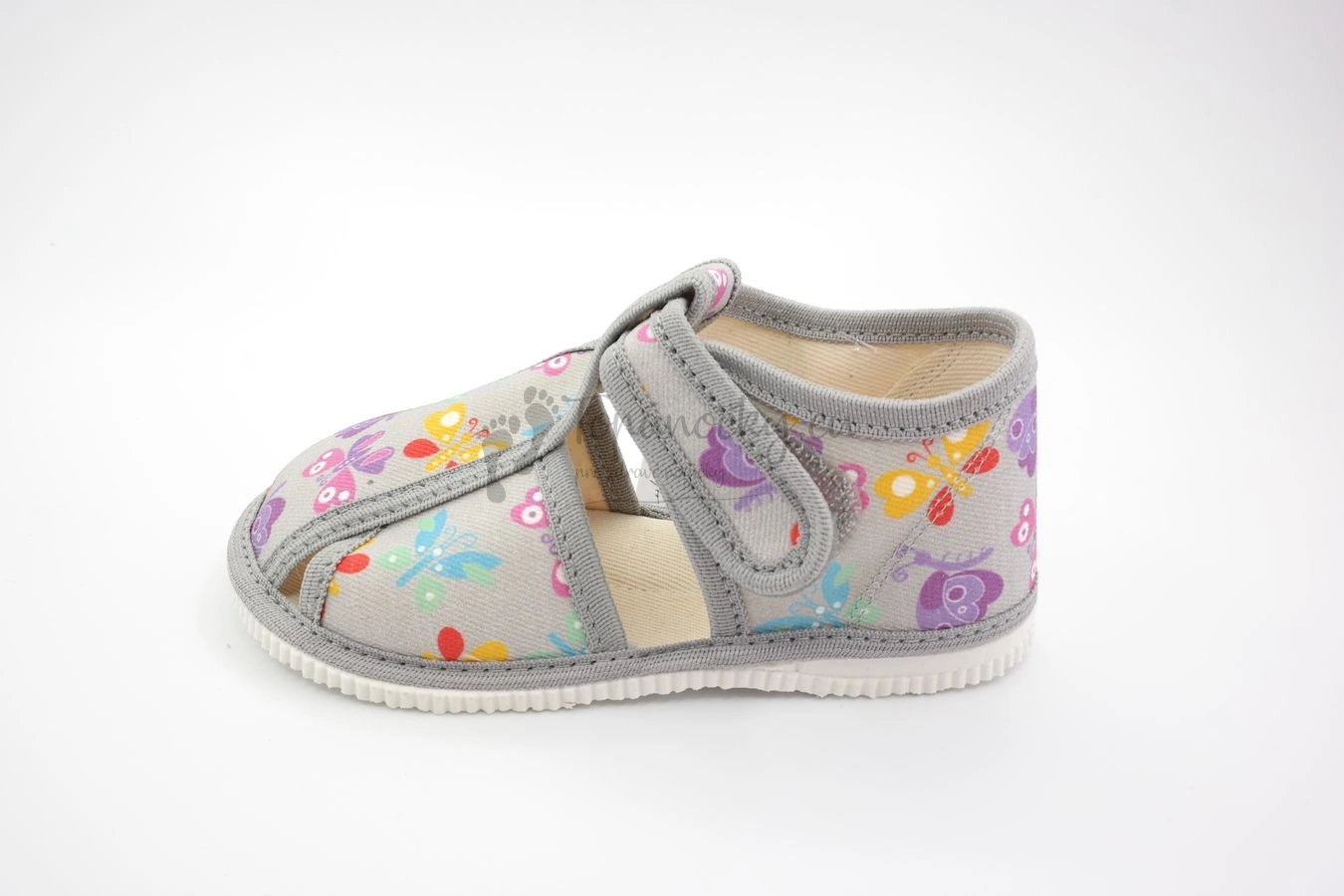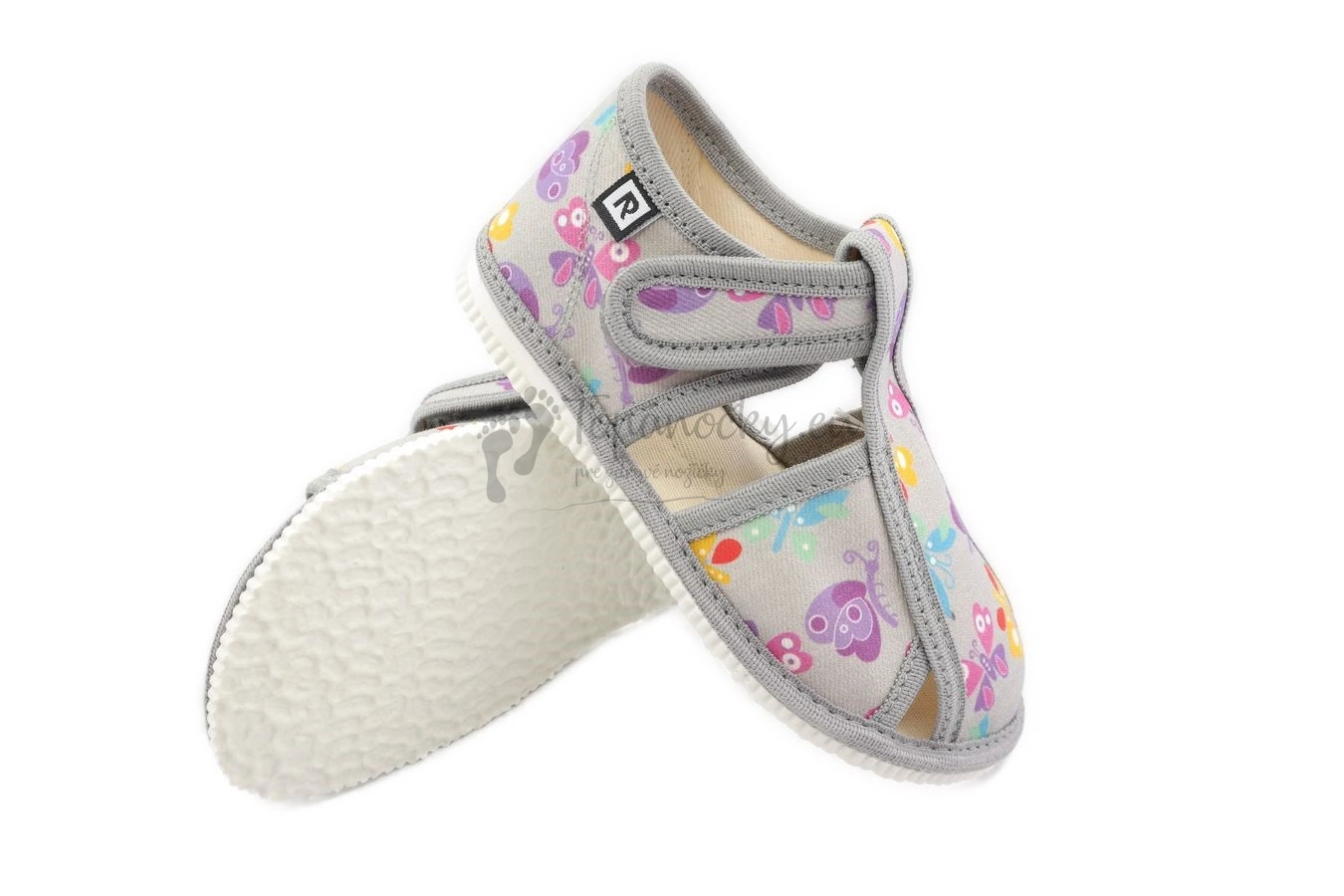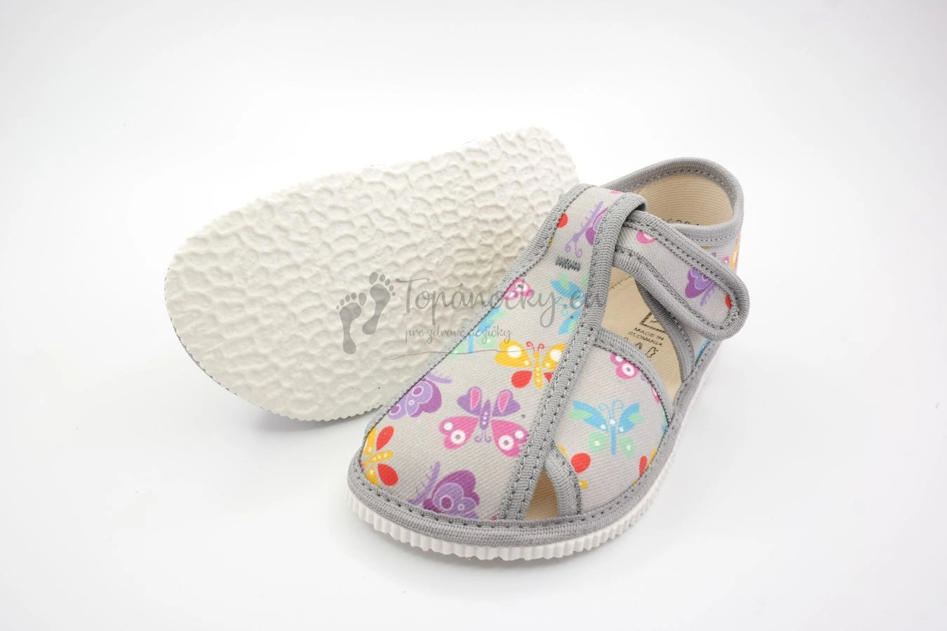 Detské papučky z dielne slovenského výrobcu firmy RAK pre všetkých milovníkov motýľov. Papučky sú ľahké, majú ohybnú podrážku, ktorá je bielej farby a má akoby mramorový povrch, ktorý zabezpečuje to, aby sa v papučkách príliš nešmýkalo. Zvršok je zo 100% bavlny. Základ tvorí šedá farba, ktorá je na látke aj na olemovaní. Potlač je tvorená z farebných motýľov, farebna sú žlté, modré, fialové... Stielka je textilná, podobne ako aj vnútro. Papuče majú anatomický klenok, ktorého úlohou je zabezpečiť dieťaťu pohodlnú a bezpečnú chôdzu a podporovať zdravý vývoj nohy. Zapínanie je na suchý zips okolo členka, vďaka ktorému je detská nôžka v papučkách stabilnejšia. Odvetranie nôh je zabezpečené vďaka štyrom otvorom.