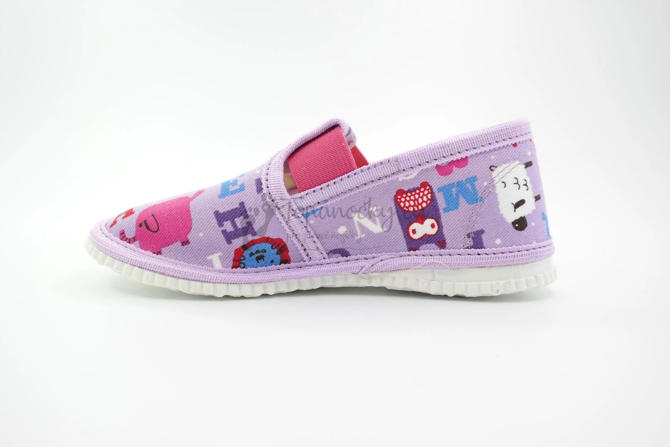 Detské papučky vhodné ako domáca obuv, ale aj ako prezúvky do školy. Papučky sú ľahké, majú ohybnú podrážku, ktorá je bielej farby a má akoby mramorový povrch, ktorý zabezpečuje to, aby sa v papučkách príliš nešmýkalo. Zvršok je zo 100% bavlny. Je fialovej farby s potlačou písmenok a zvierat. Potlač je farebná, pričom prevažuje fialová a biela farba, no nájdu sa aj červené či modré prvky. Na priehlavku sa nachádza gumotextilný pásik. Stielka je textilná, podobne ako aj vnútro. Papuče majú anatomický klenok, ktorého úlohou je zabezpečiť dieťaťu pohodlnú a bezpečnú chôdzu a podporovať zdravý vývoj nohy.