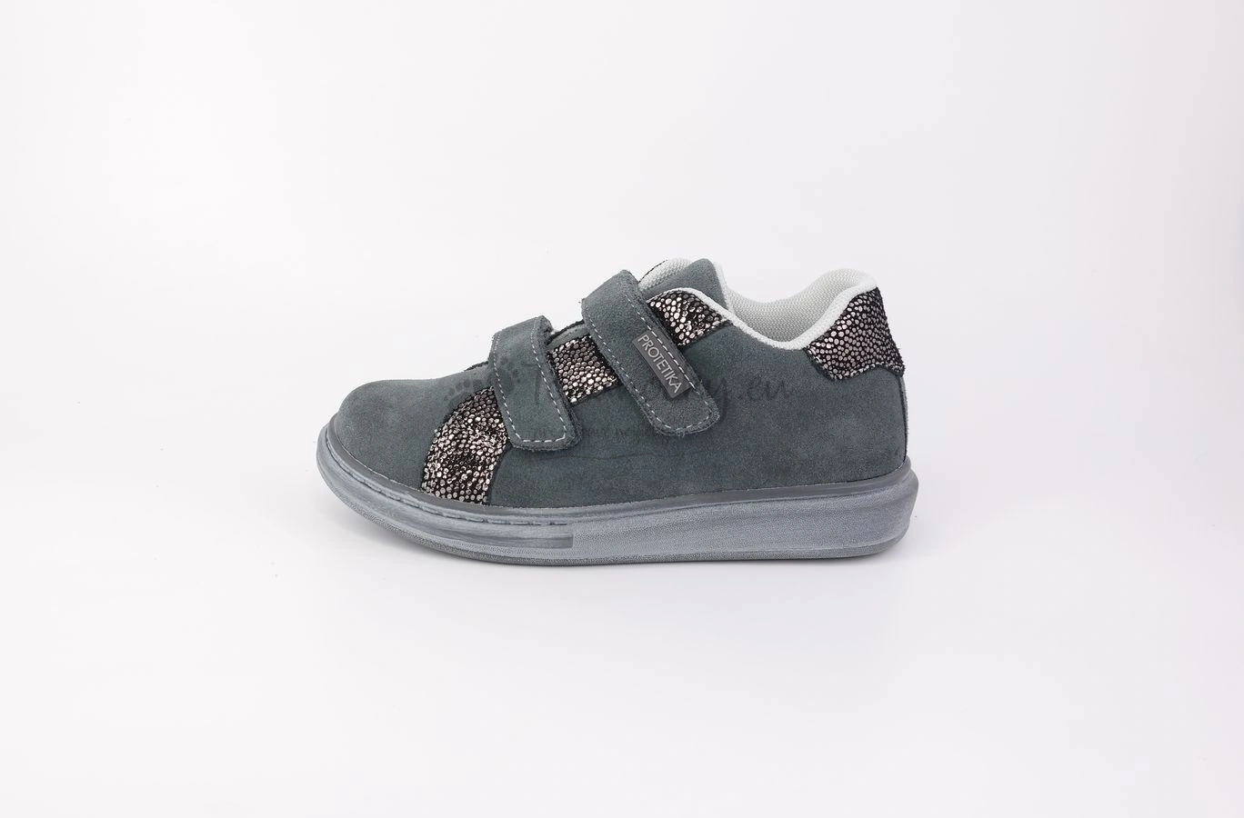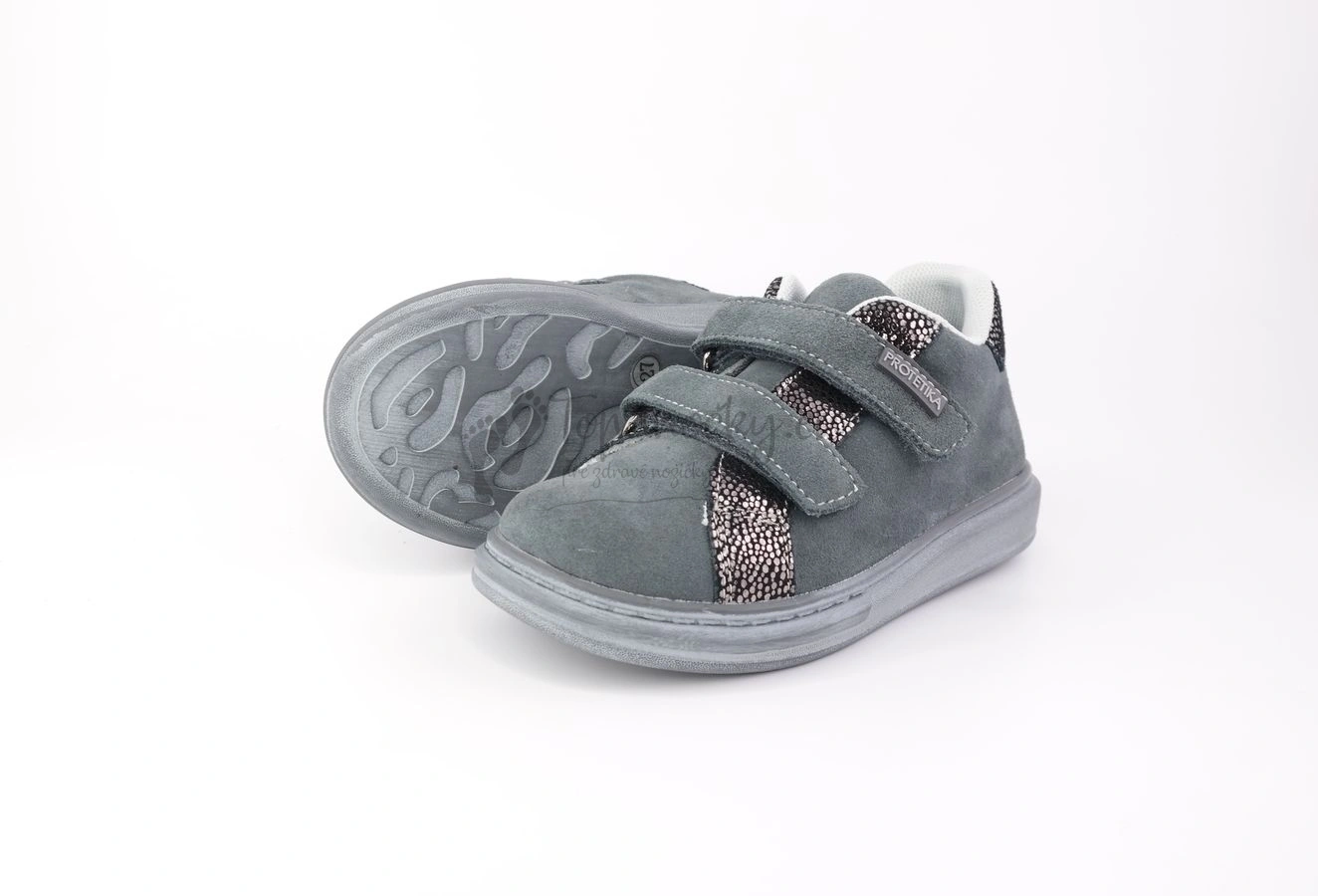 Šedé nízke topánky, ktoré sú doplnené stiebornou aplikáciou, ktorý ich dizajn robí zaujímavejší. Podošva má šedú farbu s bielou patinou. Je pružná ale omnoho menej ako podošva barefoot topánok. Zvršok je z brúsenej kože tmavošedej farby. Okolo jazyka a v zadnej časti topánok, okolo členka, je koža čierna a husto posiaha stiebornými fľakmi rozližných veľkostí. Vnútro je z priedušnej sieťoviny, ktorá siaha aj do vonkajšej časti. Stielka je kožená, vyberateľná a má prvok na podporu anatomickej klenby. Zapínanie je na dva suché zipsy.