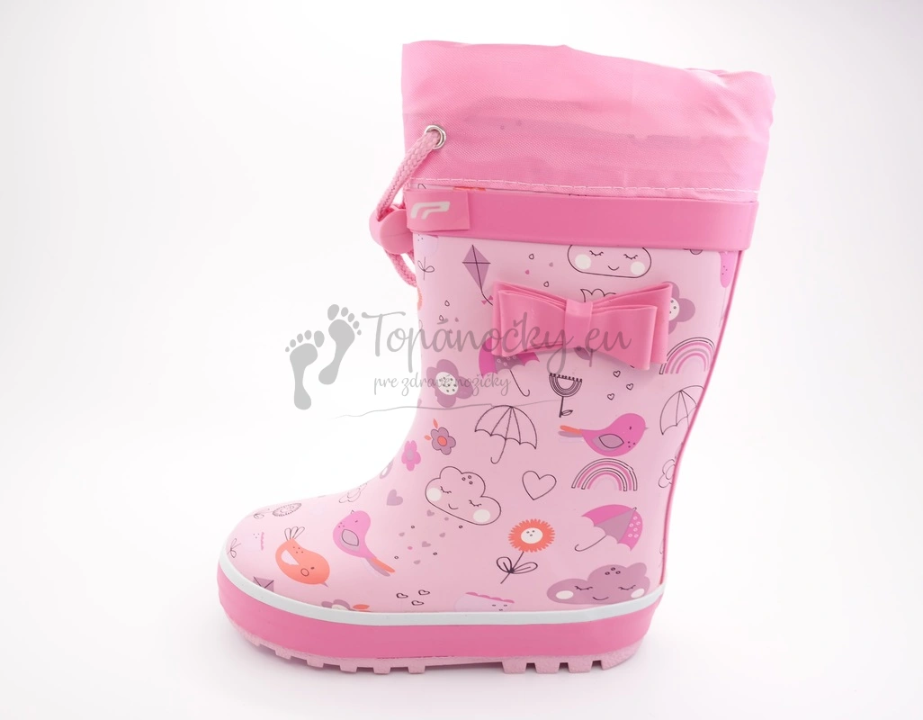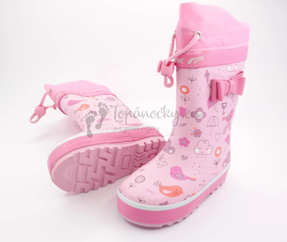 Ružové ľahké a ohybné gumáky, ktoré majú na vrchu praktickú šnúrku na stiahnutie. Na tomto modely dominuje ružová farby, ktorá je v rozličých odtieňoch na podrážke, zvršku, látke, na potlači, ale i mašli, ktorá sa nachádza na boku topánok. Podrážka je celkovo vyššia, nad ňou je biely pás a pokračuje časť s bohatou potlačou vtáčikov, mrakov, dáždnikov... Vnútorná časť je zateplená bielou huňatou látkou. Prítomná je i tenká vložka, ktorá ja rovná a vyberateľná.