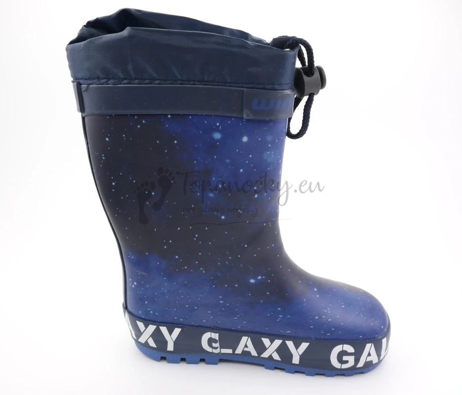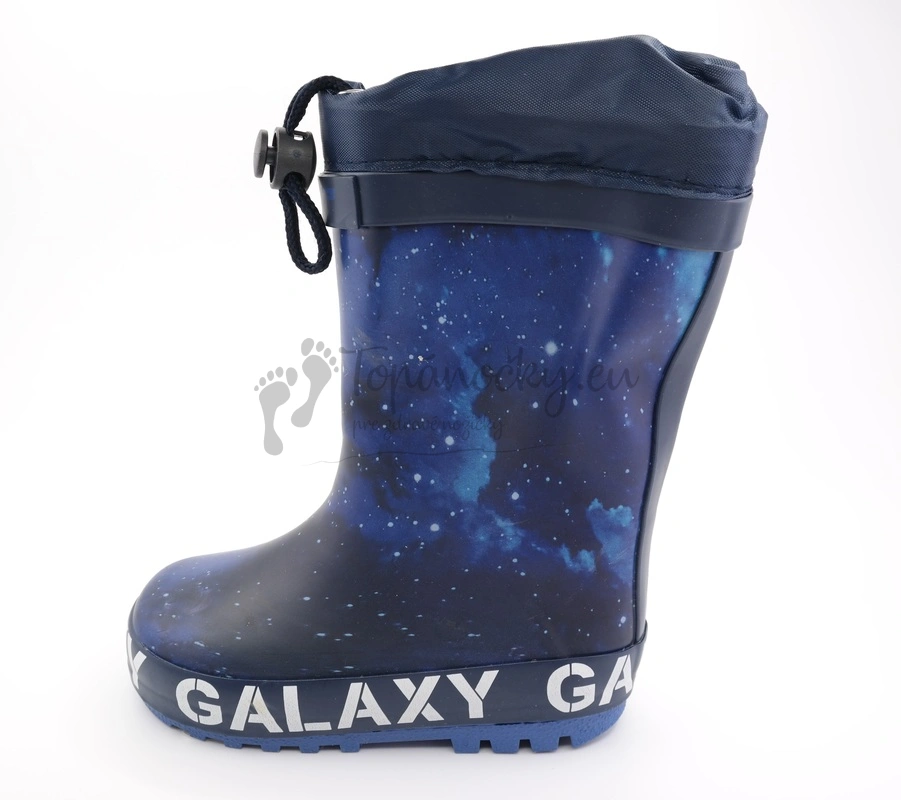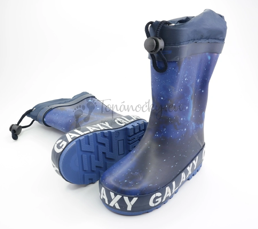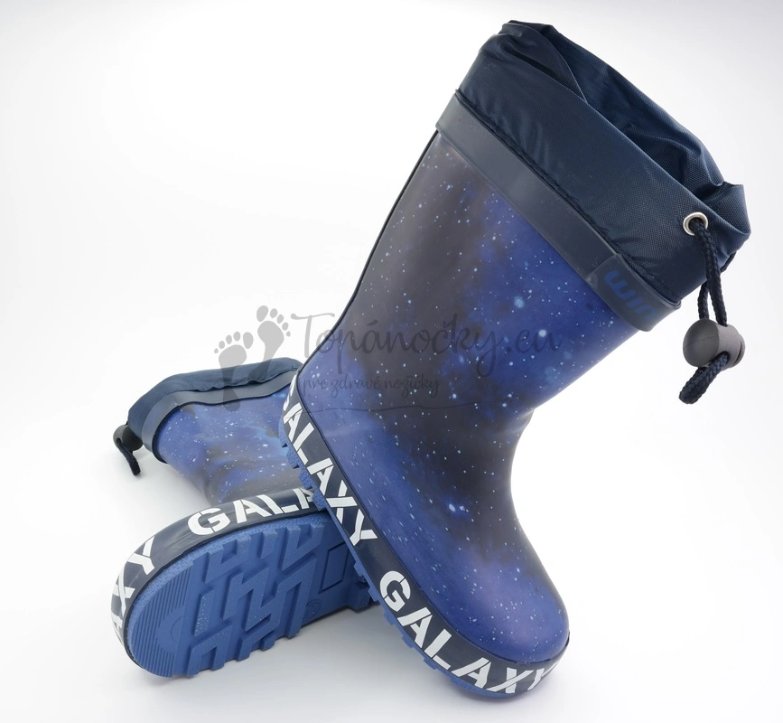 Tmavomodročierne ľahké a ohybné gumáky, ktoré majú na vrchu praktickú šnúrku na stiahnutie. Tento model je zaujímavý svojim dizajnom, ktorý výzerá ako nočná obloha. Preto na týchto gumákoch prvláda kombinácia modrých odtieňov a čiernej farby. Podrážka je celkovo vyššia, je modrá a nad ňou je široký pás, ktorý má po celej dĺžke nápis GALAXY.Vnútorná časť je zateplená bielou huňatou látkou. Prítomná je i tenká vložka, ktorá ja rovná a vyberateľná.