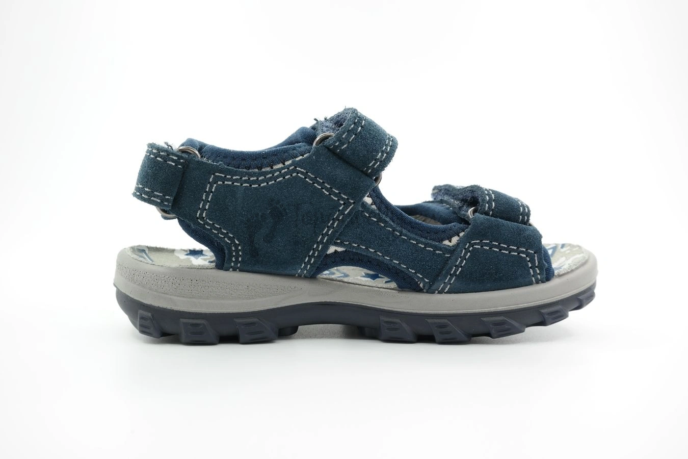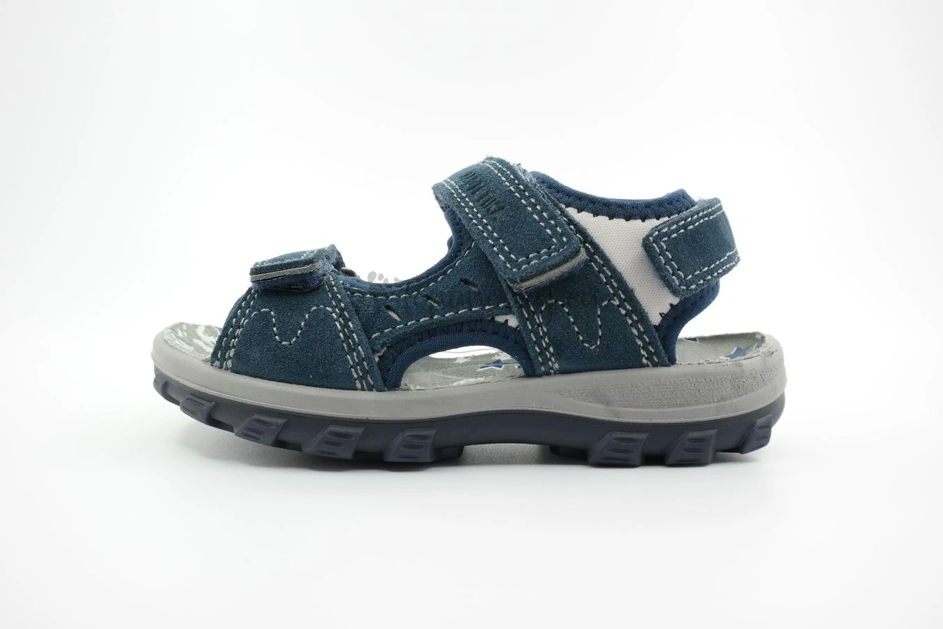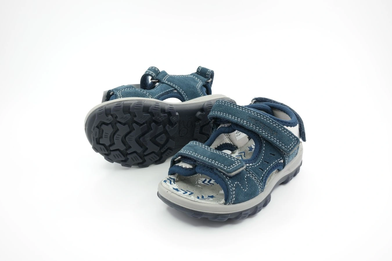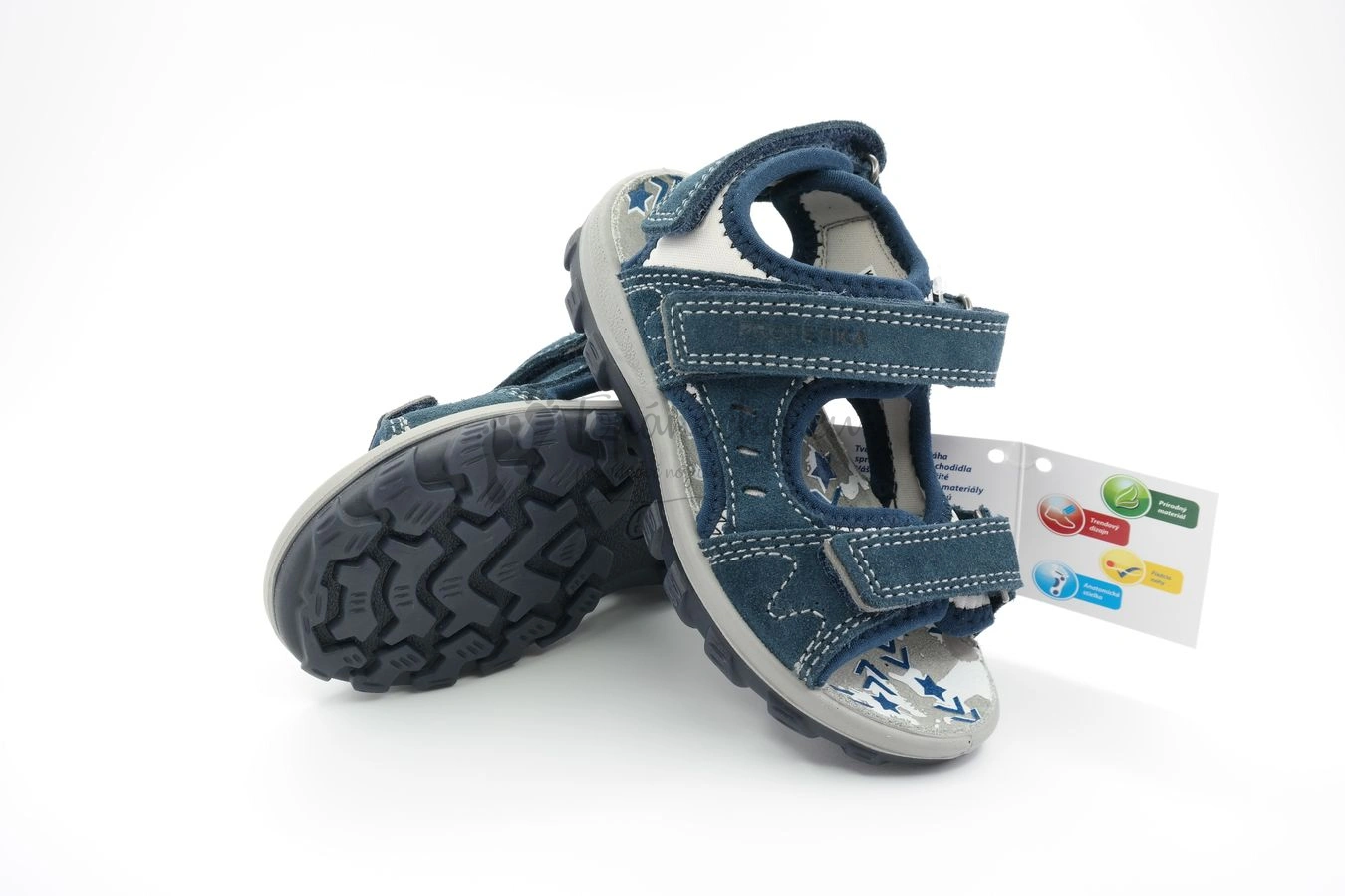 Letné sandále vyrábané firmou Protetika. Podrážka týchto topánok má tmavomodrú farbu, nad ktorou sa nachádza lem šedej farby. Podrážka je nízka a ohybná. Zvršok je z brúsenej koža, ktorá je tiež tmavomodrá. Pohodlnosť topánok zvyšuje mäkká látka, ktorá presahuje cez brúsenú kožu. Látka je šedá s tmavomodrým olemovaním. Stielka je s podporou klenby a na dotyk je mäkká a jemne pruží. Má šedú farbu s potlačou, ktorá je modro-biela. Topánky sa zapínajú na tri suché zipsy. Jeden je okolo členka a dva sú v oblasti priehlavku.
