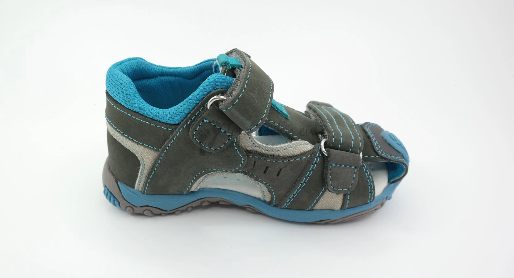 Letné topánky sandálového strihu, ktoré nájdu svoje využitie ako v meste, tak aj v prírode. Topánky nepatria medzi najľahšie, ale v tomto prípade za to môže masívnejšia podrážka, ktorá obsahuje množstvo výbežkov. Na mieste, kde sú prekryté palce je podrážka vyvýšená a plynule pokračuje do gumy, takže topánky sa tak rýchlo neokopú. Vonkajšia časť topánok je tvorená kombináciou tmavošedej nubuk kože, pod ktorou jekoža svetlejšej šedej farby. Šedý zvršok je zaujímavo dotvorený tyrkysovými prvkami - podážkou, prešitím a kúskom kože, cez ktorý prechádza vrchná pracka. Stielka je kožená a anatomicky tvarovaná. Vnútro je vystlané sieťovinou, ktorá je tyrkysovej farby a prachádza aj do vonkajšej časti v podobe lemu okolo členka. Zapínanie je na dva suché zipsy.