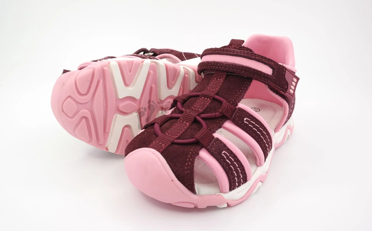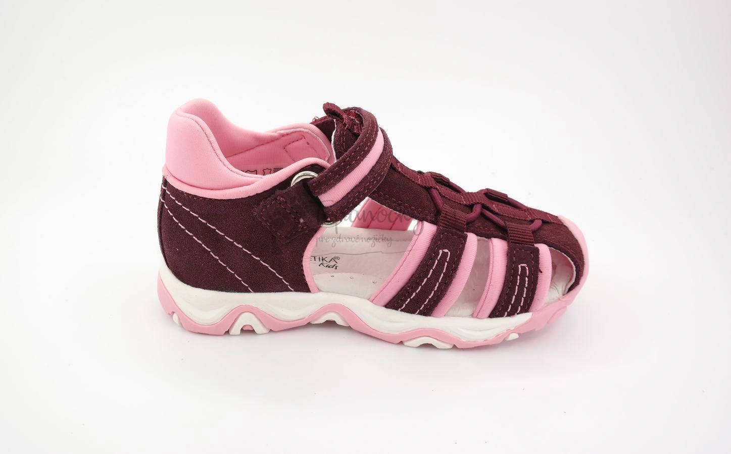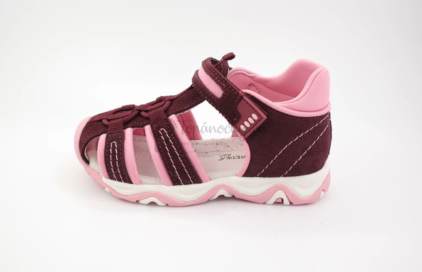 Dievčenské letné sandále športového charakteru od slovenského výrobcu firmy Protetika. Tieto letné topánky majú gumenú podrážku, ktorá je bielo-ružová a je ohybná, ale len mierne. V prednej časti je výrazne vyvýšená a siaha až na okop. Zvršok je prevažne tvorený brúsenou kožou bordovej farby, ktorá je podšitá ružovou látkou, ktorá štruktúrou pripomína neoprén. Tá zvyšuje pohodlnosť topánok, pretože je mäkká. Látka presahuje aj do vonkajšej časti a to okolo členka a na pracke. Prešitie je niťou bordovej farby. Niektoré časti sú prešité ešte aj niťou ružovej farby, ktorá robí dizajn topánok nápaditejší. Stielka je z kože bielej farby a je anatomicky tvarovaná. Zapínanie je na jeden suchý zips okolo členka. Pracka je zakončená gumenným prvkom. Na priehlavku sa nachádza gumička modrej farby v osmičkovom tvare, ktorej úloha je čisto dizajnová.