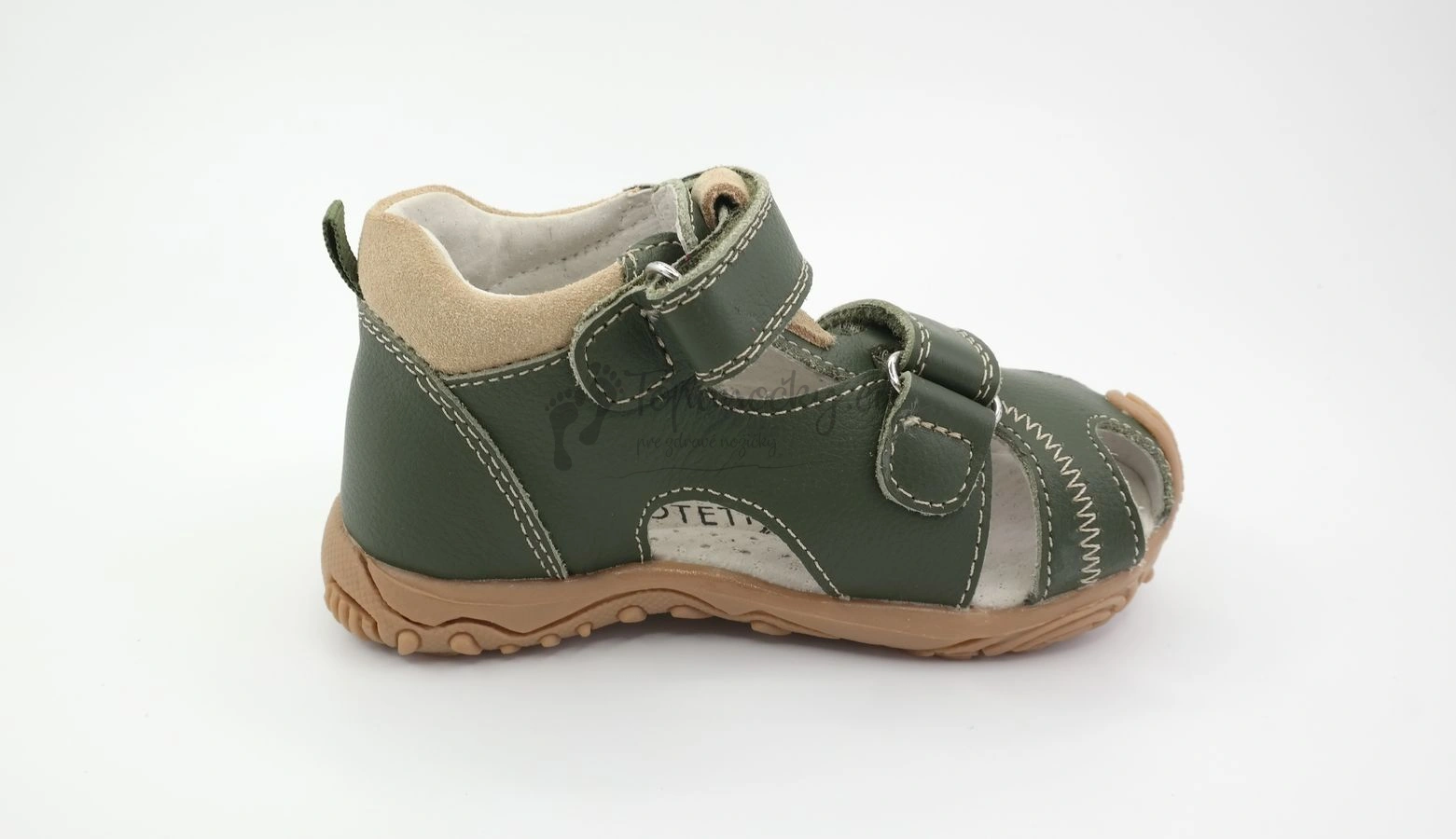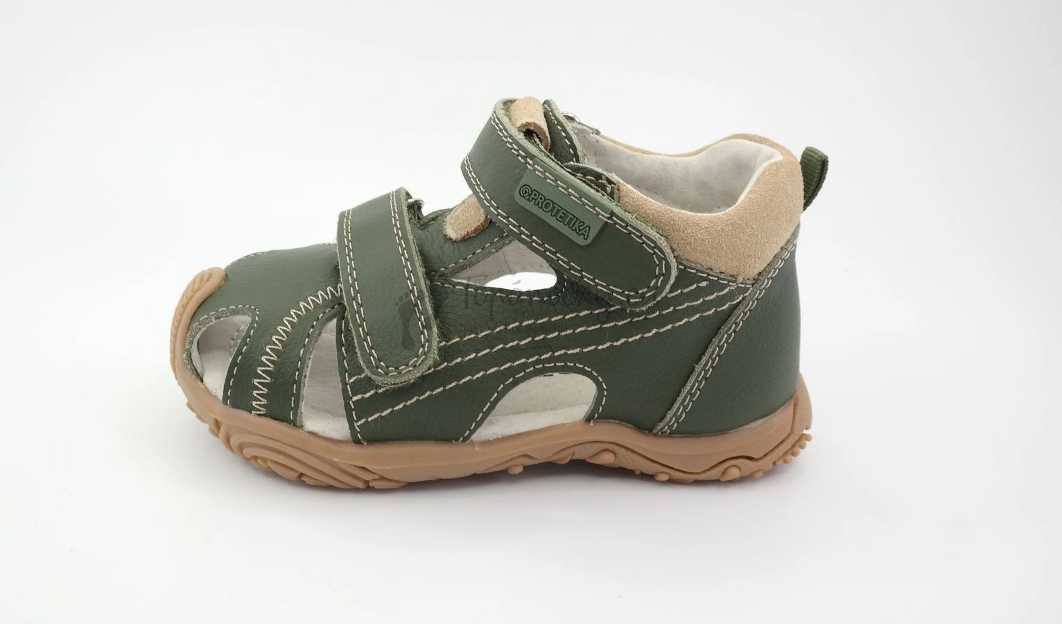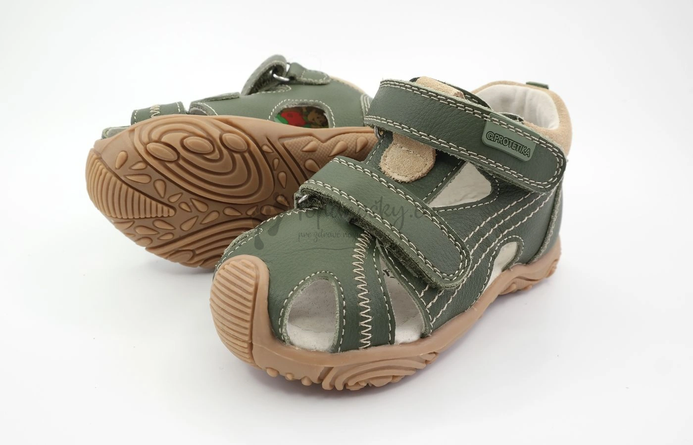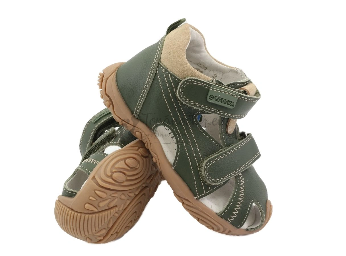 Letné sandálky z dielne slovenského výrobcu firmy Protetika. Podrážka z gumy je výrazne vyvýšená a chráni topánky pred predčasným okopaním. Je mierne ohybná v smere chôdze. Farebná kombinácia v podobe vojenskej zelenej a béžovej je veľmi pekná. Podrážka je béžovej farby. Vonkajšia časť je prevažne tvorená usňovou kožou zelenej farby. Vrchná packa prechádza cez kúsok béžovej brúsenej kože, táto koža je aj okolo členka. Prešitie je taktiež béžové. Vnútro je z bielej kože. Stielka je anatomicky tvarovaná, teda má prvok na podporu klenby. Zapínanie je na dva suché zipsy. Na topánkach sa nachádza dovedna osem otvorov.