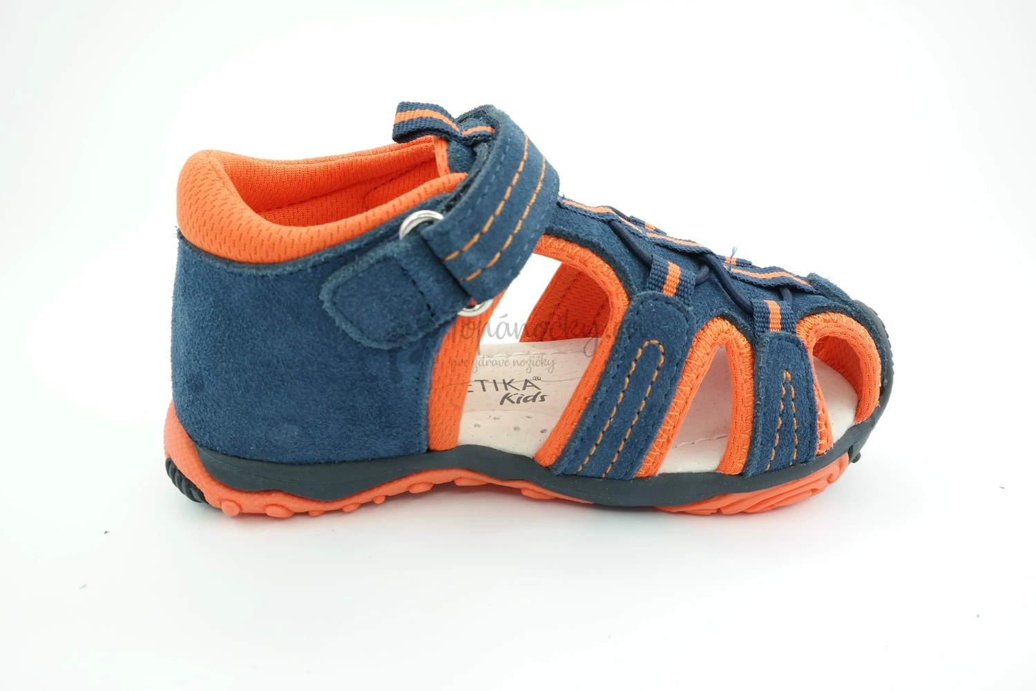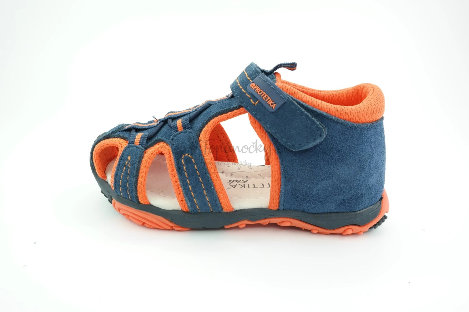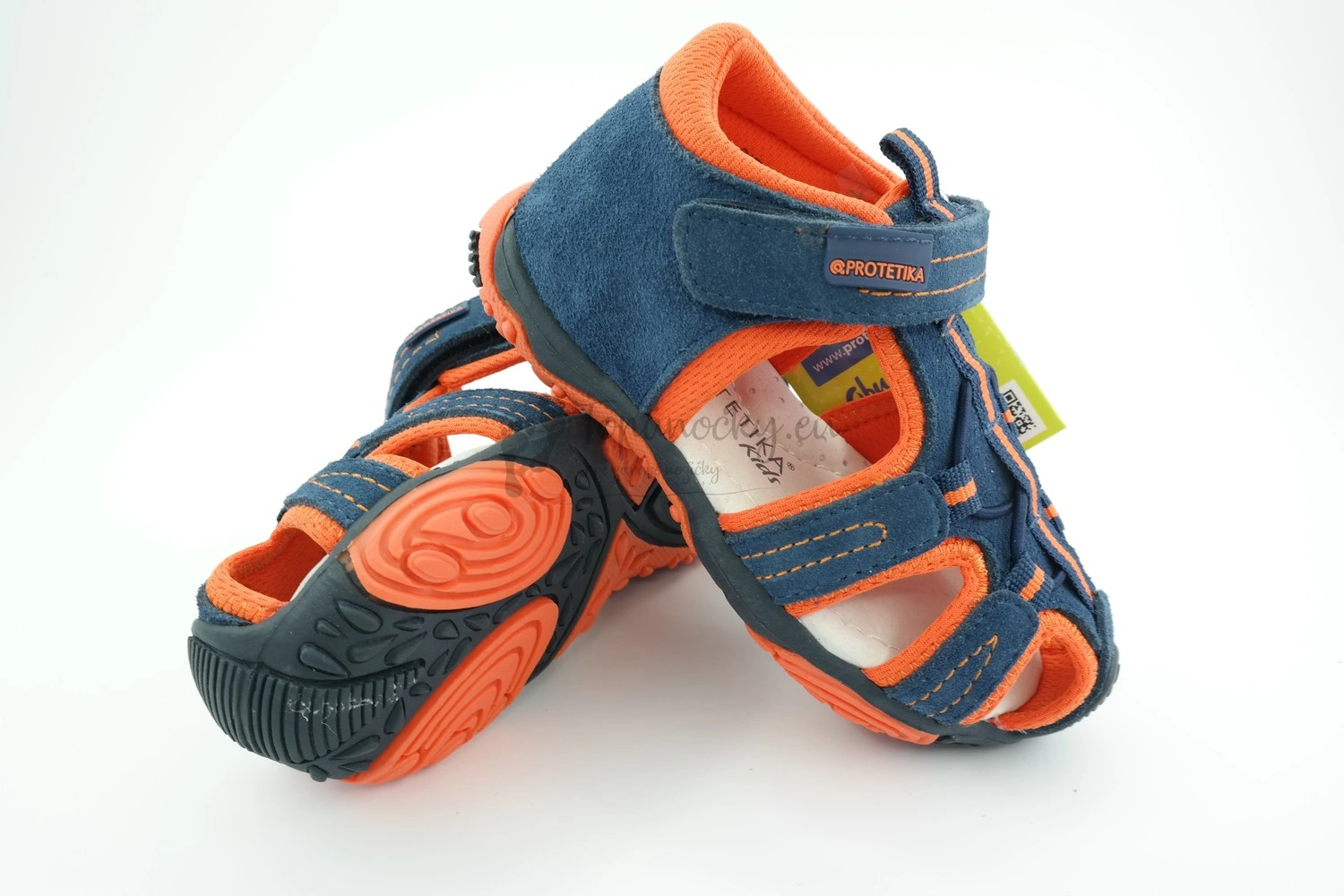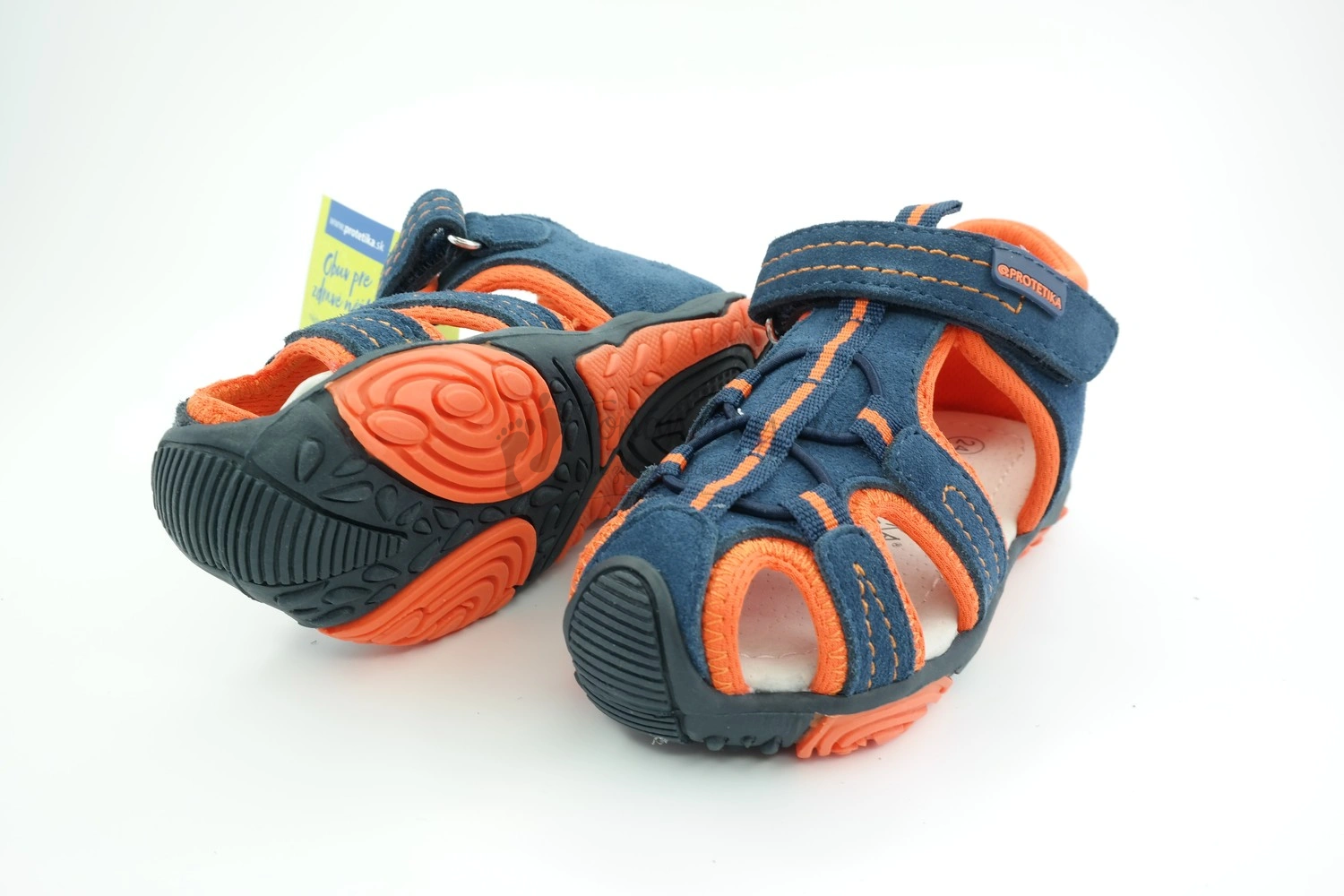 Detské sandálky značky Protetika Sid Orange spĺňaju všetko, čo by mali kvalitné sandálky mať. Spevnený členok, vyvýšená podrážka proti okopaniu, ktorá zároveň chráni palce a najmä dostatok otvorov, ktoré zabezpečia dostatočnú priedušnosť topánok. Sandále sú tmavomodrej farby s výraznými oranžovými detailami a výstelkou. Stielka je kožená a podrážka je čierna so oranžovými kruhmi.