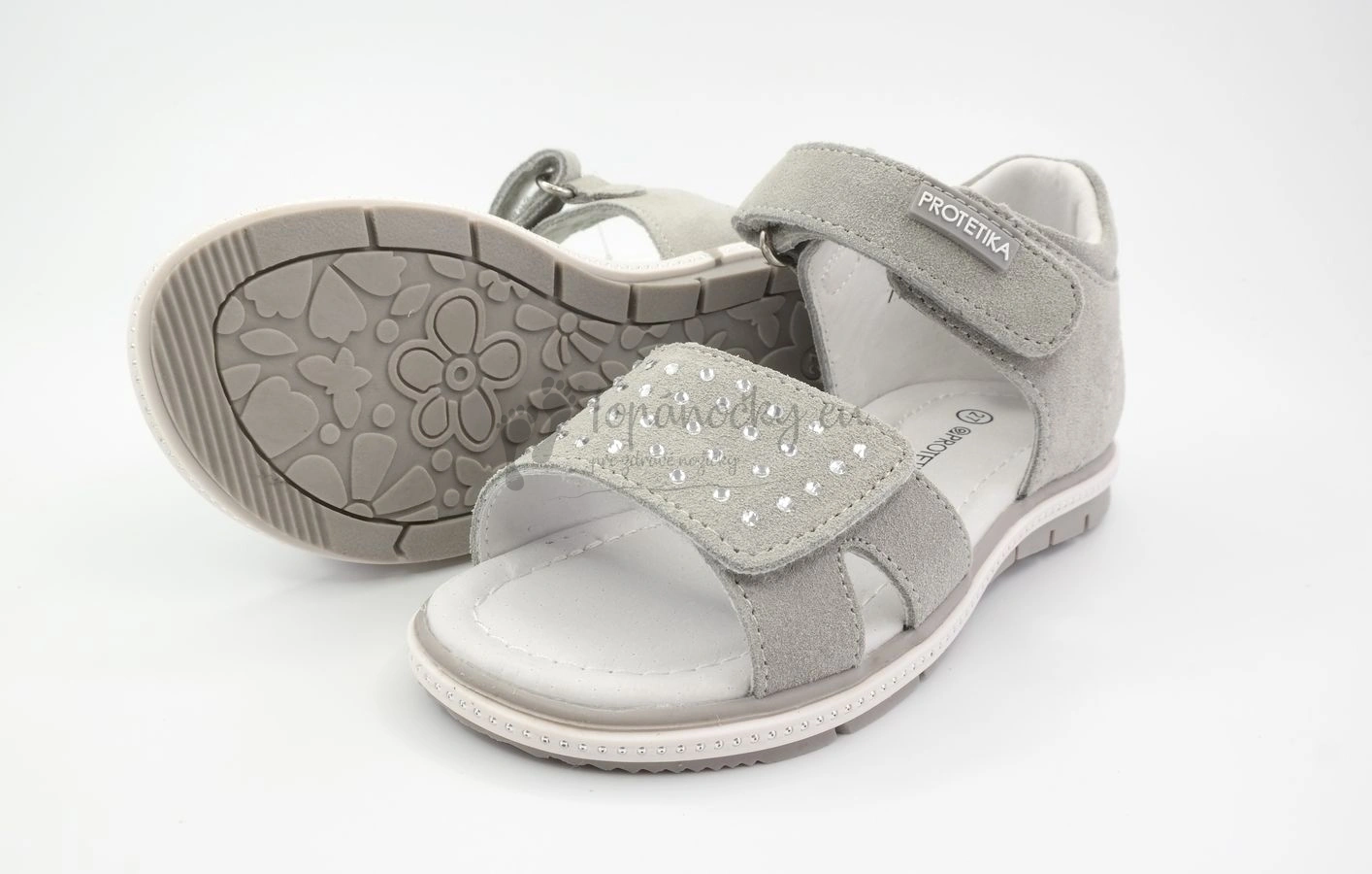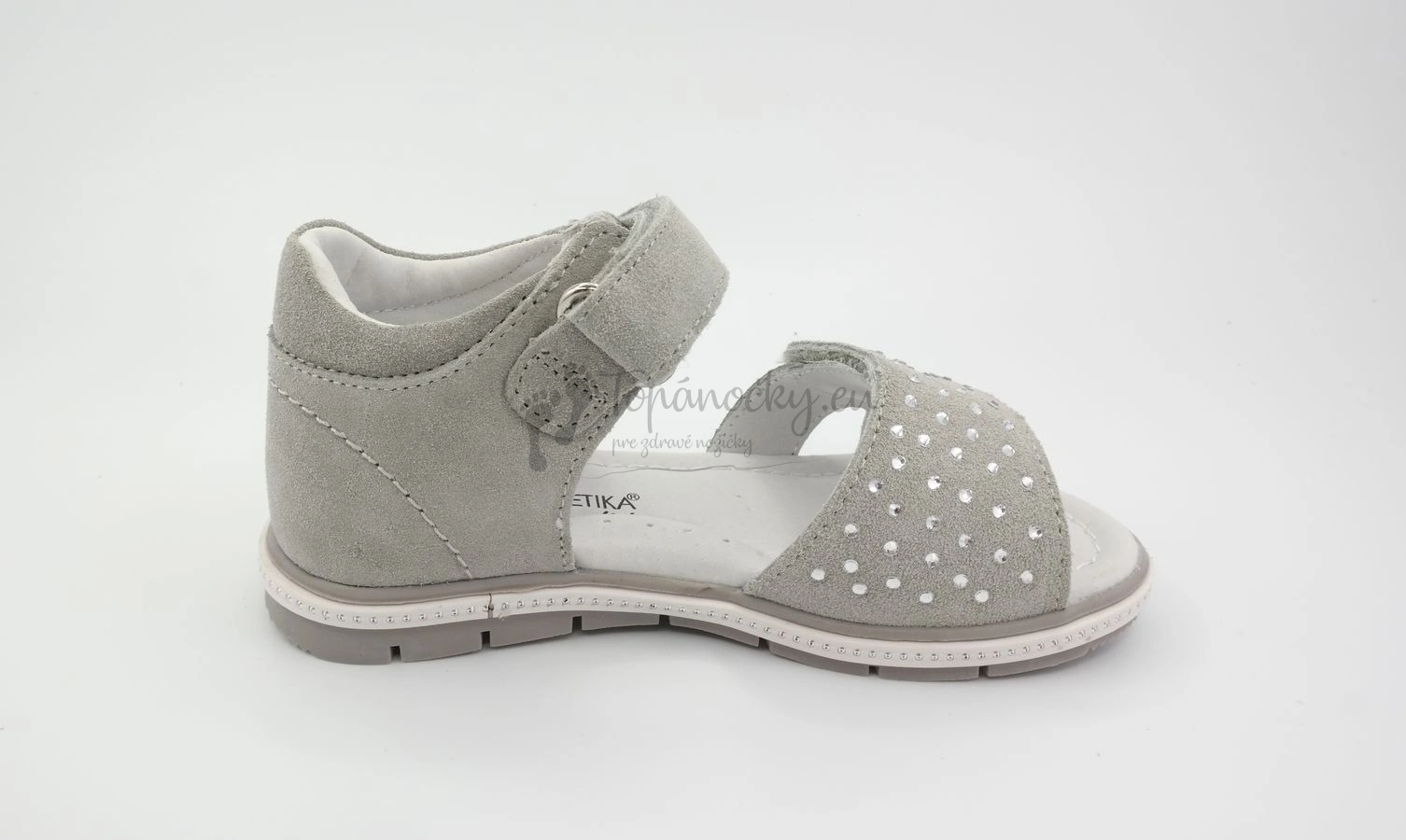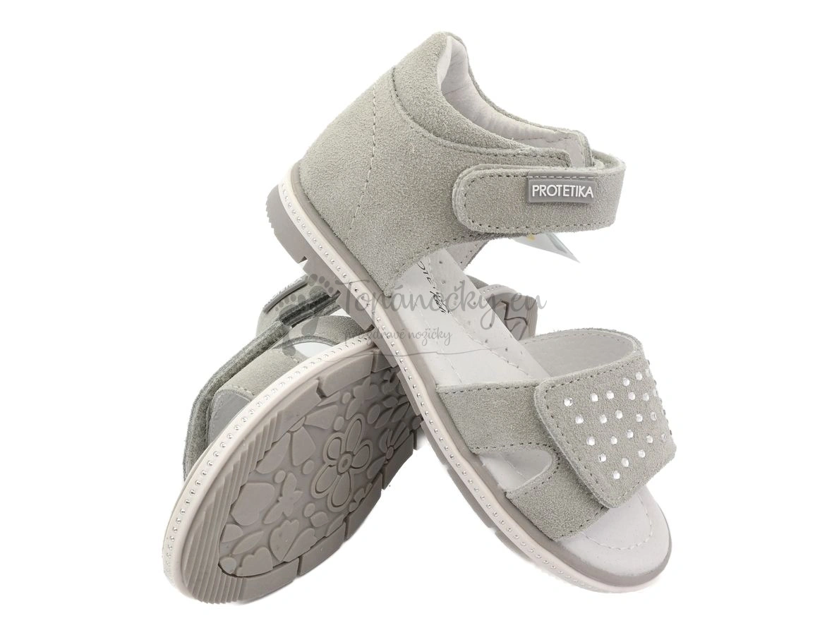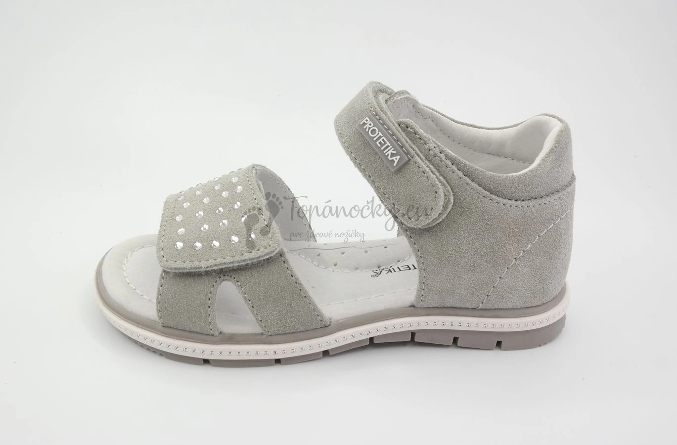 Šedé sandále určené pre väčšie slečny. Podrážka je hrubšia a je zložená z troch častí. Prvá je šedá, nad ňou je tenký biely lem, ktorý je vybíjaný a nad týmto lemom je ďalšia šedá časť. Vzhľadom k hrúbke podrážky, je ohybná len v smere chôdze. Zvršok je zo šedej brúsenej kože. Palce sú úplne voľné, päta je pevná. Prešitie je bielou niťou. Sandále majú dve pracky, z toho jedna je širšia a druhá užsia, obe sa zapínajú na suchý zips. Na širšej pracke sú biele kamienky. Vnútro je z bielej kože. Stielka je tvarovaná.