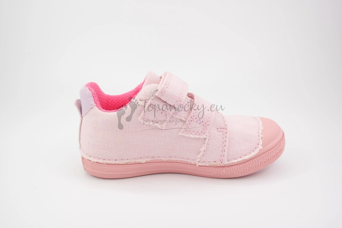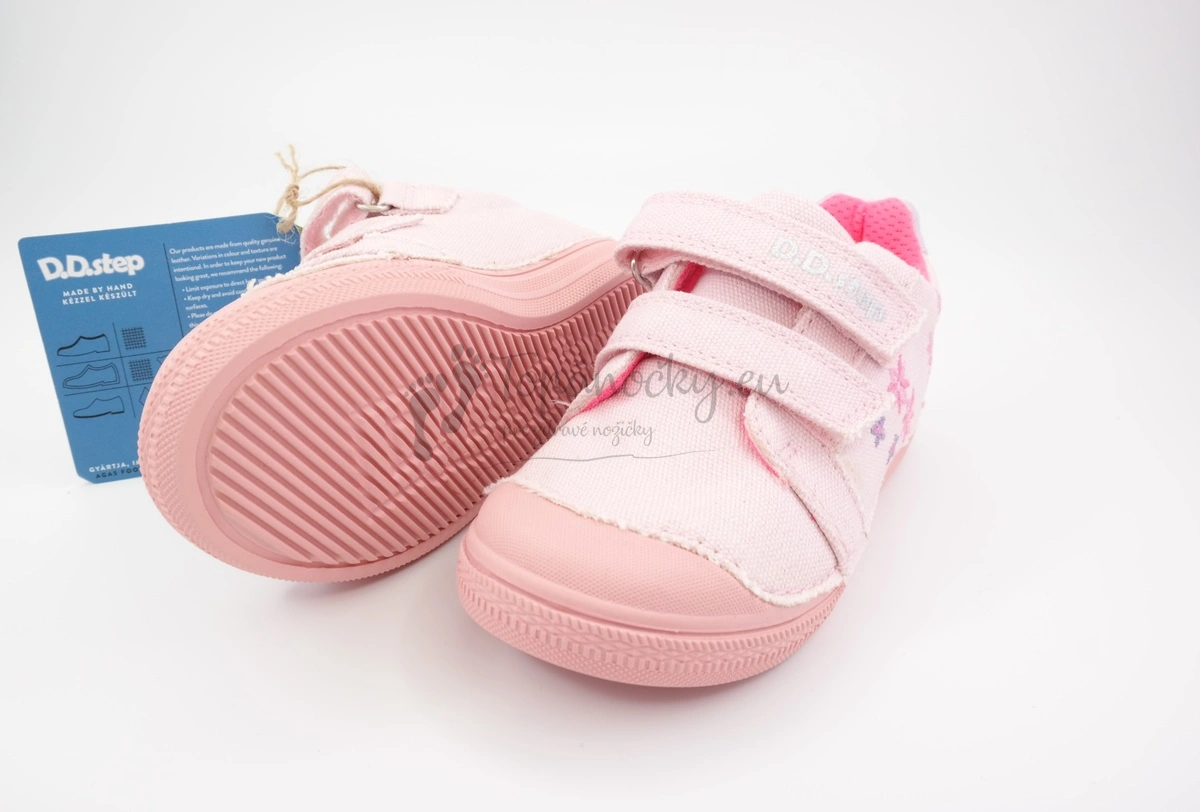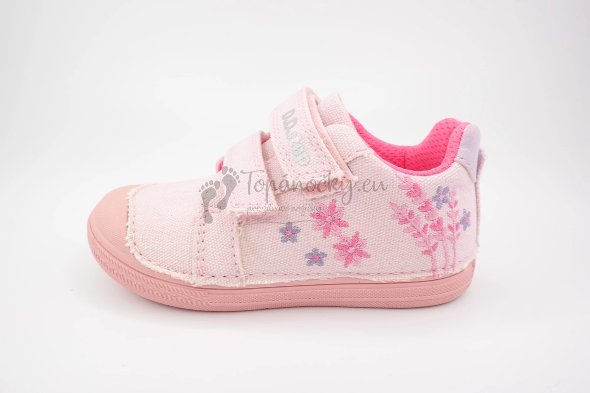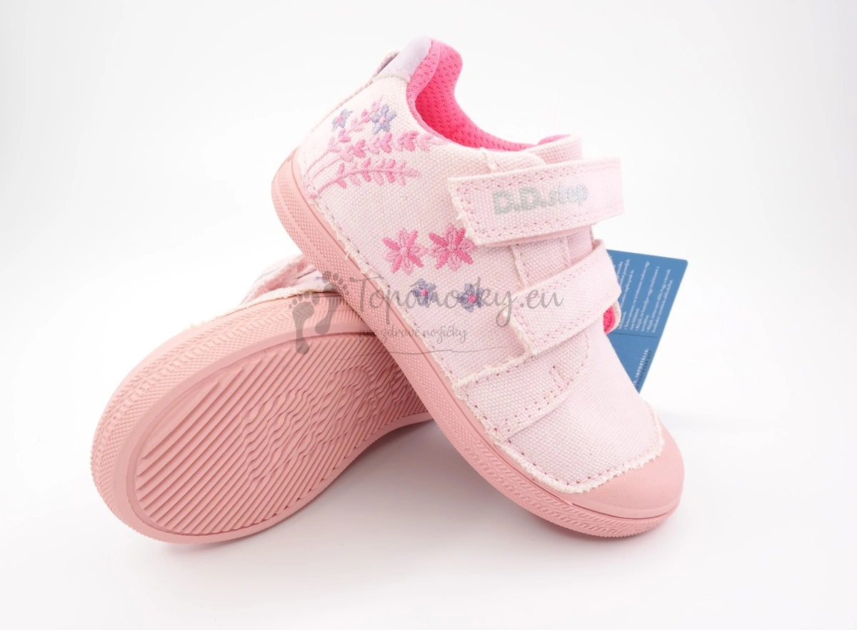 Dievčenské plátenné topánky vyrábané firmou D.D.Step. Tieto plátenky majú podrážku ružovej farby, ktorá vprednej časti siaha až do výška palcov a je jemne ohybná. Zvršok je tiež ružovej farby, ale úplne jemnej. Na jednom boku topánok je nachádzajú vyšité kvietky, ktoré sú v ružových a fialových odtieňoch. Okolo členka je kúsok kože s trblietkami. Vnútorná výstelka je mäkká a je zo sieťovinovej textílie. Stielka je kožená, vyberateľná a s podporou klenby. Zapínanie je na dva suché zipsy.