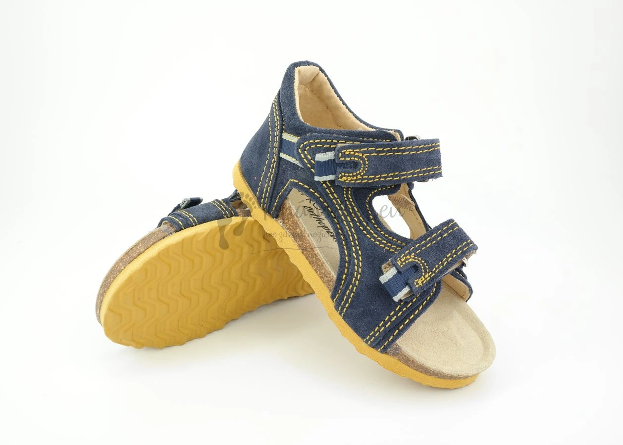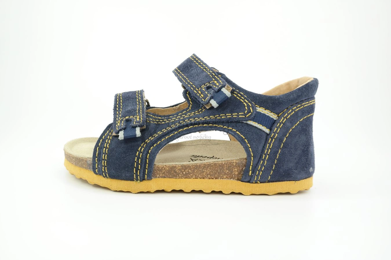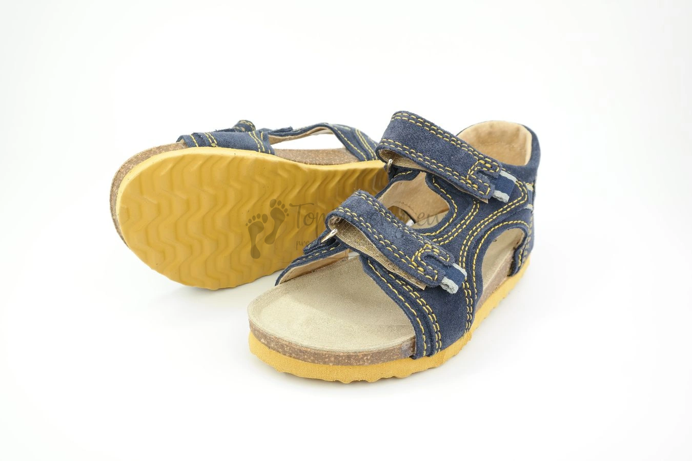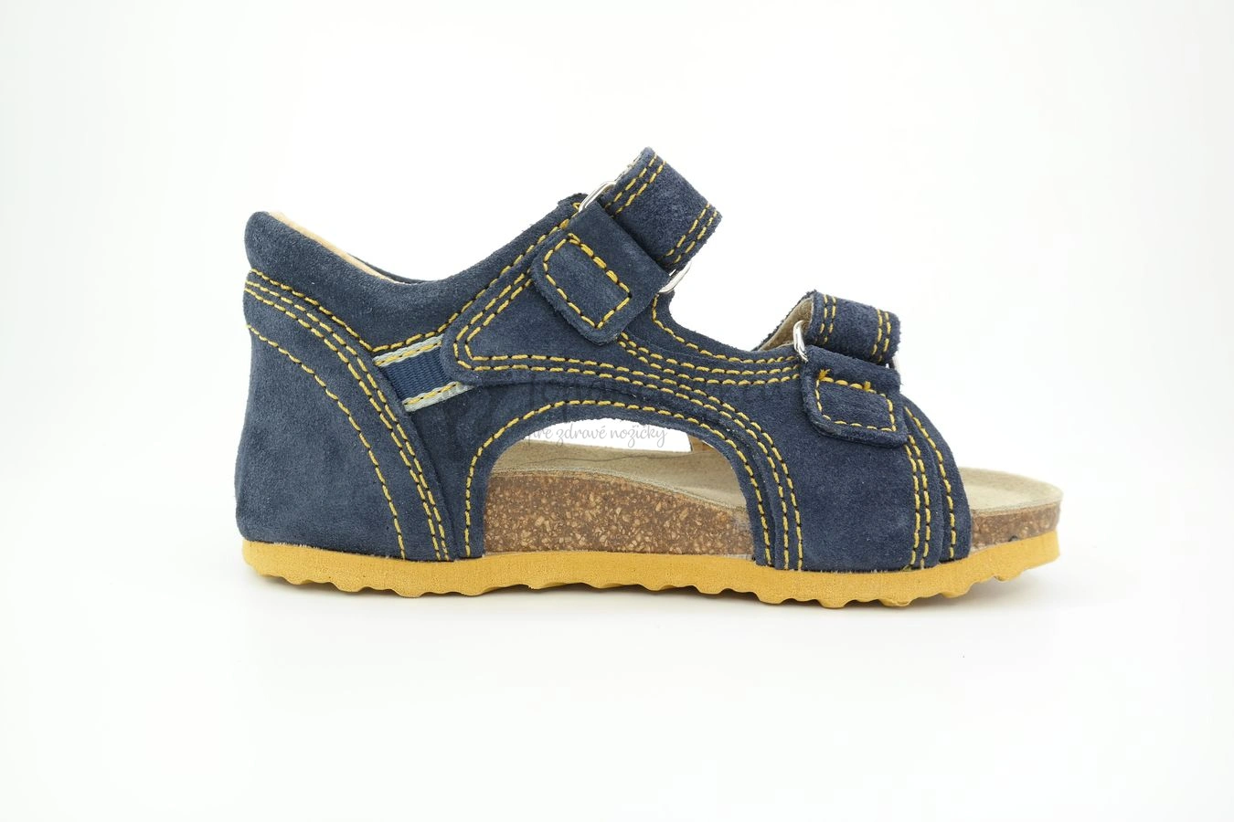 Ortopedicko-rehabilitačné detské sandále, ktoré sa dajú sa použiť aj ako prezúvková obuv na doma či do školy. Podrážka sandálok má výraznú žltú farbu a je značne rozbrázdená. Na ňu nasadá korklatexový výlisok s anatomicky tvarovanou koženou stielkou, ktorá má svetlobéžovú farbu. Na stielke sa nachádza lôžko pre palce a prsty, pozdĺžná a priečna klenba a taktiež aj lôžko pre pätu. Zvršok je z prírodnej brúsenej kože. Koža je tmavomodrej farby. Prešitie je niťou rovnakej farby ako je podrážka. Tieto žlté detaily robia dizajn sandálok zaujímavejší. Pod brúsenou kožou sa ešte nachádza koža prírodnej hnedej farby. Tá vystieľa aj oblasť päty. Zapínanie je na dve pracky, ktoré za zapínajú pomocou suchého zipsu. Päta je celá a výrazne pevná. Palce sú voľné.