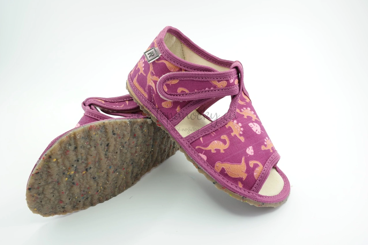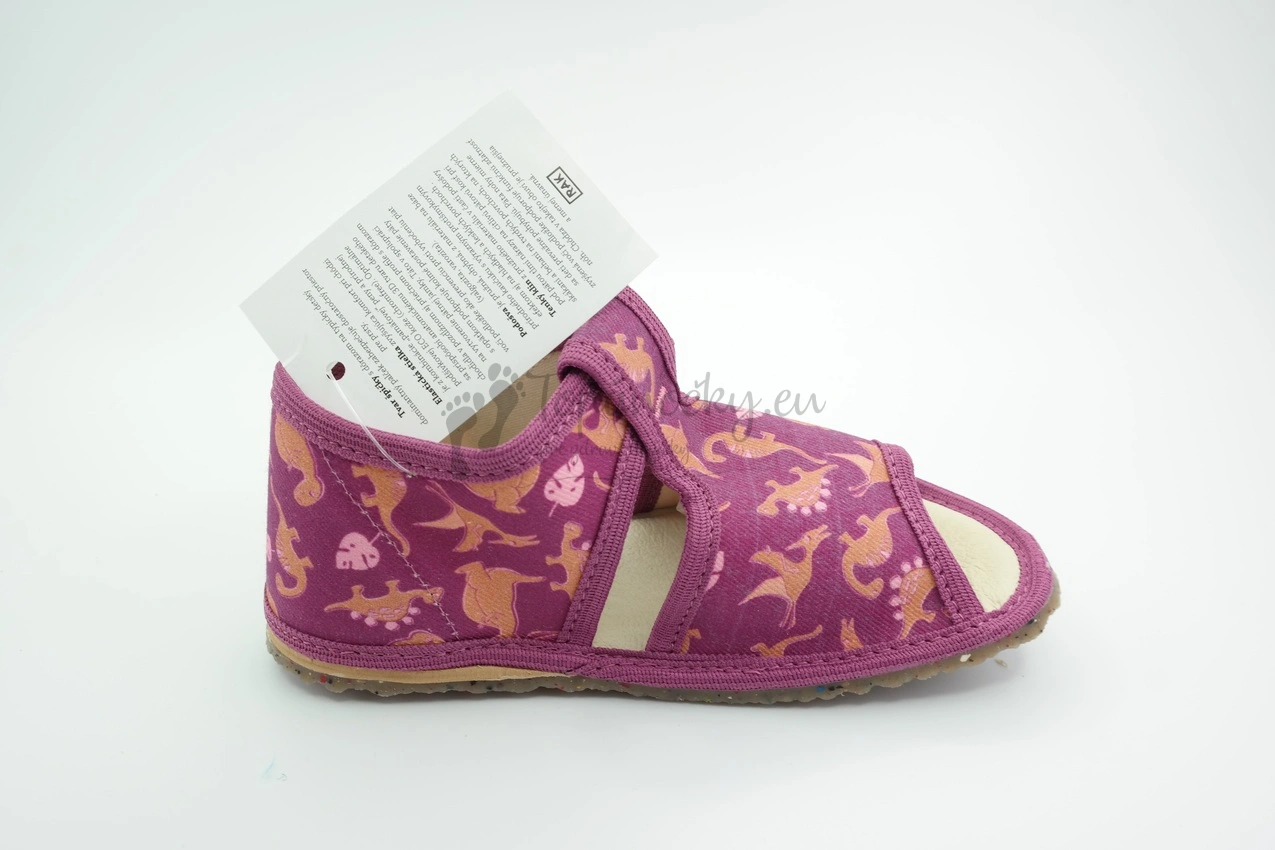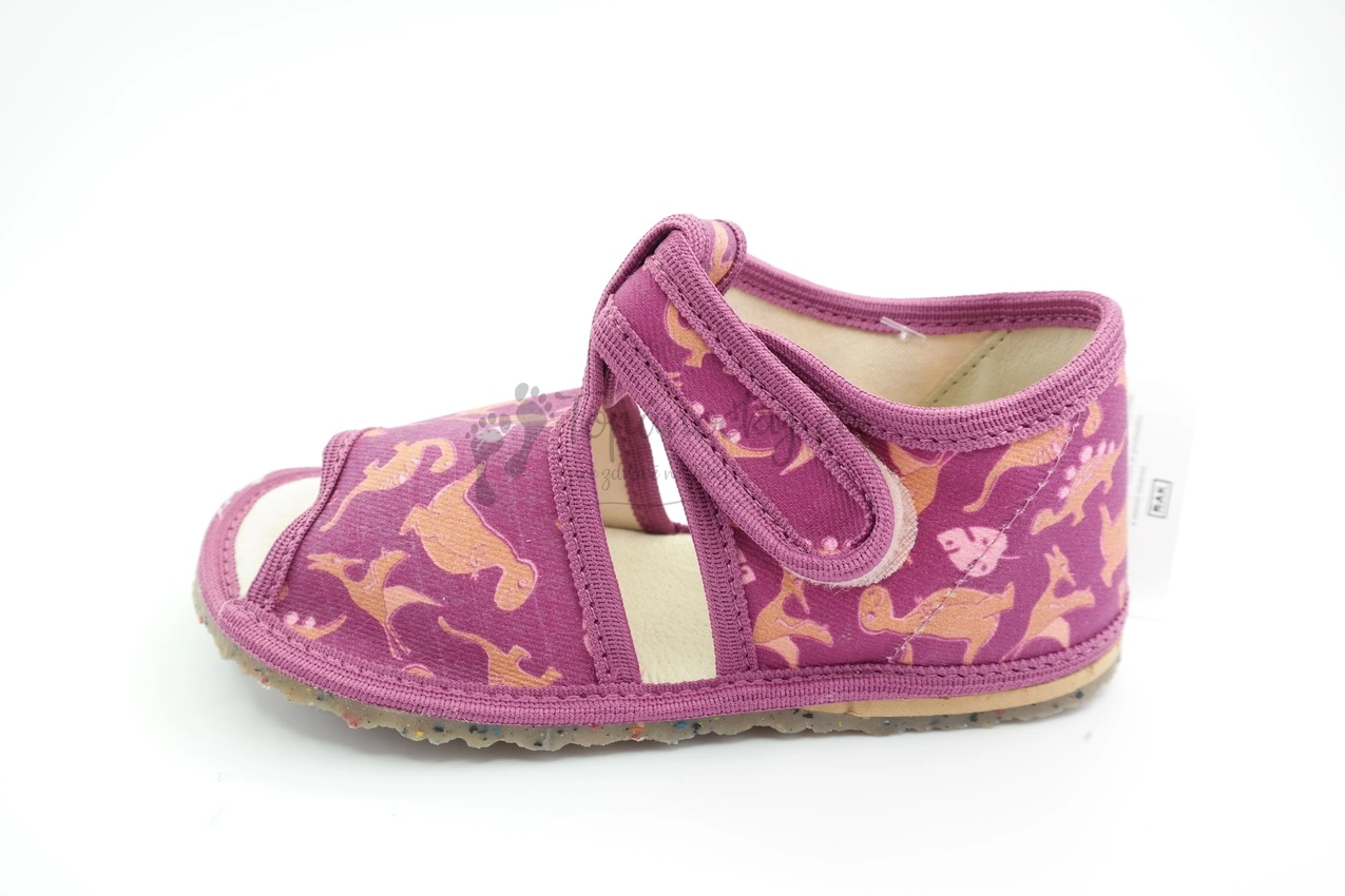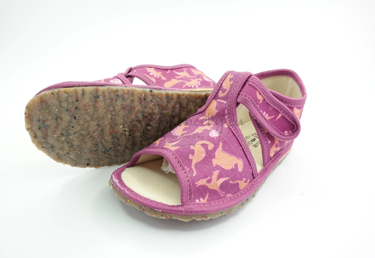 Detské inovatívne papučky s otvorenou špicou, vďaka ktorej je nožička lepšie vetraná a nedochádza k nadmernému poteniu. Podošva týchto papučiek je výrazne pružná, je hnedej farby a obsahuje aj recyklovaný farebný gumený granulát, takže je ekologickejšou voľbou. Podrážka má aj výrazny protišmykový efekt vďaka zdrsneniu. Zvršok je z bavlnenej látky, ktorá je fialovej farby. Lem je taktiež fialový. Na látke je potlač dinosaurov v odtieňoch hnedej farby. Stielka je tvorená kombináciou pamäťovej peny a ECO kože, takže sa prispôsobí prirodzenej štruktúre chodidla. Oblasť päty je zvnútra topánok tiež spevnená kožou. Zapínanie je na suchý zips okolo členka.