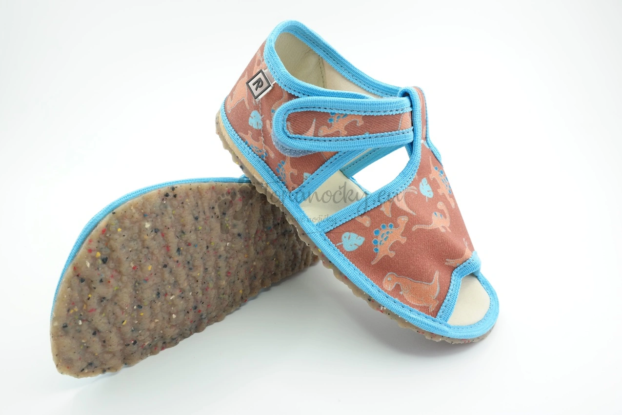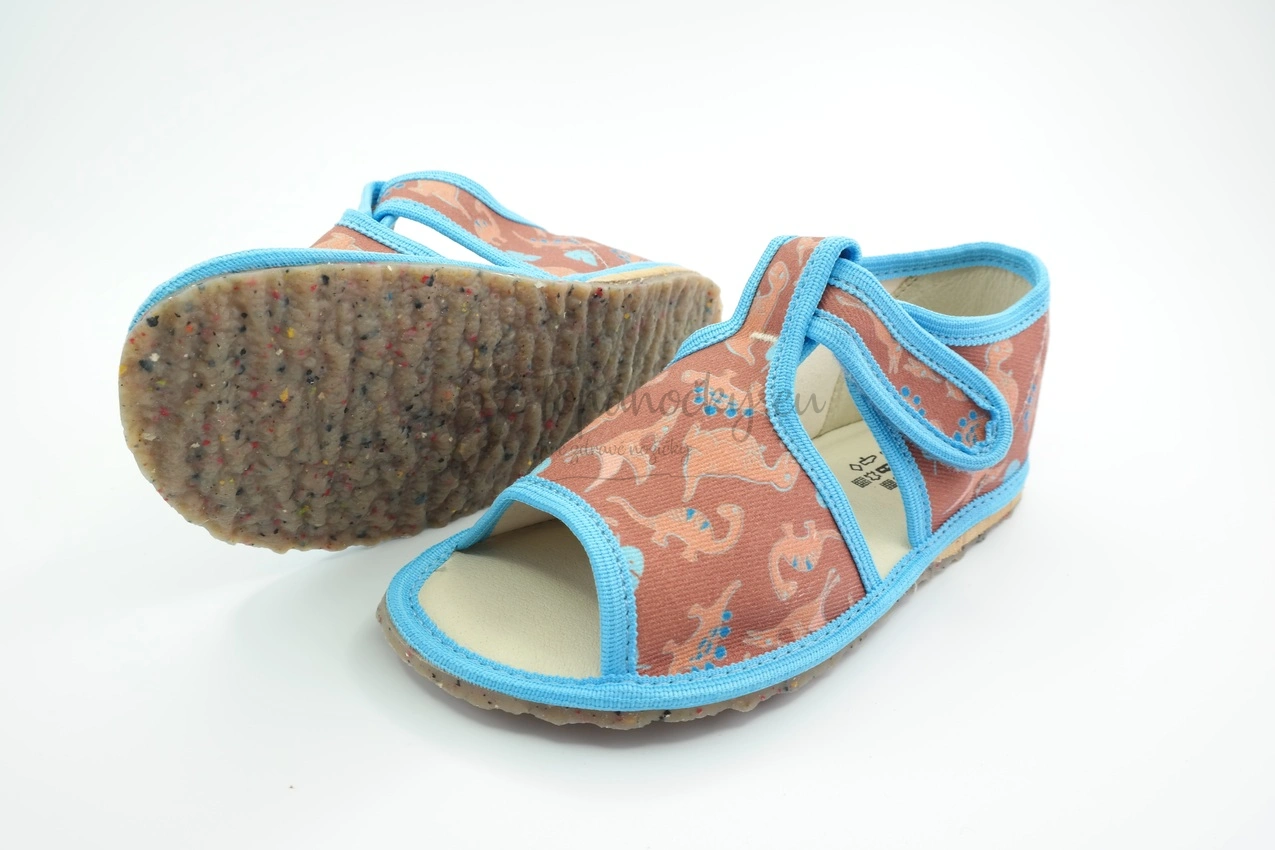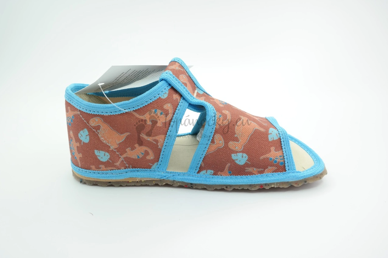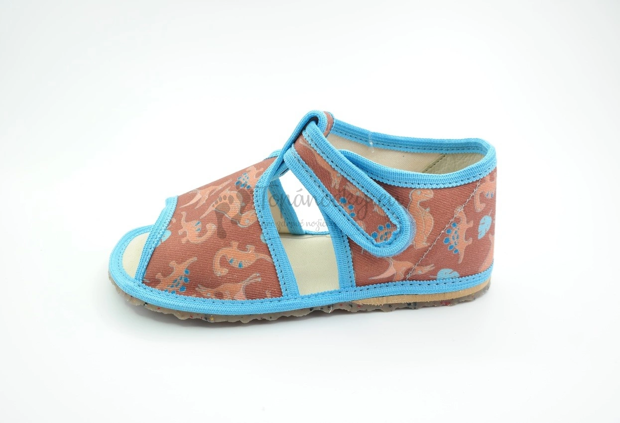 Detské inovatívne papučky s otvorenou špicou, vďaka ktorej je nožička lepšie vetraná a nedochádza k nadmernému poteniu. Podošva týchto papučiek je hnedej farby a obsahuje aj recyklovaný farebný gumený granulát, takže je ekologickejšou voľbou. Je protišmyková. Zvršok je z bavlnenej látky, ktorá je olemovaná modrou farbou. Látka je hnedá s potlačou dinosaurov, ktorý sú tiež v odtieňoch hnedej farby. Stielka je tvorená kombináciou pamäťovej peny a ECO kože. Oblasť päty je zvnútra topánok tiež spevnená kožou. Zapínanie je na suchý zips okolo členka.