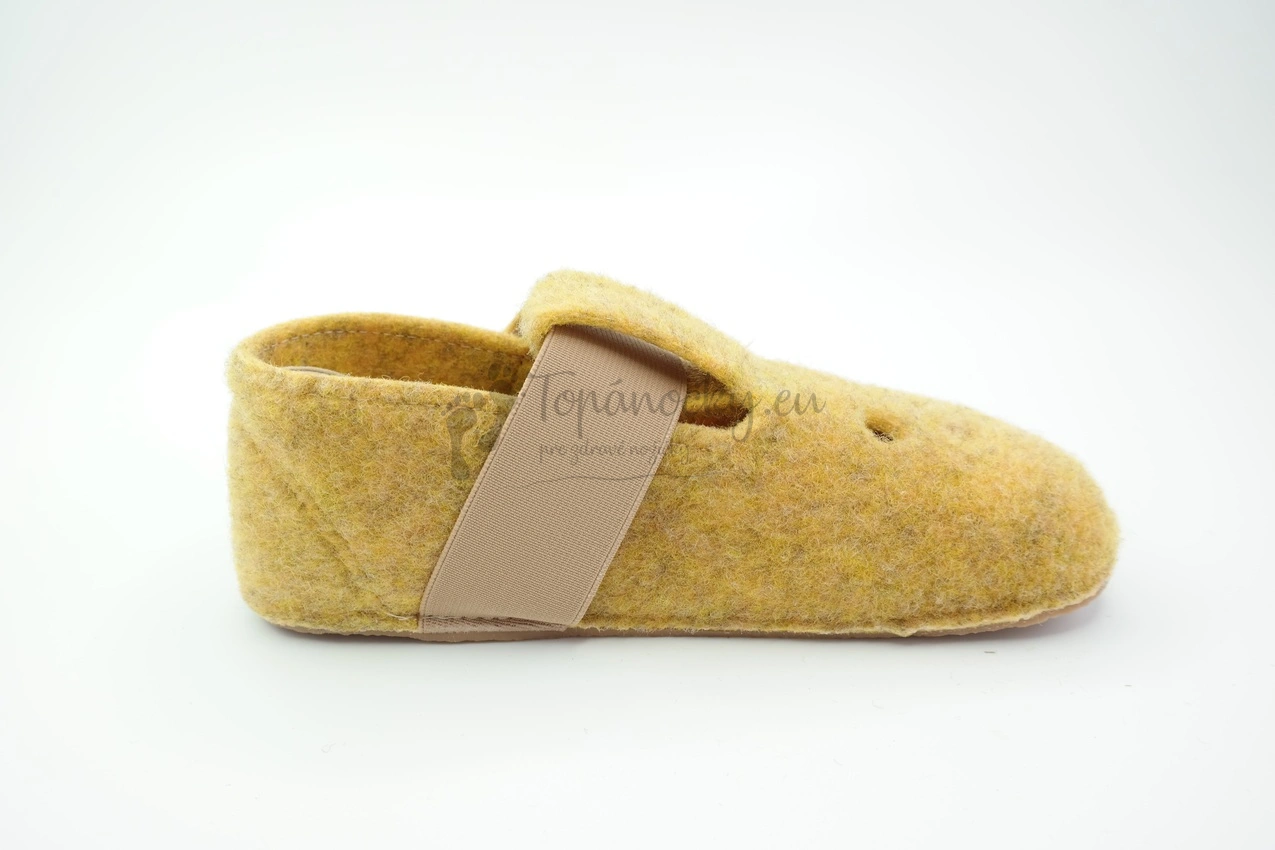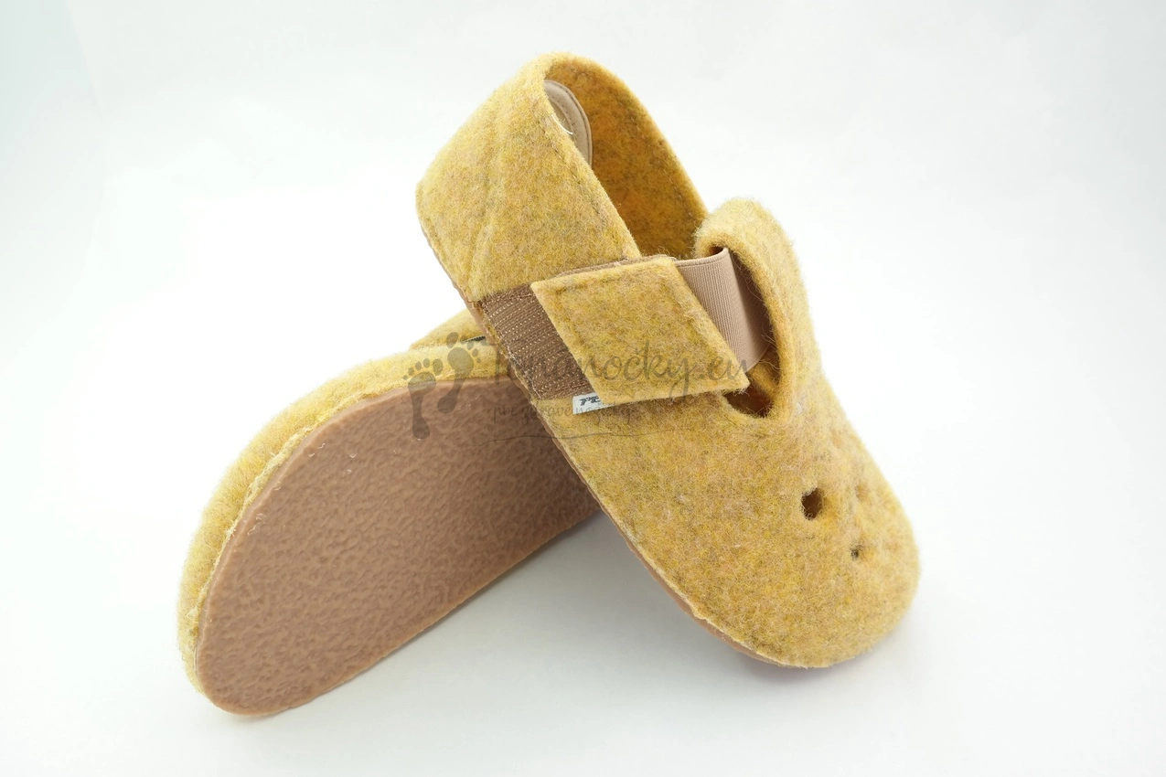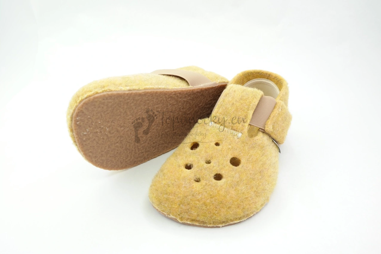 Žlté barefoot papučky, ktoré sú ušité z teplého a mäkkého filcu, ktorý má v oblasti priehlavku vetracie otvory. Podrážka papučiek je vysoko poddajná a tenká. Zvršok je z filcu a taktisto aj stielka. Tá je vyberateľná a rovná. V oblasti päty vo vnútornej časti sú papučky spevnené látkou. Zapínanie je na jeden suchý zips. Pracka je širšia a je z pružnej gumy. Papučky sadnú na nohu s dominatnými palcami i na nohu s úzkym členkom.
