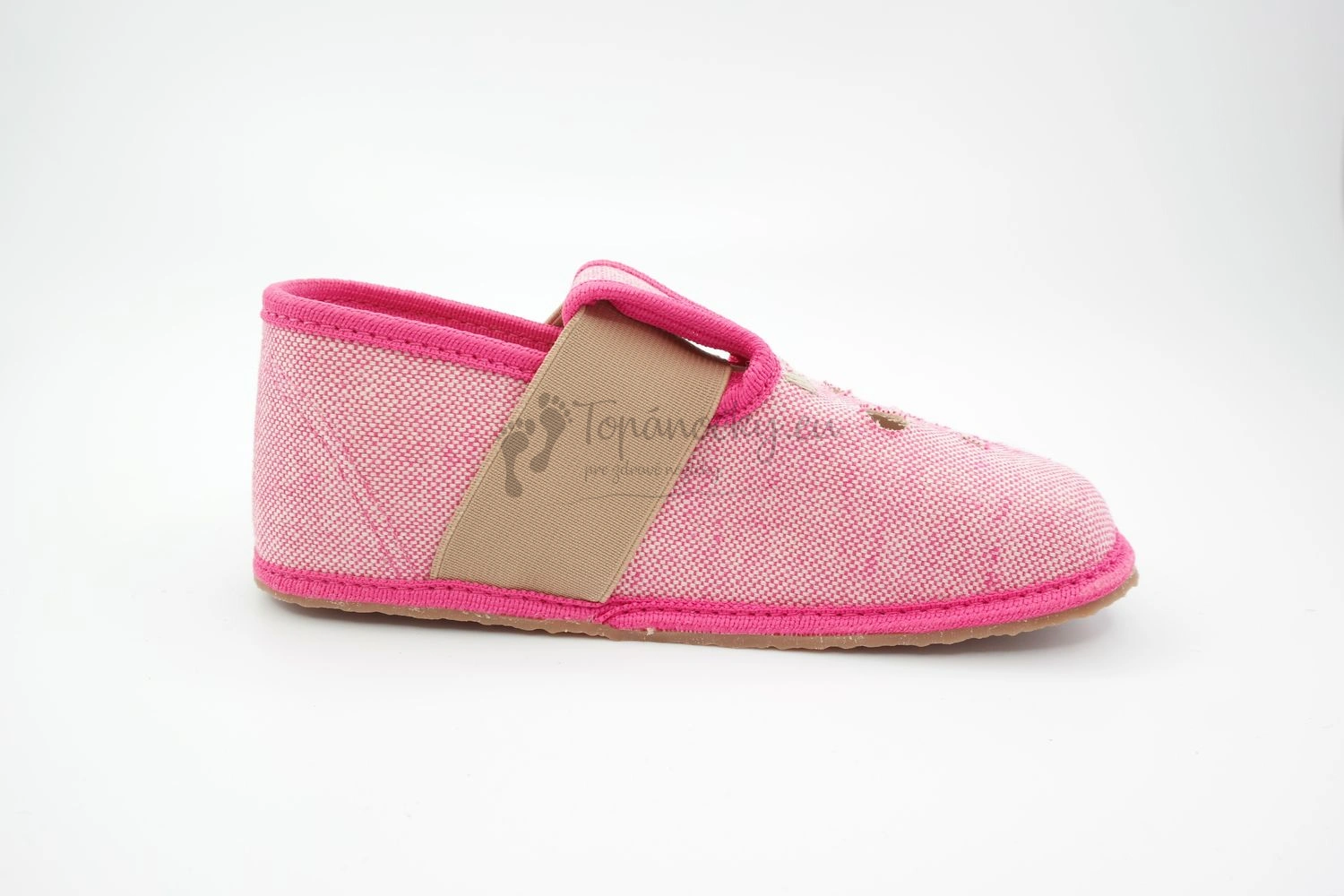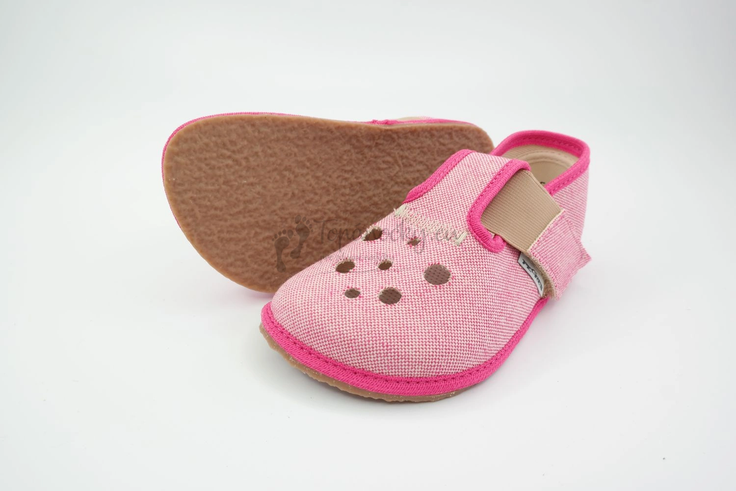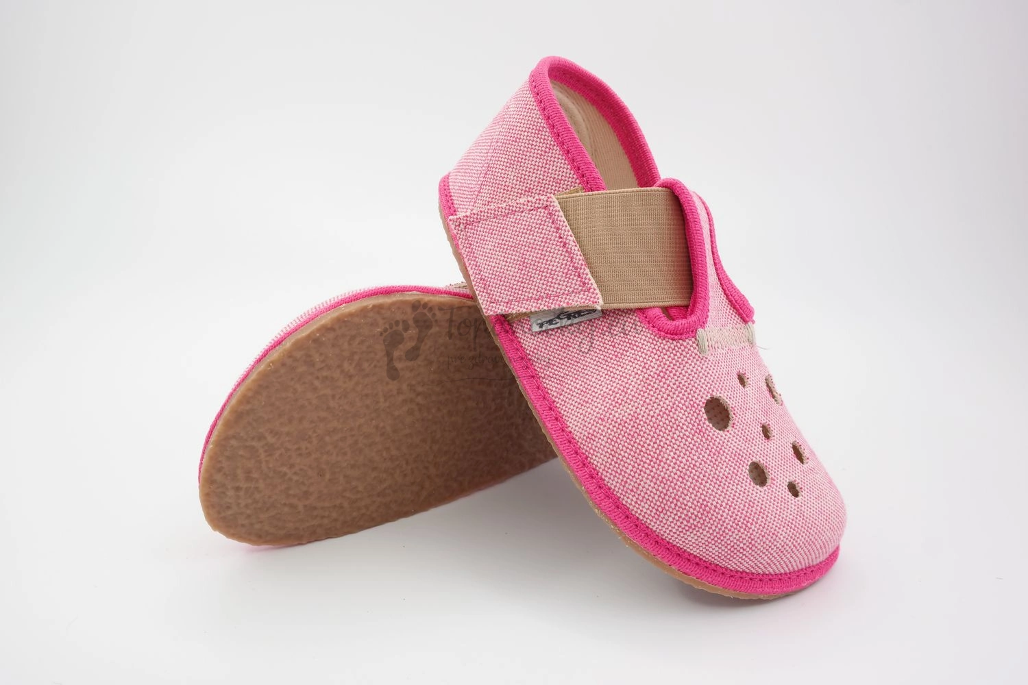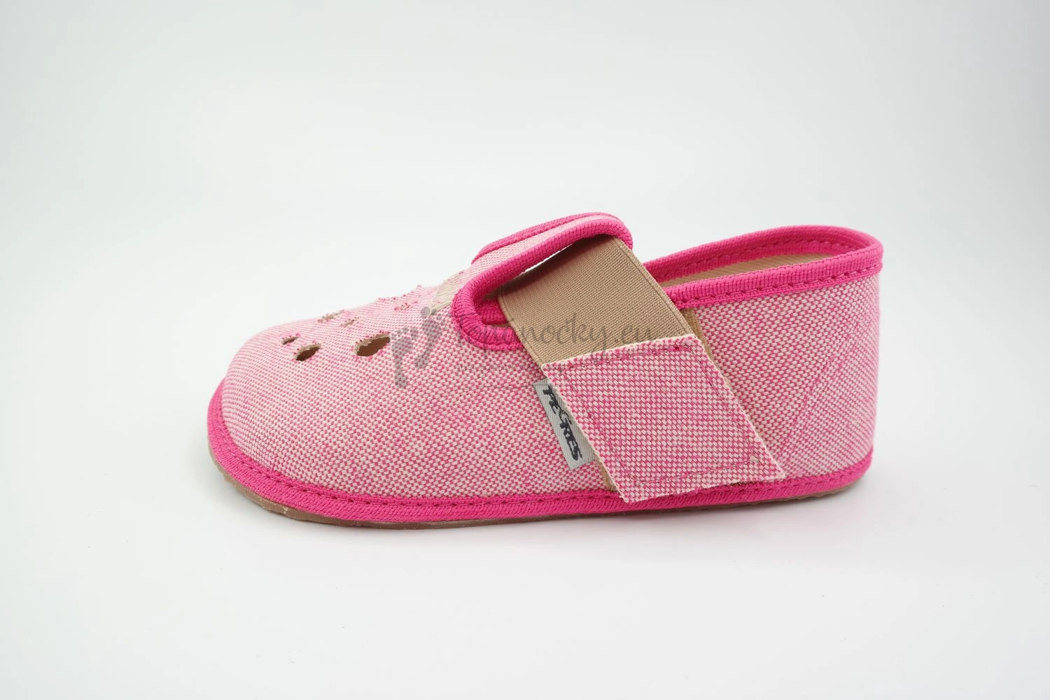 Ružové papuče značky Perges sú barefootoveho charakteru, čím zabezpečujú pohodlnú chôdzu dieťaťa, pretože imitujú chôdzu na boso. Zapínanie je na suchý zips v kombinácií s naťahovacou gumou. Dôležitou časťou papúč je anatomicky tvarovaná predná časť. Strih je predovšetkým zameraný na dominantný palec. Otvormi v prednej časti zabezpečujú vetranie nohy. Vhodné na interiérové nosenie.
