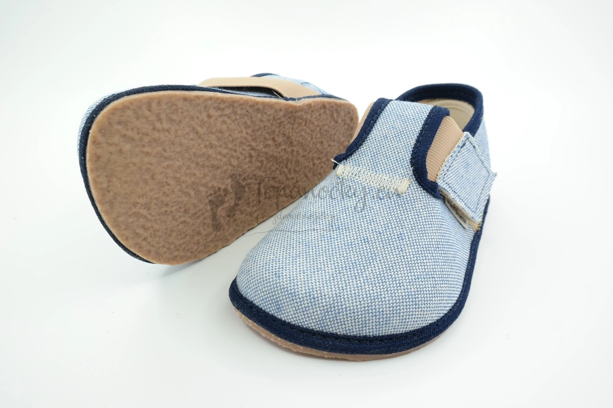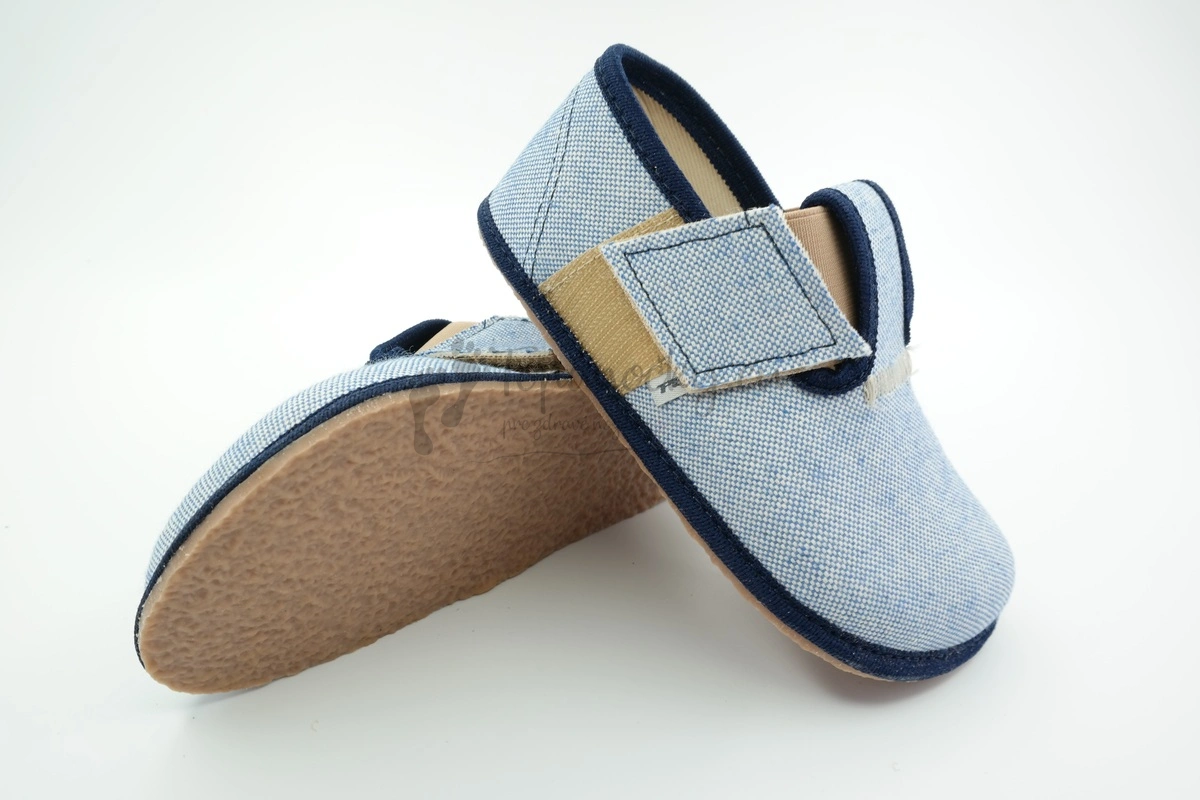 Barefoot papučky od českého výrobcu značky Pegres. Tieto papučky majú dostatočne široký priestorom pre detské palčeky. Podrážka je flexibilná, ohybná priečne aj pozdĺžne, päta je spevnená len minimálne. Papučky sú navyše veľmi ľahké. Podrážka má prírodnú hnedú farbu. Zvršok je z textiílie modrobielej farby. Olemovanie je modré. Vnútro je tiež textilné, oblasť päty je spevnená. Stielka je tenká, vyberateľná a rovná. Zapínanie je na suchý zips s kombinácii s naťahovacou gumou.