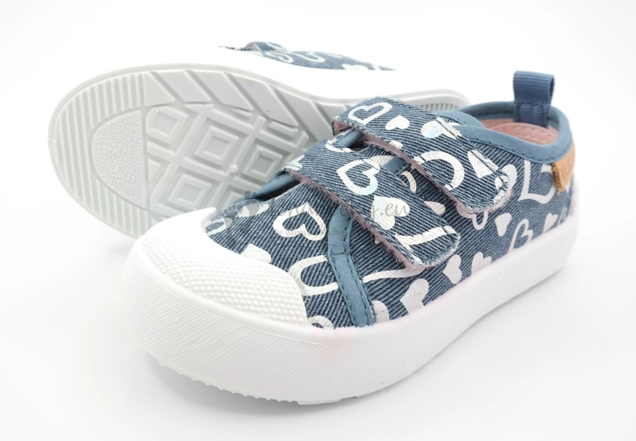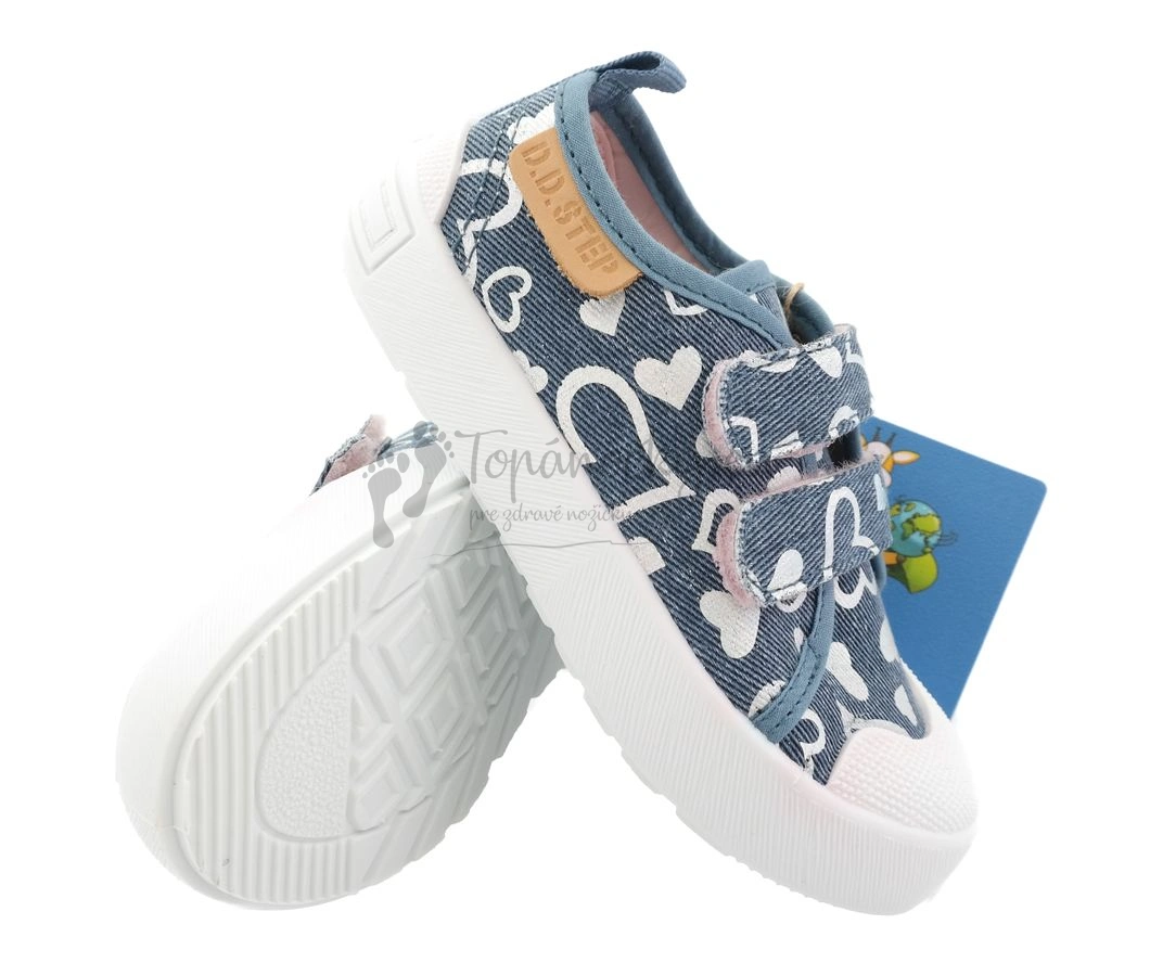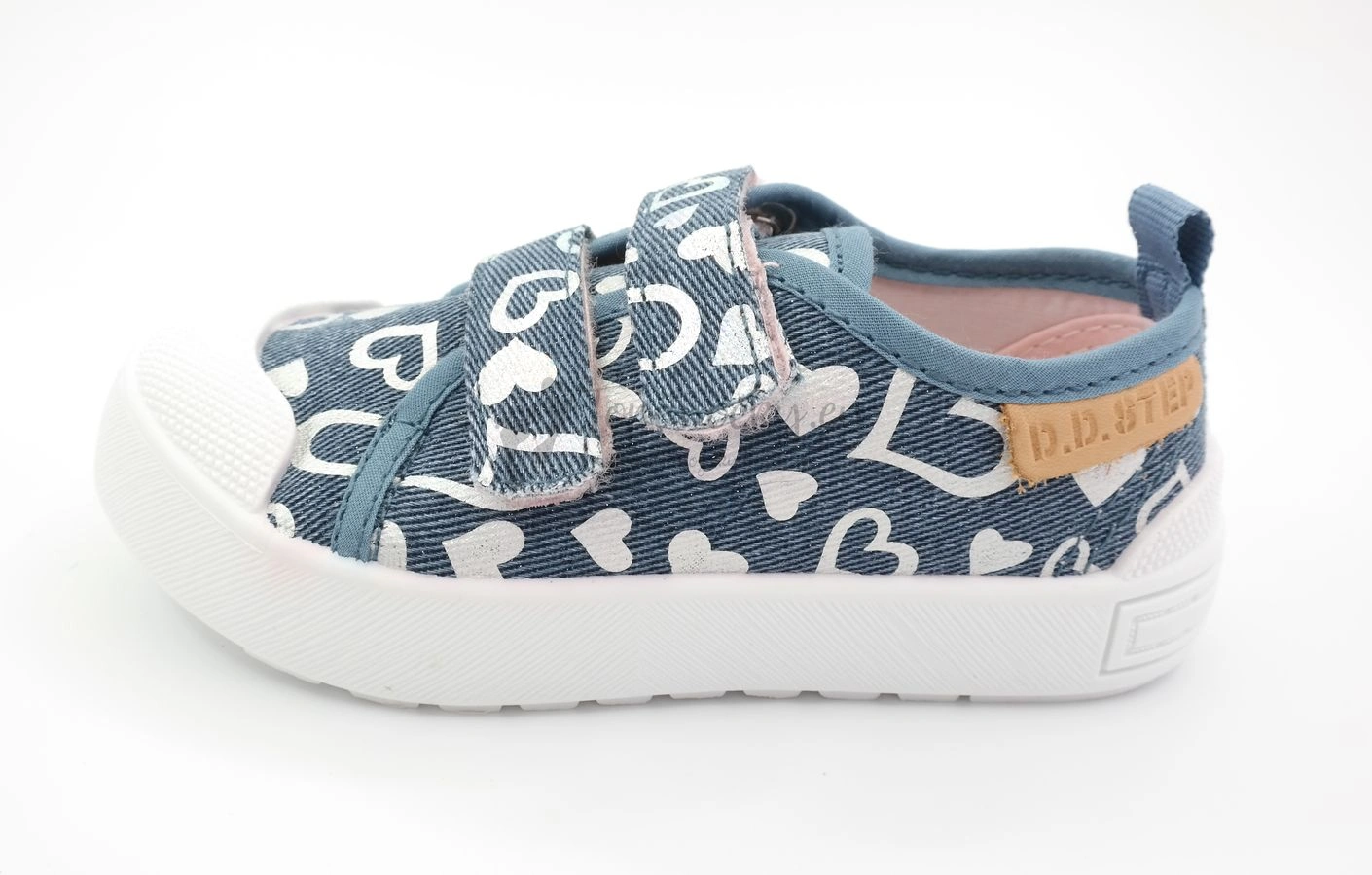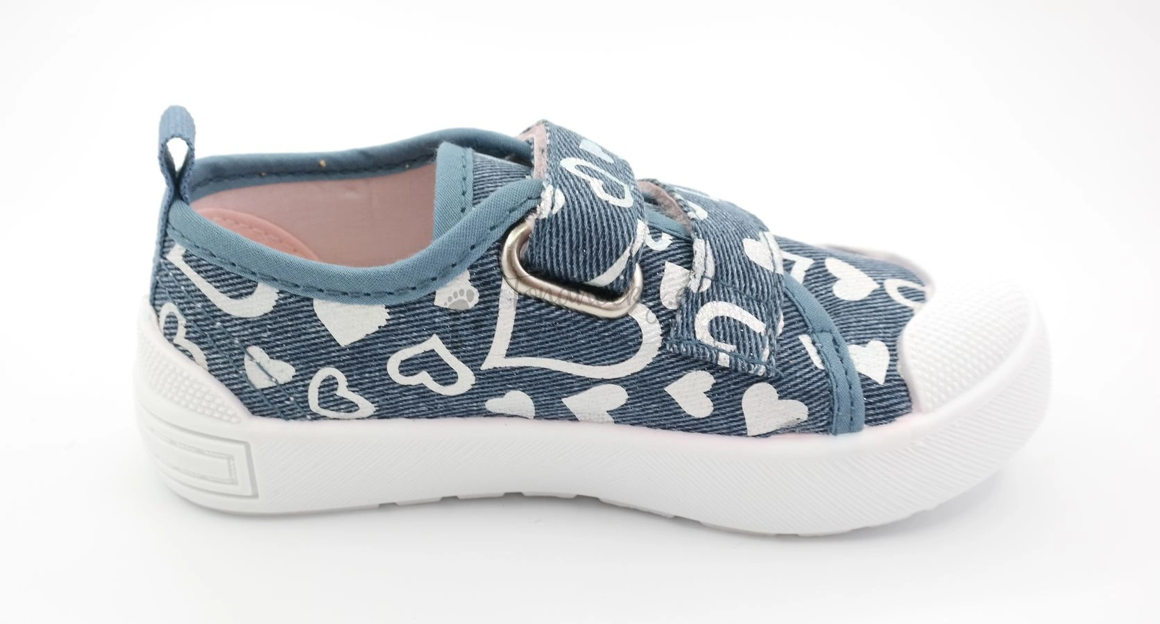 Plátenné topánky, ktoré majú veľmi pekný dizajn. Podrážka má bielu farbu a je jemny ohybná. Je vyvýšená na okope. Vprednej časti výraznejšie ako v zadnej. Zvršok je z látky, ktorá štruktúrou pripomína rifľovinu a má aj modrú farbu. Prešitie aj a olemovanie sú modrej farby. Po celej ploche látky sa nachádzajú potlacené strieborné srdiečka. Vnútro je vystlané svetloružovou látkou, ktorá je v oblasti päty zdvojená. Rovnakú ružobú farbu má aj suchý zips. Stielka je vyberateľná a je tvorená kombináciou peny a kože, ktorá je antibakteriálna. Zapínanie je na dva suché zipsy.