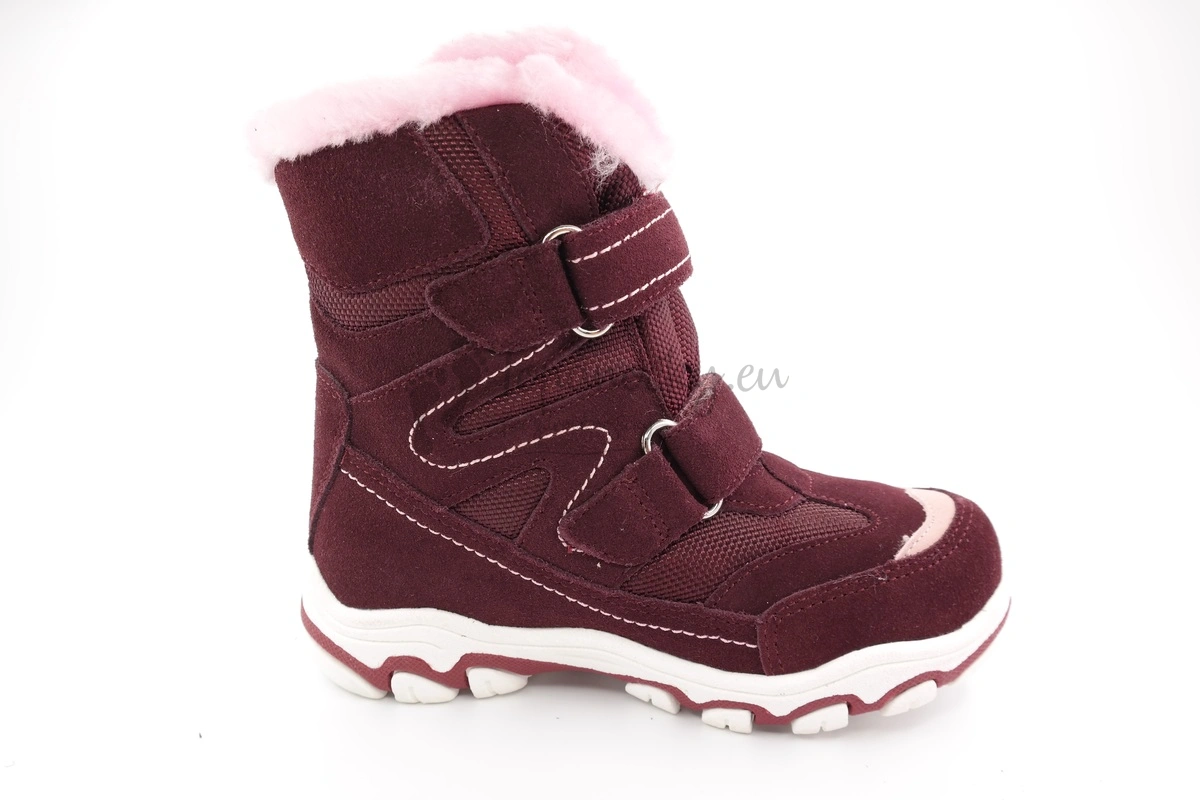 Zimné topánky s PRO-TEX membárnou, ktorá zabezpečuje maximálnu ochranu proti pretečeniu vody do vnútra topánok. Priespustnosť z vnútornej časti obuvi do vonkajšieho prostredia je zachovaná, takže topánky sú priedušné. Podrážka je biela s bordovými časťami, je pevná a vyvýšená po celom obvode. Zvršok je tvorený kombináciou brúsenej kože a hrubotkanej látky. Jazyk je vytvorený zo súvislej vrsty látky, nie je našitý. To tiež zamedzuje pretečeniu vody a premočeniu topánok. Vnútro je zateplené kožušinou. Kožušina je ružovej farby. Ružové je aj prešitie a tri kúsky kože, ktoré sú vložené ja jednom boku topánok a na priehlavku. Stielka je anatomicky tvarovaná, vyberateľná a zateplená. Zapínanie je na dva suché zipsy.