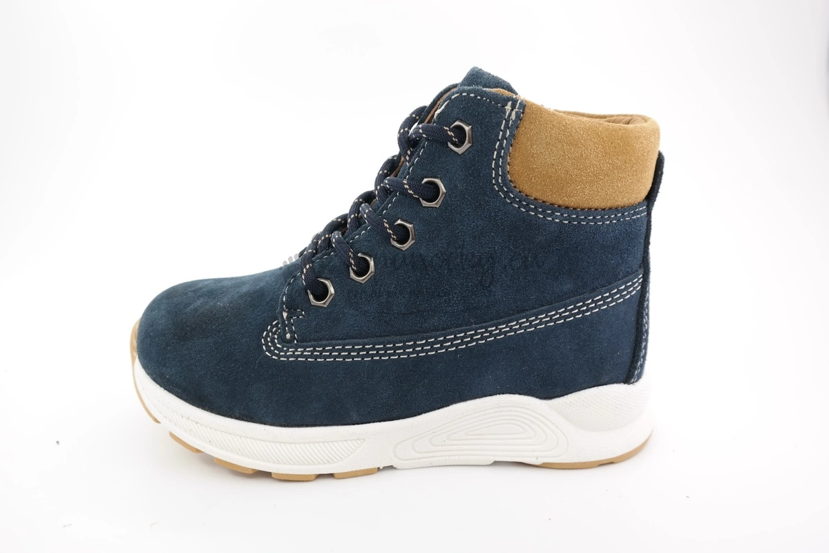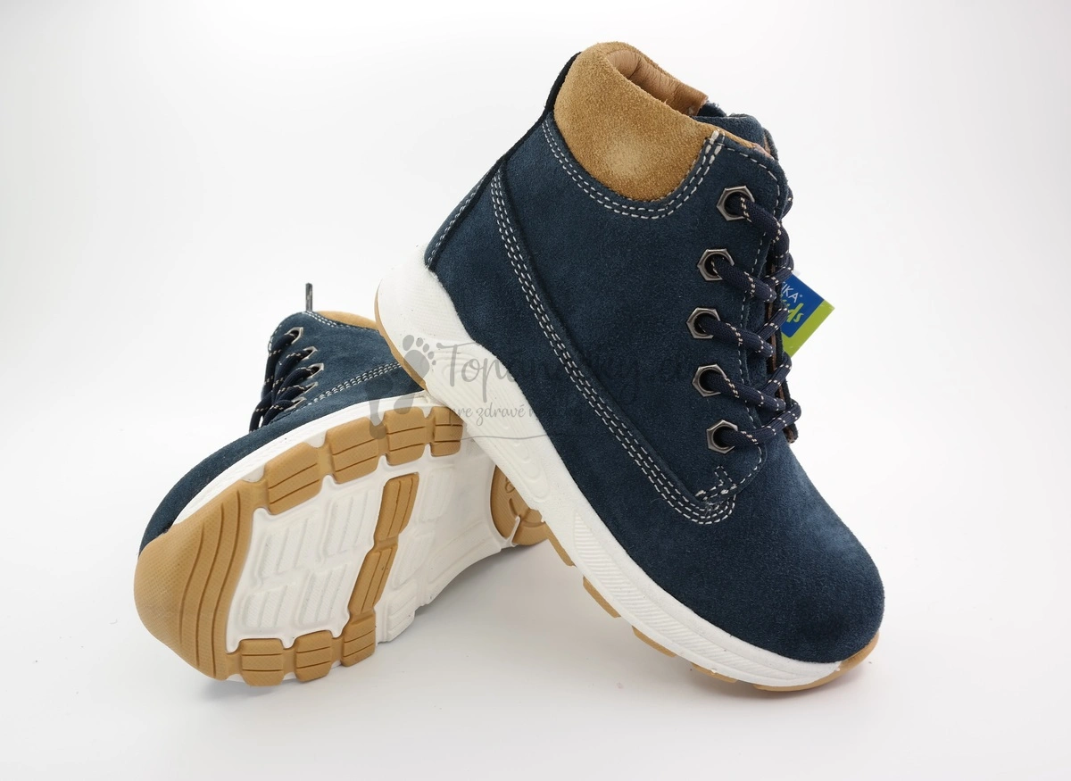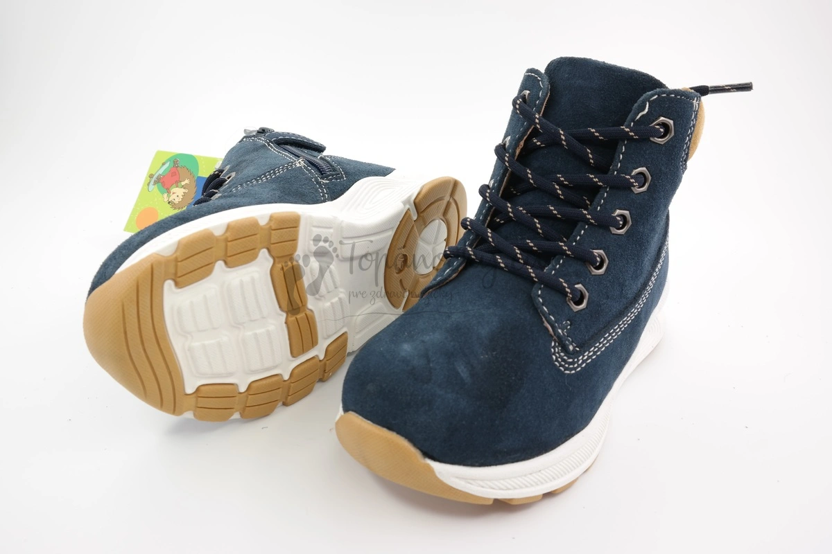 Chlapčenské topánky určené do chladného počasia. Majú podrážku, ktorá je dvojfarebná. Časť, ktorá je v kontakte so zemou je béžovej časti. Zvyšok podrážky je bielej farby. V prednej časti a po celej dĺžke topánky je jemne vyvýšená. Vonkajšia časť topánok je kožená. Koža má tmavomodrú farbui. Okolo členka sa nachádza koza brúsená vo farbe ťavej srsti. Vnútro je vystlané mäkkou huňatou kožušinou. Kožušina na nachádza aj na vložke, ktorá je vyberateľná. Taktiež má prvok na podporu tvorby klenby. Zapínanie je aj na šnurovanie aj na zips, ktorý je na boku topánok. Vďaka tomu je obúvanie topánok značne uľahčené. Topánky sú strihovo o niečo nižšie ako je štandardné pri zimnej obuvi.