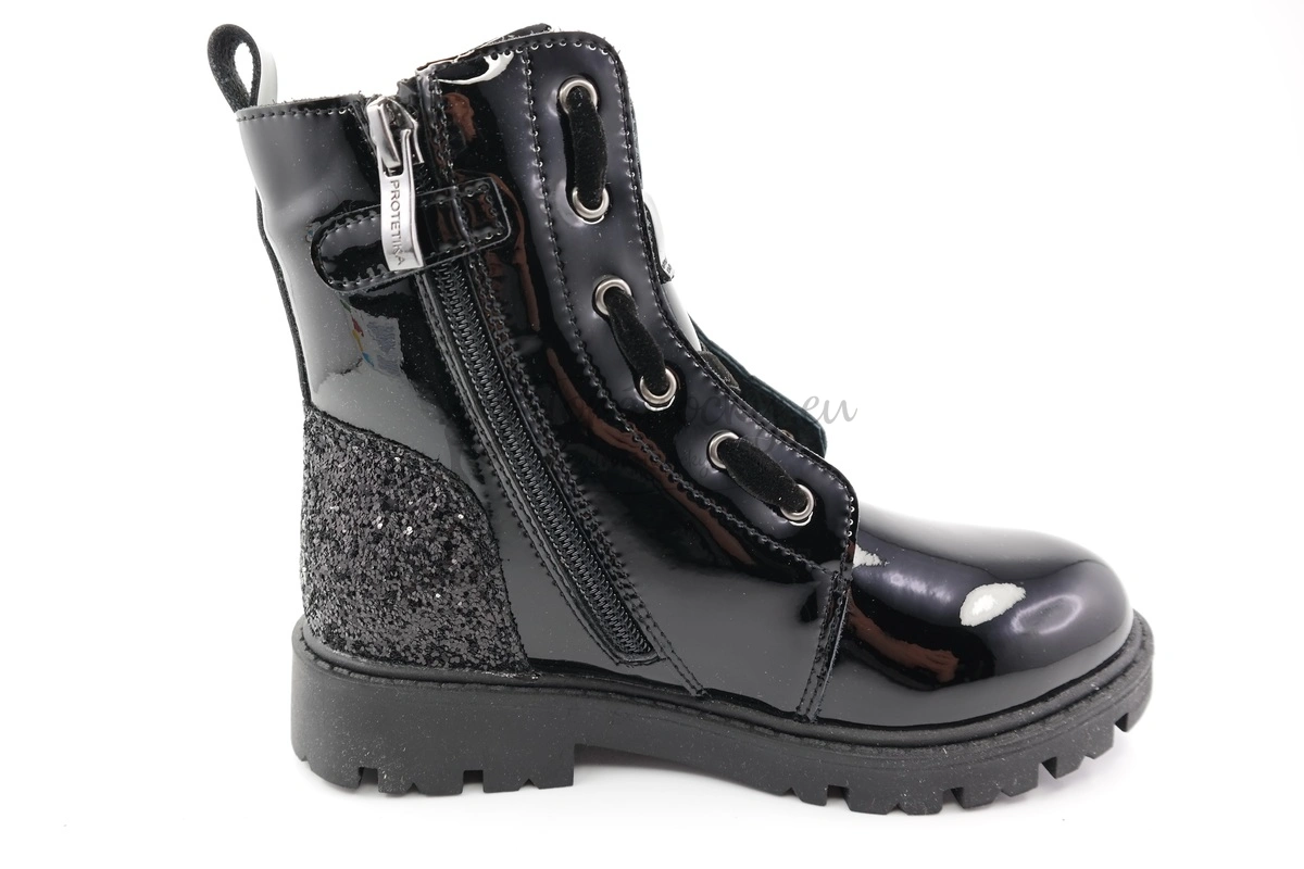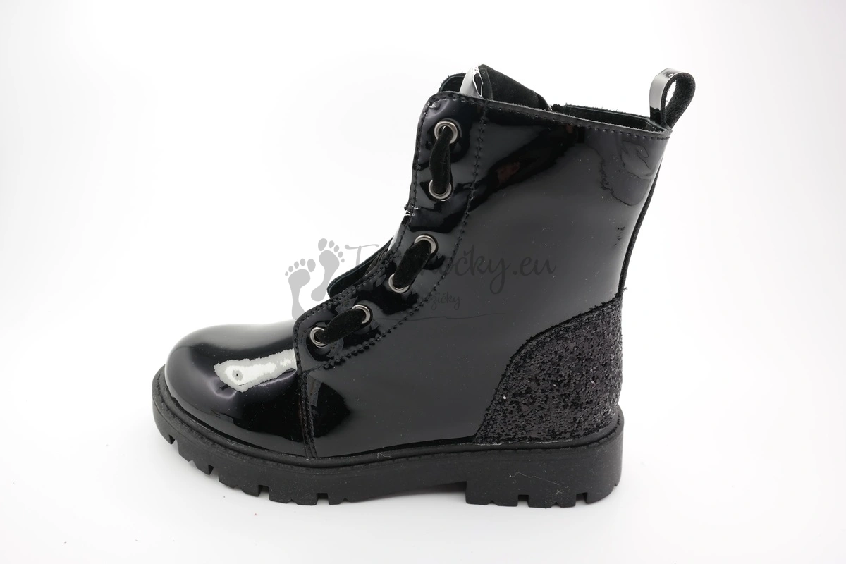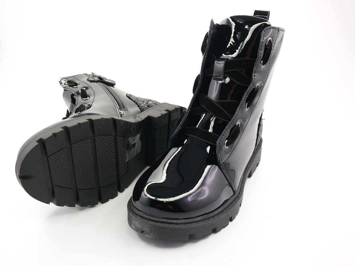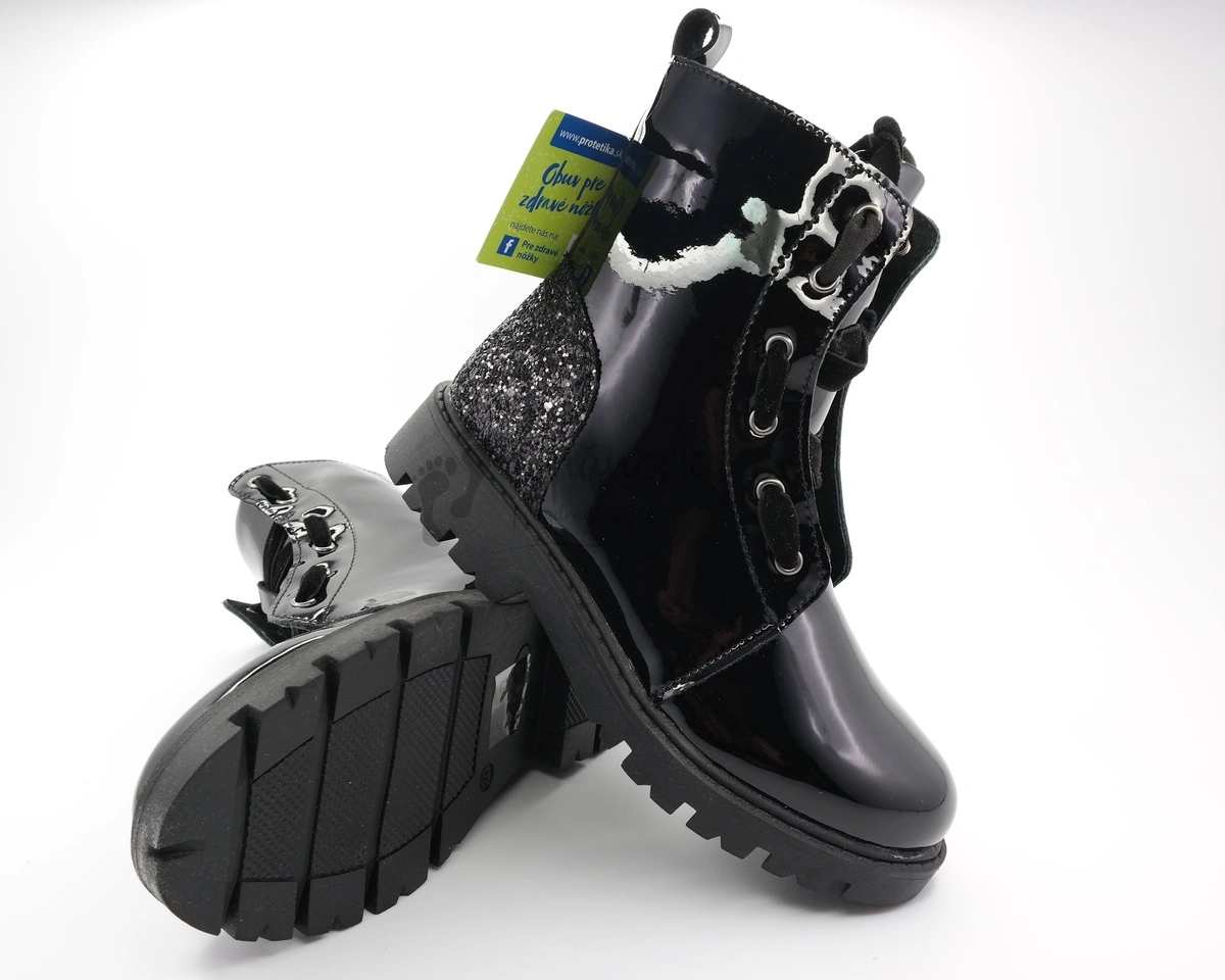 Štýlové zimné topánky, ktoré nie len skvelé vyzerajú, ale aj patrične zahrejú. Podrážka je čiernej farby, má jemný podpätok a je značne rozbrázdená. Zvršok je z leskej čiernej kože. V zadnej časti topánok v oblasti päty sa nachádza aplikácia z čiernych flitrov. Topánky sú na šnurovanie, ale šnúrky sú z čierneho zamatu. Na jednom boku topánok sa nachádza aj zips, vďaka ktorému sa topánky ľahko obúvajú. Vnútro je vystlané čiernou umelou kožušinou. Stielka je vyberateľná, zateplená a má prvok na podporu klenby.