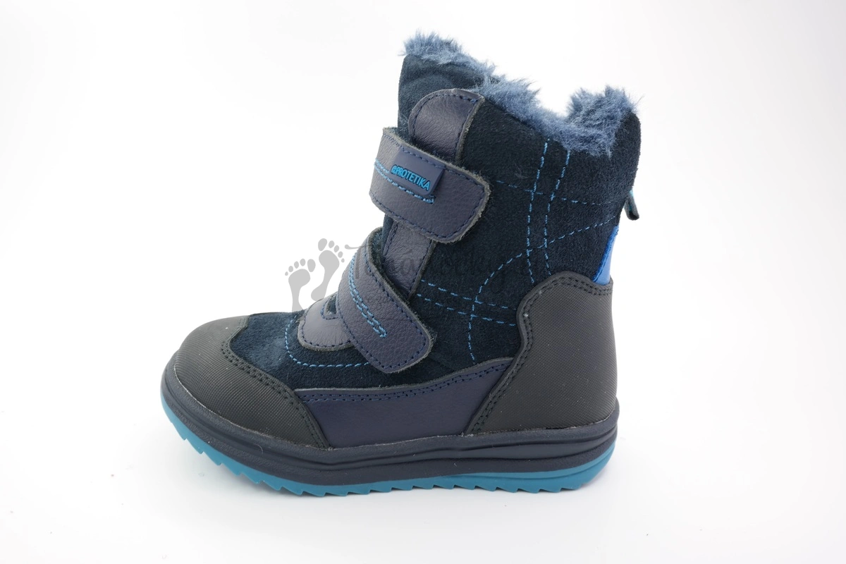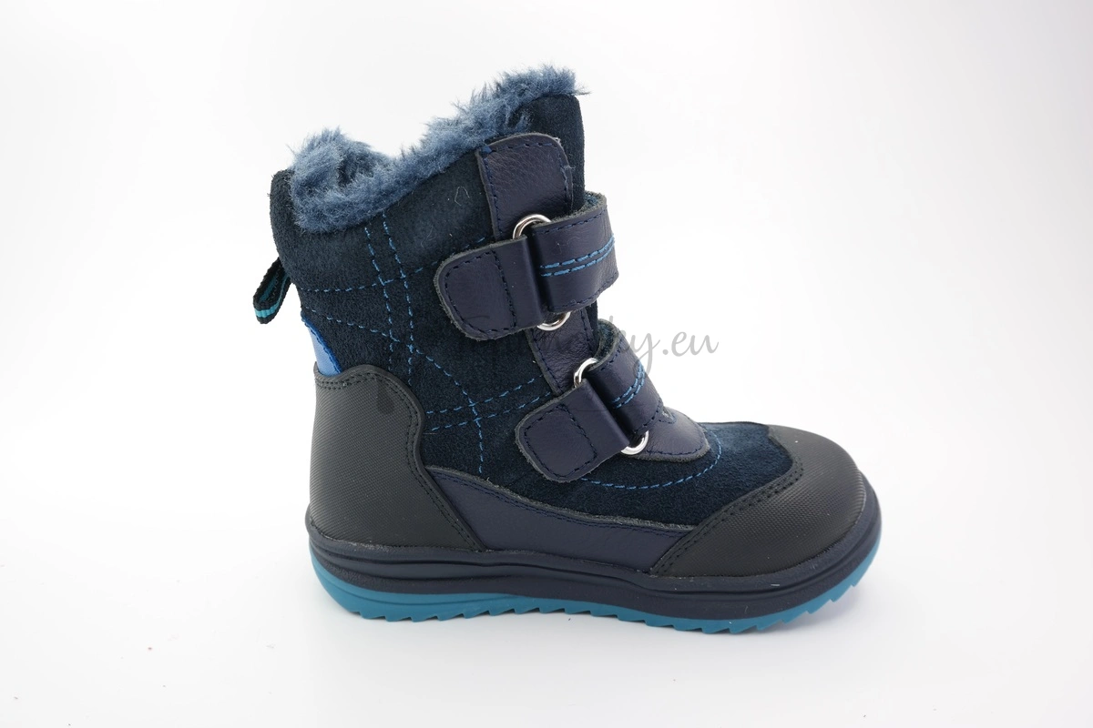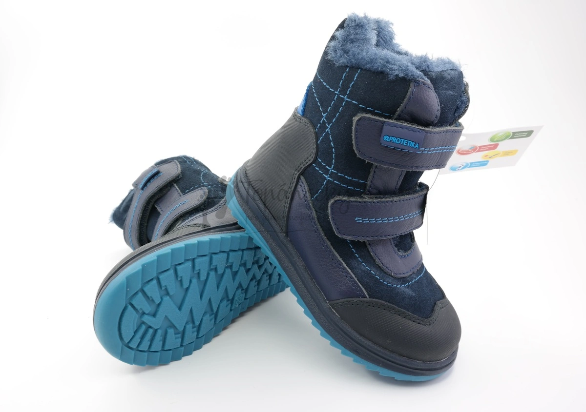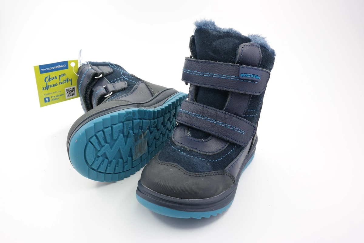 Zimné topánky ktorých dizajn je tvorený kombinovaním rozličných druhov koží v odtieňoch modrej farby. Podrážka je pevná, dostatočne rozbrázdená. Na spodine je tyrkysovej farby a nad tým je lem takmer čiernej farby. V oblasti placov a členka, podrážka prechádza do pogumovanej kože. Koža usňového typu sa nachádza v podobe hrubšieho pásu na oboch bokoch topánok. Usňová koža je aj na prackách a okolo jazyka. Zvyšok je z brúsenej kože. Prešitie je na viacerých miestach tyrkysové. Vložka je látková, zateplená flísom, je vyberataľná a s prvkom na podporu klenby. Vnútro je zateplené umelou kožušinou tiež modrej farby. Kožušina je ako okolo členka. Zapínanie je na dva suché zipsy.