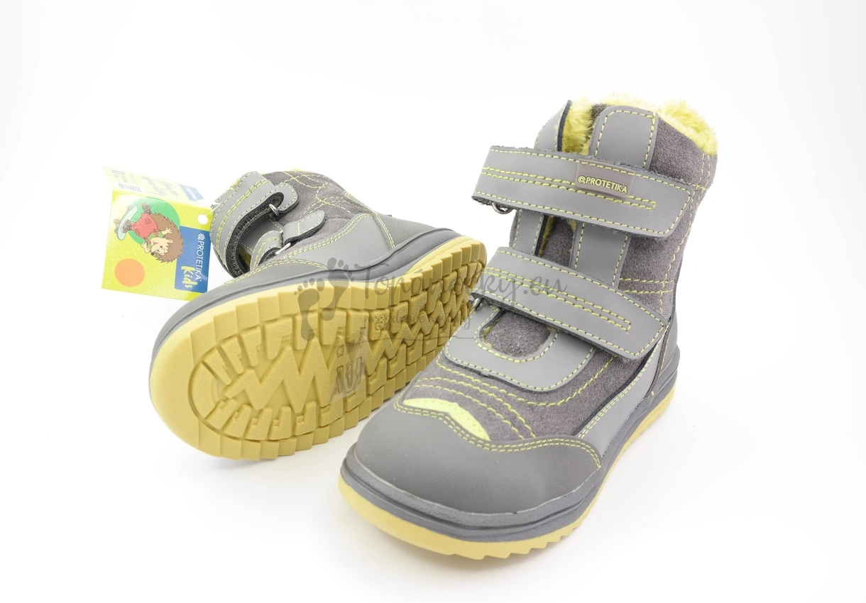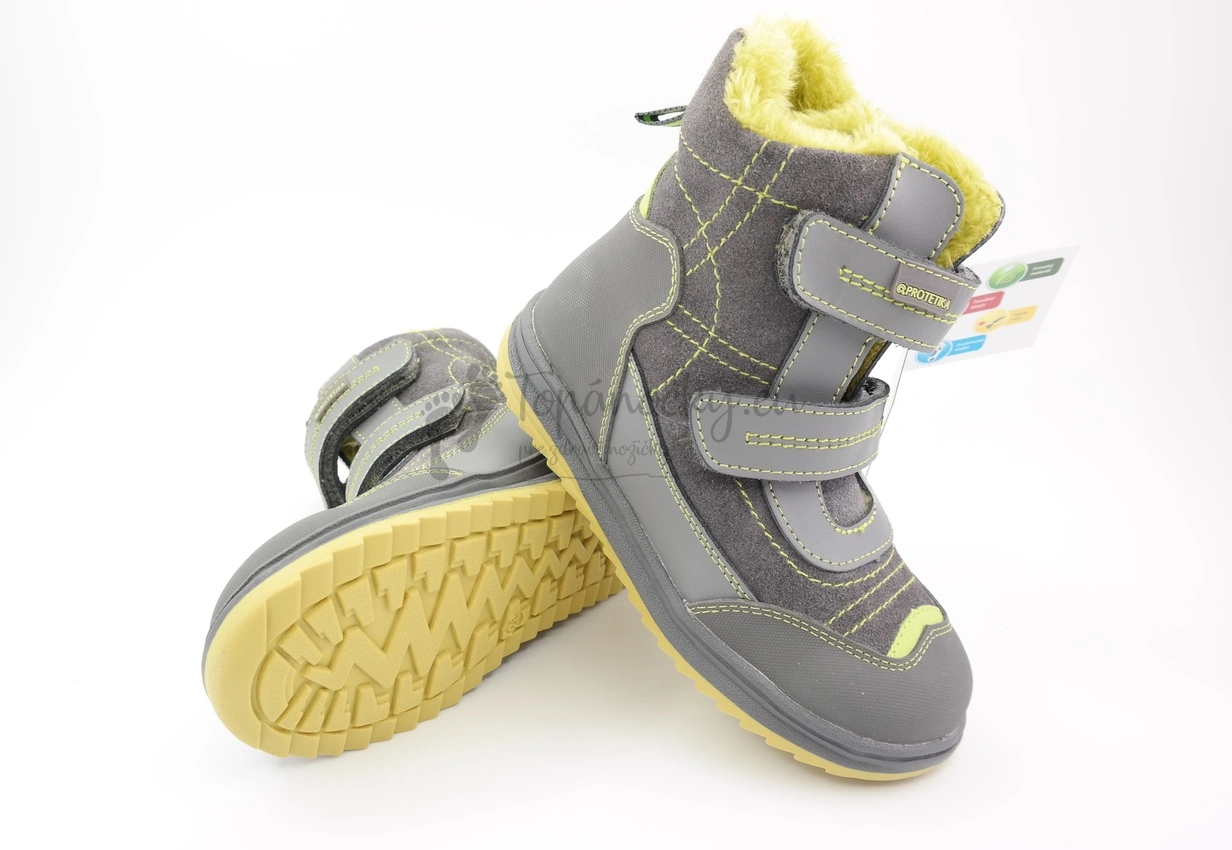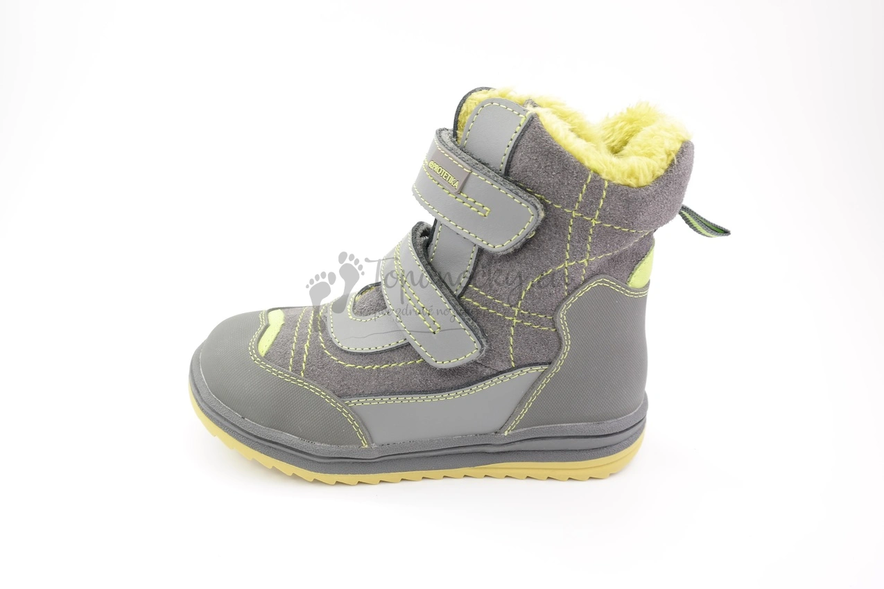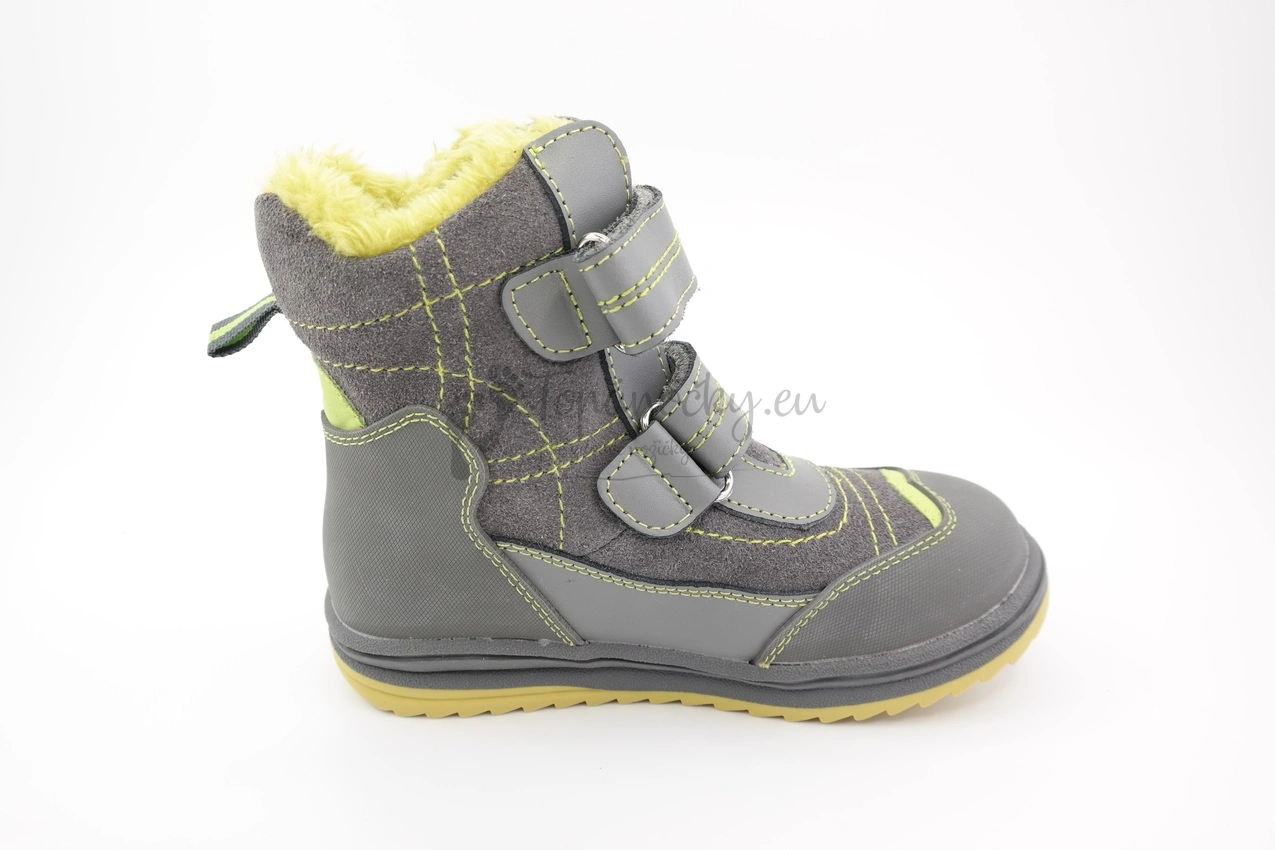 Zimné chlapčenské topánky, ktoré zaujmú už na prvý pohľad vďaka svojmu dizajnu - šedá koža brúsená aj hladká lícová je v kombinácii s jablkovozelenými prvkami. Šedozelená je aj podrážka, ktorá je pevnejšia, ale stále ohybná. Podrážka na okope aj päte plynule prechádza do šedej pogumovanej kože. Zvyšok zvršku je kožený. Prešitie je zelenou niťou. Vnútorná výstelka je z umelej kožušiny, ktorá má taktiež zelenú farbu. Stielka je vyberateľná, s podporou klenby a je zeteplená flisovou látkou. Zapínanie je na dva suchá zipsy.
