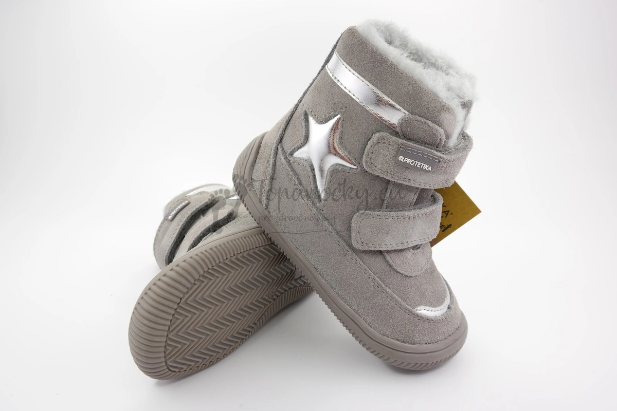 Zimné topánky barefoot strihu, ktoré sú celošedé. Podrážka so stromčekovým vzorom je mäkká a ohybná vo všetkých smeroch. Je vyvýšená v prednej i zadnej časti topánok. Zvršok je z brúsenej kože. Aby topánky nepôsobili tak stroho, nachádzajú sa na nich 4 aplikácie z lesklej striebornej kože. Najvýraznejšou je hviezda, ktorá sa nachádza na jednom boku topánok. Vnútro je zateplené huňatou umelou kožušinou šedej farby. Stielka je taktiež zateplená, rovná a vyberateľná. Zapínanie je na dva suché zipsy.