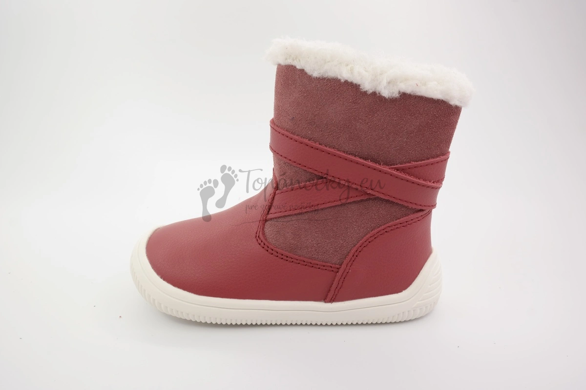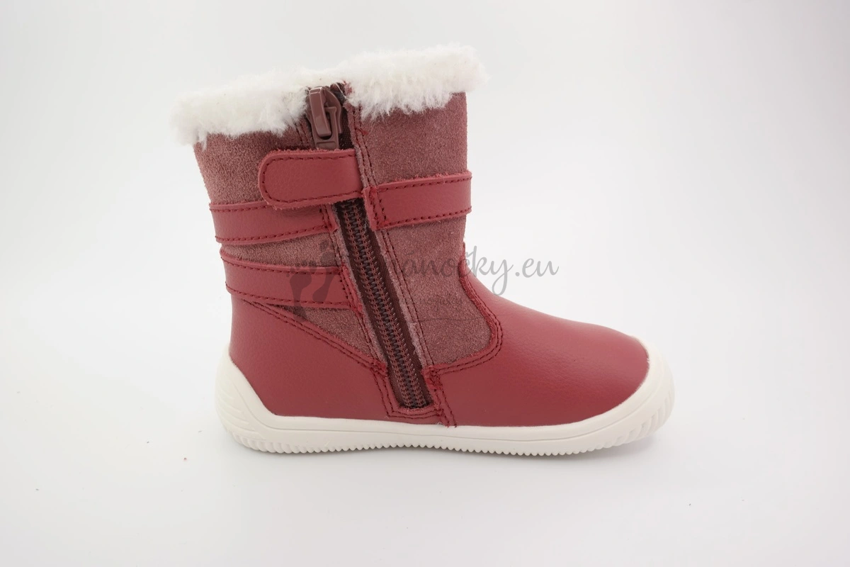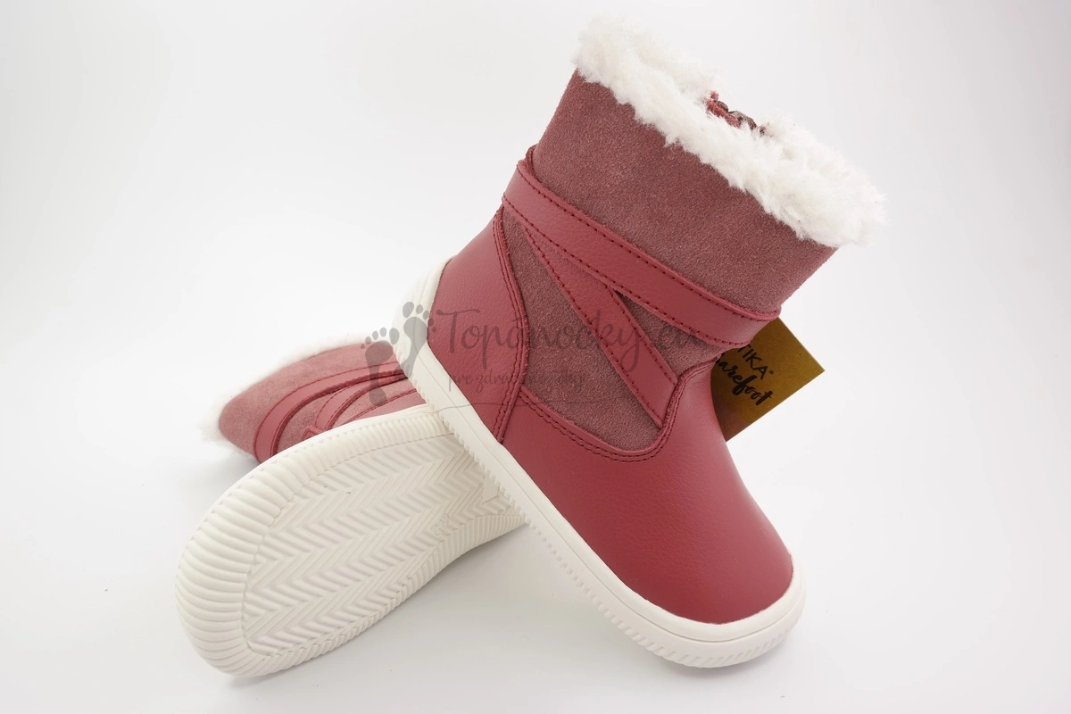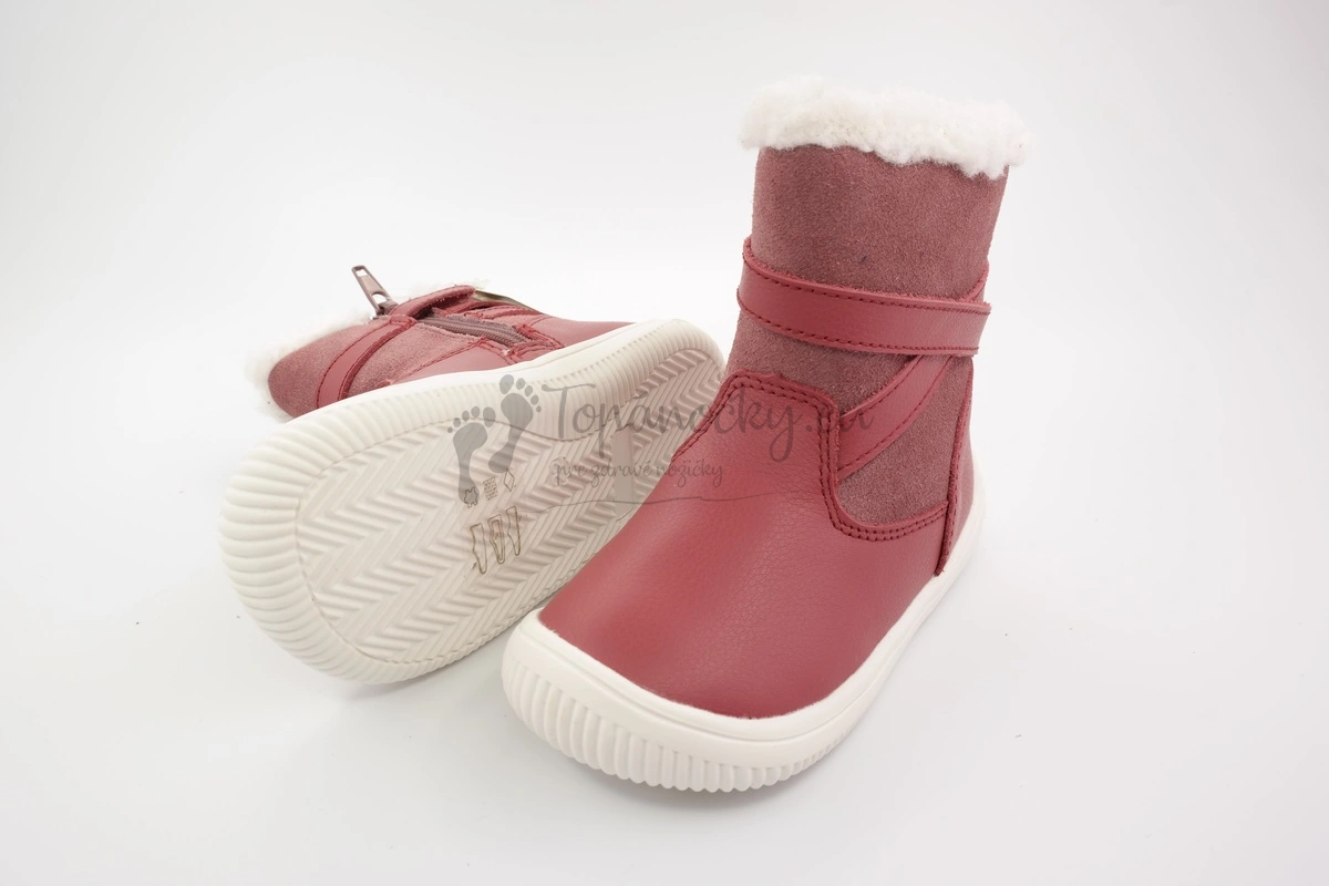 Zimné čižmičky barefootového strihu, ktoré máme v dispozícii v širokej veľkostnej škále. Bielej farby je podrážka so stromčekovým vzorom, ktorá je na okope a na päte jemne vyvýšená. Biela je taktiež aj umelá kožušina, ktorá vystieľa vnútro topánok. Zvršok topánok je vytvorený z dvoch typov kože terakotovej farby. Časť topánok, ktorá je na oblasti palcov, priehlavku a päte je z kože usňového typu a časť, ktorá je od členka vyššie je z brúsenej kože. Na tejto časti sa nachádzajú aj dva pruhy, ktoré sú prekrížene a sú z usňovej kože. Zapínanie je na zips, ktorý sa nachádza na boku topánok. Stielka je látková, zateplená, vyberateľná a rovná.