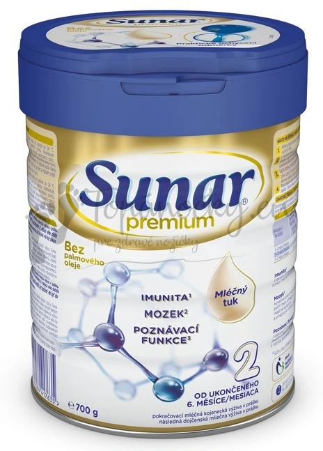 Sunar Premium 2 je následná dojčenská mliečna výživa pre dojčatá od ukončeného 6. do 12. mesiaca. Dojčenie je pre dojčatá najlepším spôsobom výživy. Pokiaľ však dojčenie nie je možné alebo z nejakého dôvodu dojčenie postupne ukončujete, ponúkame dojčenské mlieko, ktoré spĺňa všetky požiadavky na výživu dojčaťa. Sunar Premium 2 je vyrobený z plnotučného mlieka a smotany, ktoré dodávajú mlieku lahodnú chuť, takže ho deti lepšie prijímajú. Plnotučné mlieko a smotana vďaka obsahu mliečneho tuku prispievajú k lepšej vstrebateľnosti vitamínov1 A, D, E, K rozpustných v tukoch. Receptúra Sunar Premium bola vyvíjaná tak, aby bola zložením čo najbližšie k materskému mlieku, a tak poskytla dieťatku všetky dôležité živiny. Sunar sa s láskou stará o detské brušká viac ako 80 rokov. Táto receptúra bola vyvinutá expertmi z Hero Institute for Infant Nutrition, ktorí spolupracujú s poprednými zahraničnými vedeckými odborníkmi na výživu, nemocnicami a univerzitami. Sunar Premium je k dispozícii v praktickej dóze. Balenie v ochrannej atmosfére zaručuje čerstvosť mliečneho prášku, praktická dóza potom jednoduché a presné dávkovanie.
