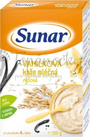Spestrenie jedálneho lístka najmenších s novinkou od značky Sunar! Vanilková kaša mliečna ryžová Sunar kombinuje jemnú chuť, starostlivo vybrané cereálie a vitamíny a minerály pre rozvoj chuti a spestrenie jedálnička dojčiat a malých detí už od ukončeného 4. mesiaca. Vďaka zloženiu s vyváženým obsahom mlieka a prirodzeným obsahom starostlivo vybraných obilnín ponúka vynikajúcu chuť, ľahkú stráviteľnosť a spokojné bruško. Taktiež obsahuje dôležité vitamíny a minerálne látky vrátane vápnika a vitamínu D. Vyrobené z vysokokvalitných a prísne kontrolovaných obilnín a ďalších surovín bez použitia konzervačných látok a farbív. Sunar Vanilková kaša mliečna ryžová je skvelým obohatením jedálnička pri prechode na zmiešanú stravu!
